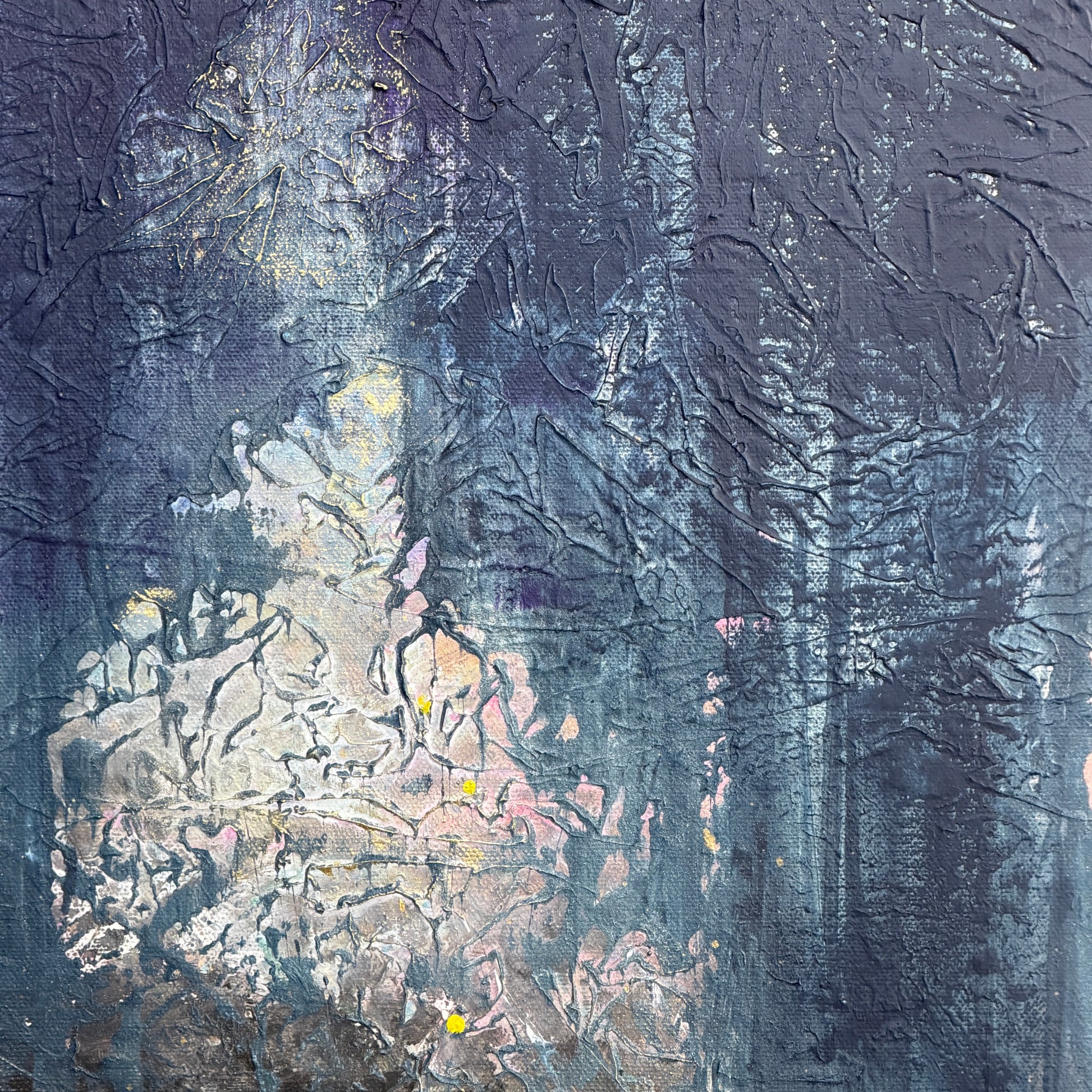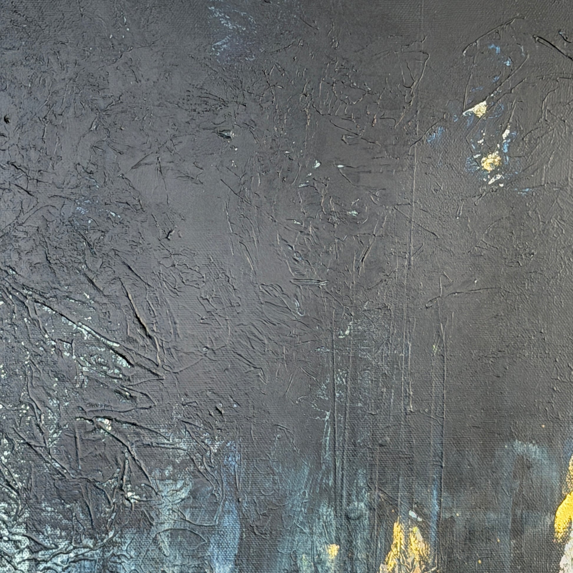 Die versunkenen Lichter, die aus den Schichten des Dunkels aufsteigen, wirken wie Erinnerungen an ein inneres Leuchten, das nie verloren ging. Sie rufen den Betrachter dazu auf, sich zu erinnern: an die eigene Herkunft aus Licht, an die verborgene Kraft, die in allen Schatten wohnt. In den fein strukturierten Oberflächen scheint sich ein kosmisches Geflüster zu verbergen, eine Ahnung davon, dass jeder Moment mit etwas Größerem verbunden ist.