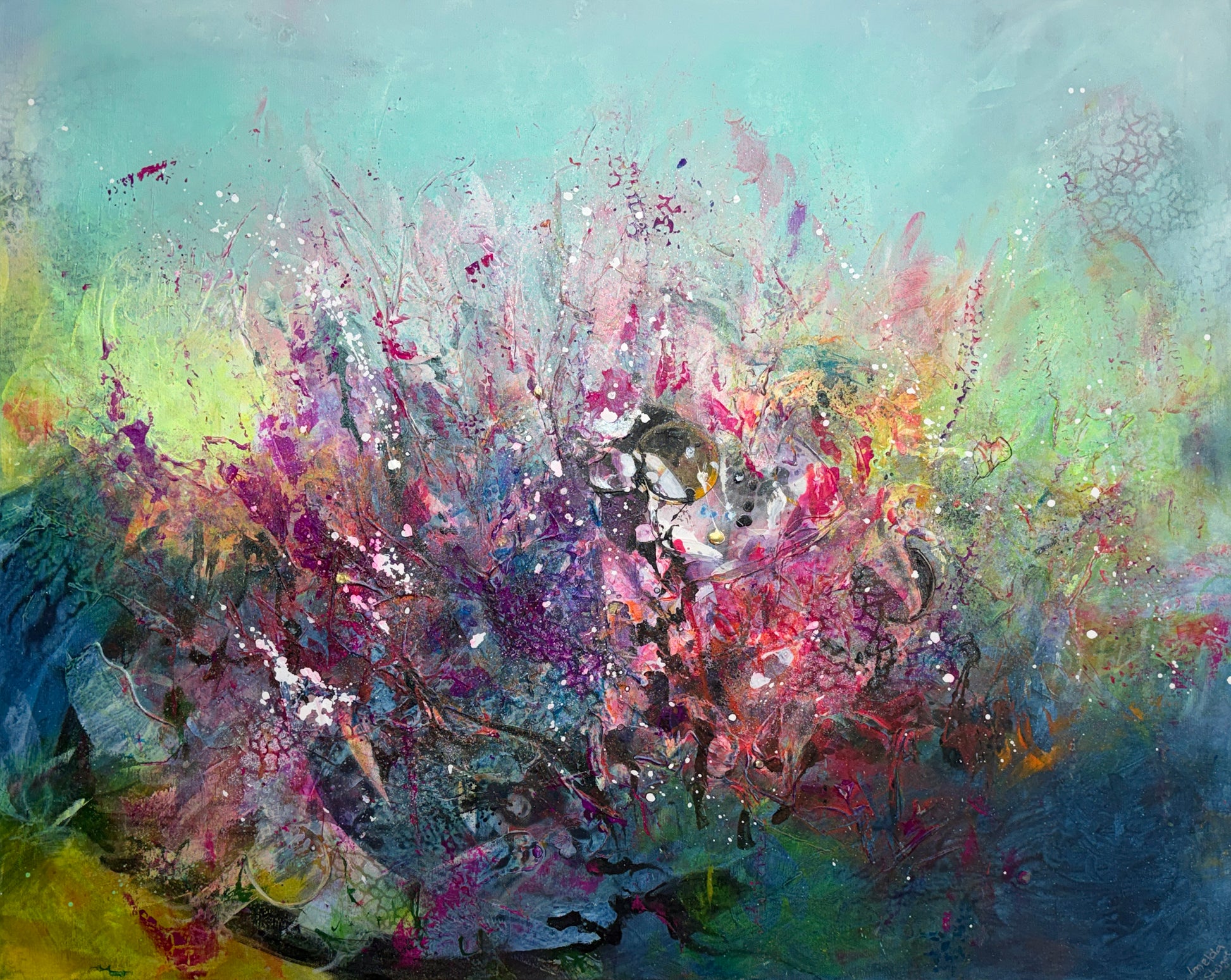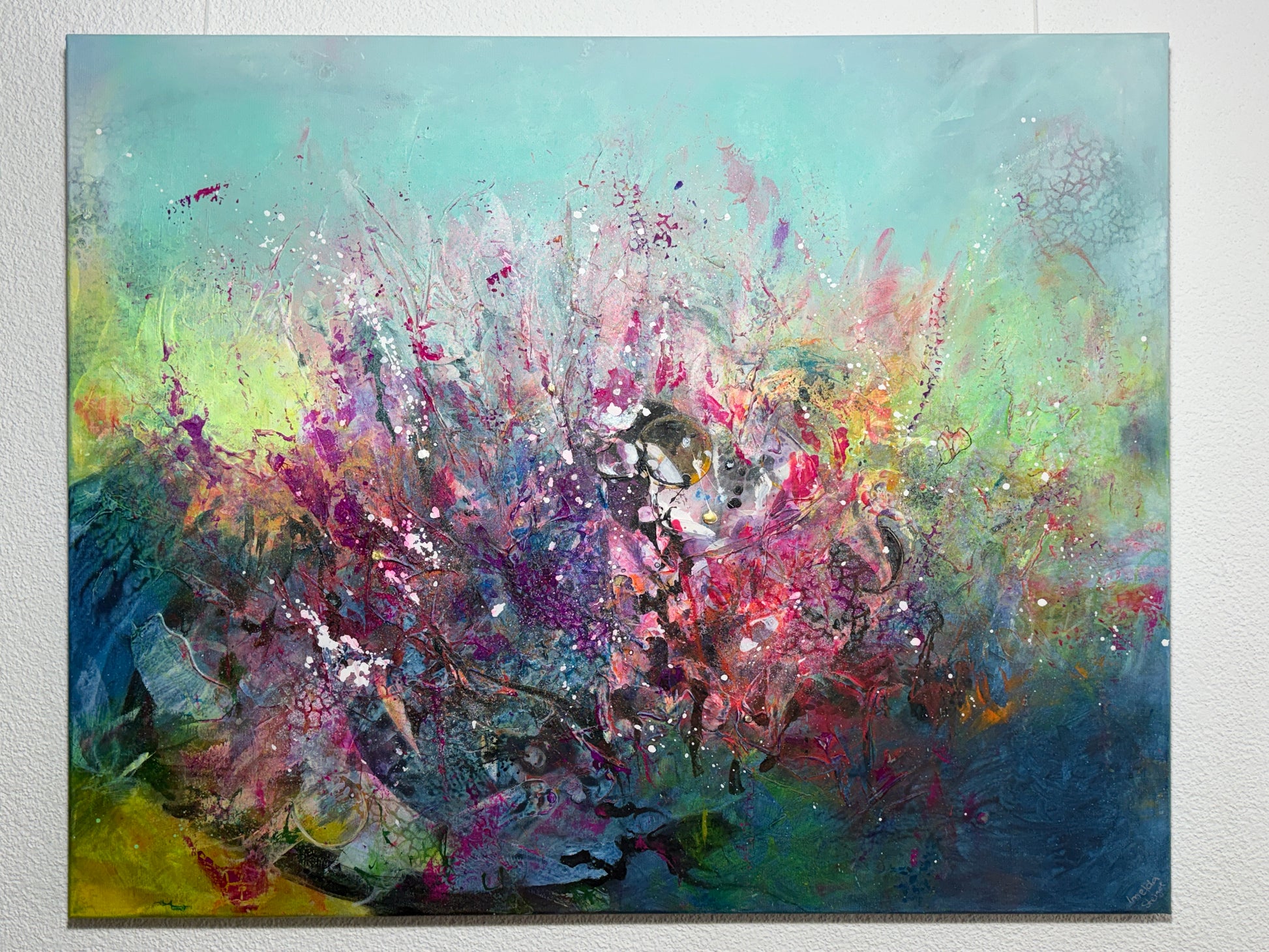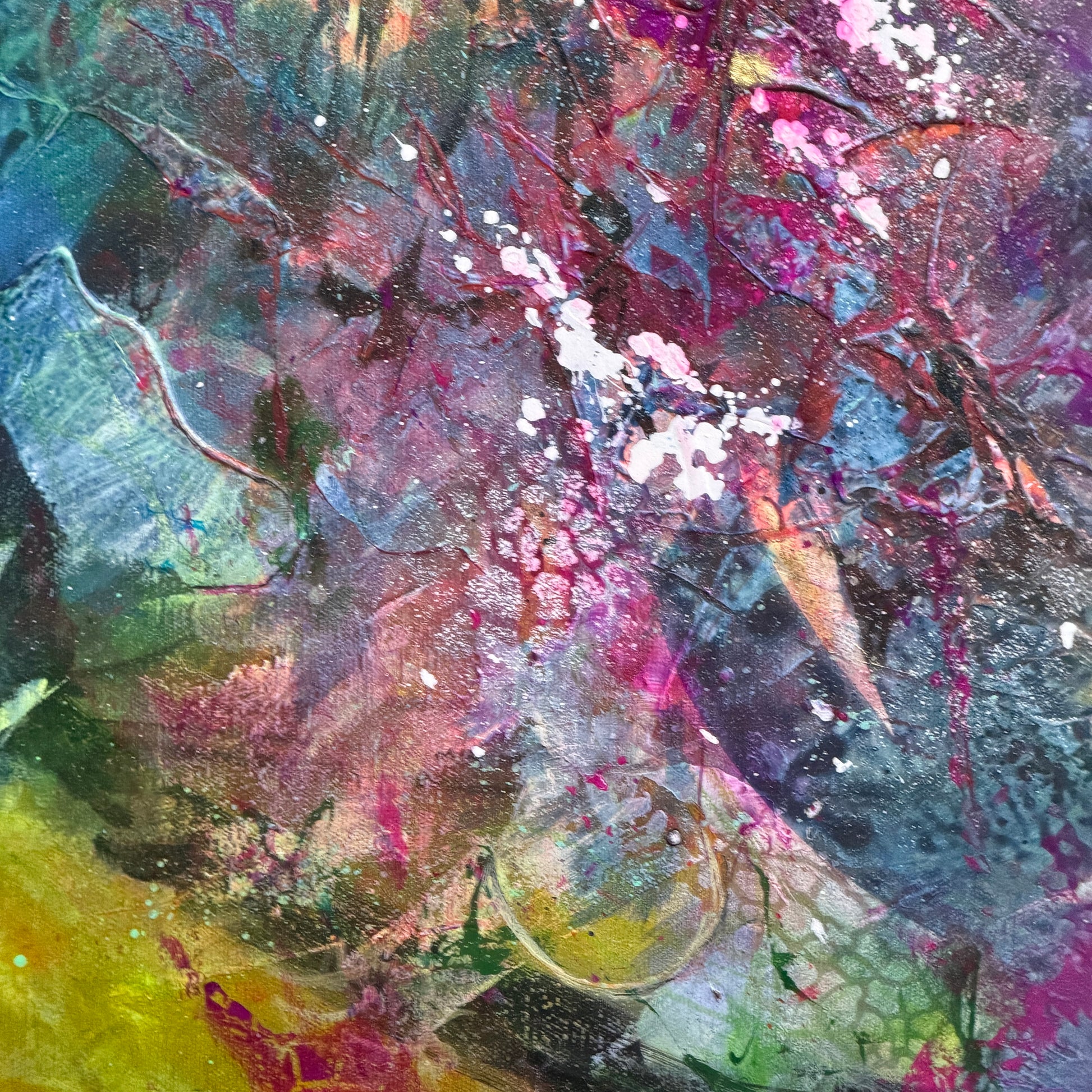 Was zunächst wie eine Explosion aus Blüten, Funken und farbigem Nebel erscheint, entpuppt sich bei genauerem Hinsehen als ein Ort des Übergangs: ein Raum, in dem Energie Form annimmt und wieder vergeht, in dem Farben miteinander flüstern und sich zu flüssigen Gestalten verweben.