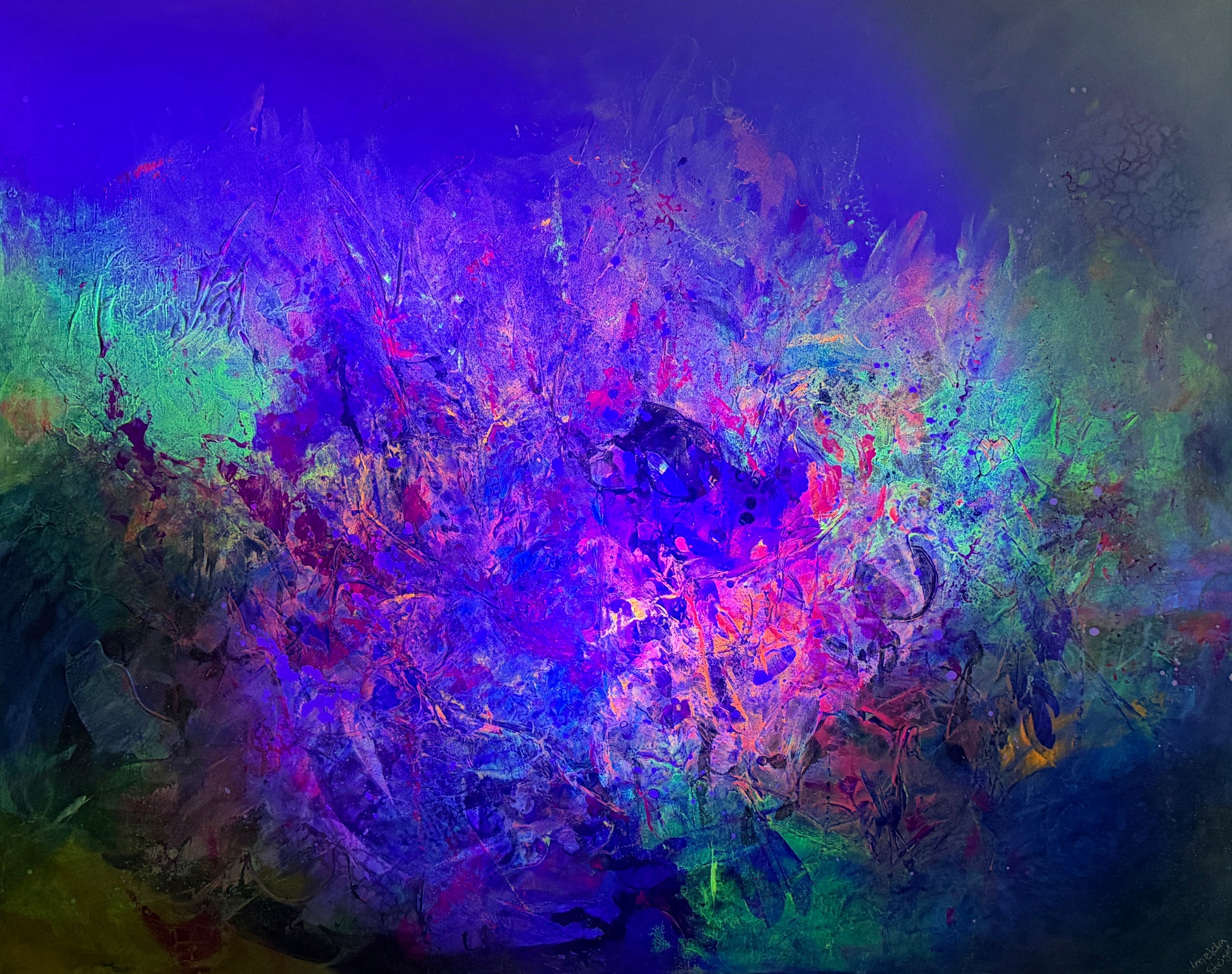 Unter Normallicht wirkt die Komposition wie ein zartes Erwachen – ein leiser Aufruhr der Elemente, die sich aus der Tiefe des Bildes ans Licht tasten. Doch im Schwarzlicht entfaltet sie ihr verborgenes Herz: Linien beginnen zu glühen, Pigmente schimmern wie Sternenstaub, und die unsichtbare Welt tritt hervor, als hätte das Bild selbst eine Seele, die nur im Dunkel ihren wahren Namen spricht.