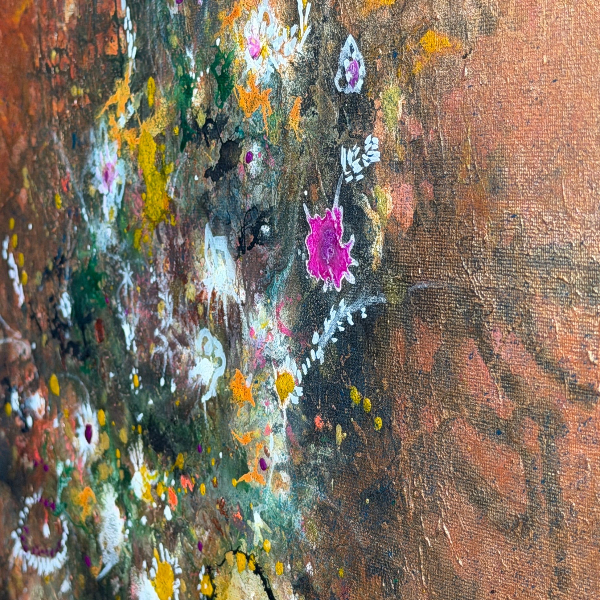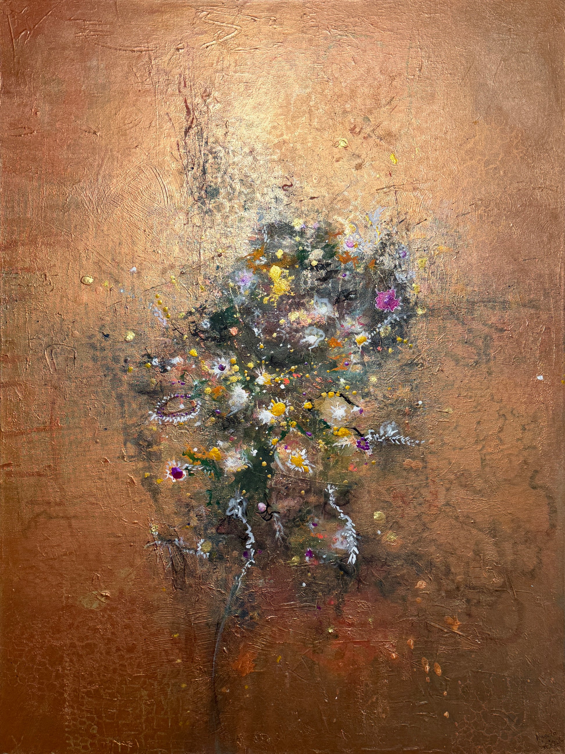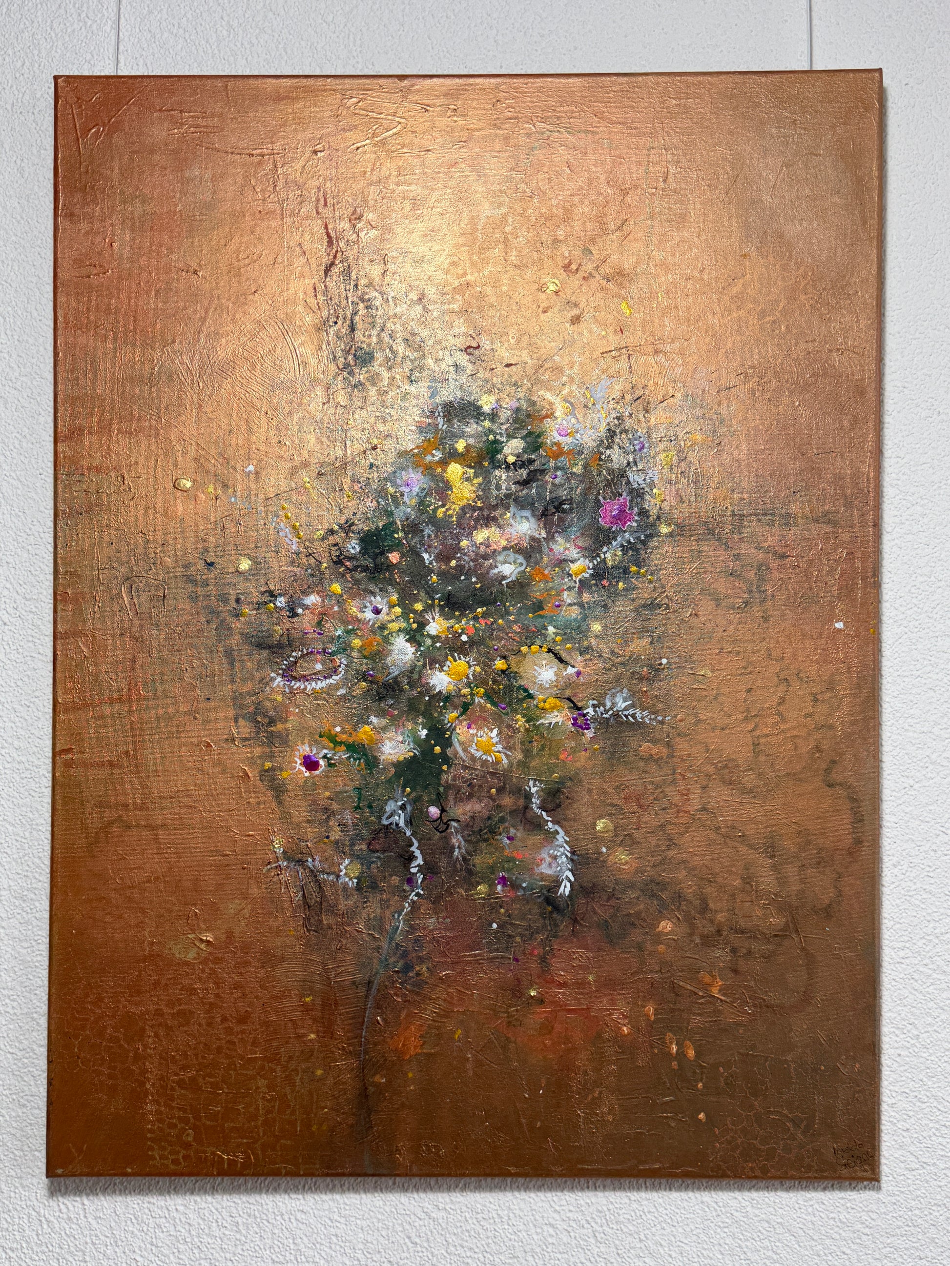 Aus einer warm schimmernden Tiefe wächst eine fragile Blütenform empor – nicht laut, nicht fordernd, sondern still und voller Würde. Die Farben wirken, als hätten sie Zeit in sich aufgenommen: Goldene Nuancen, erdige Töne und zarte Lichtpunkte erzählen von Erinnerung, Vergänglichkeit und dem kostbaren Moment dazwischen.
