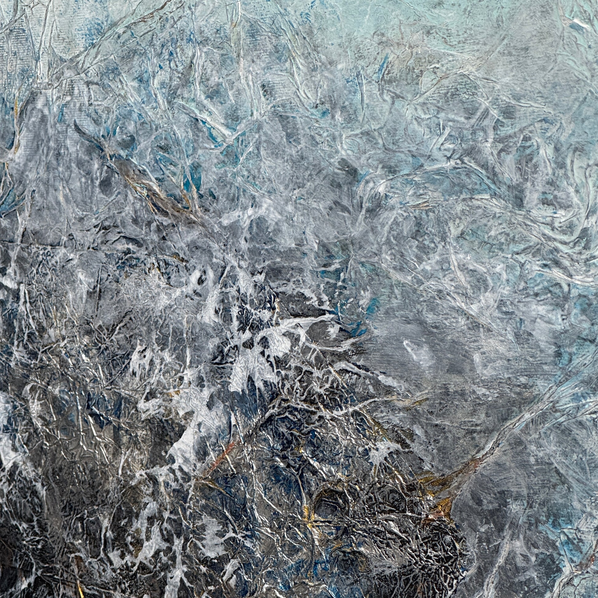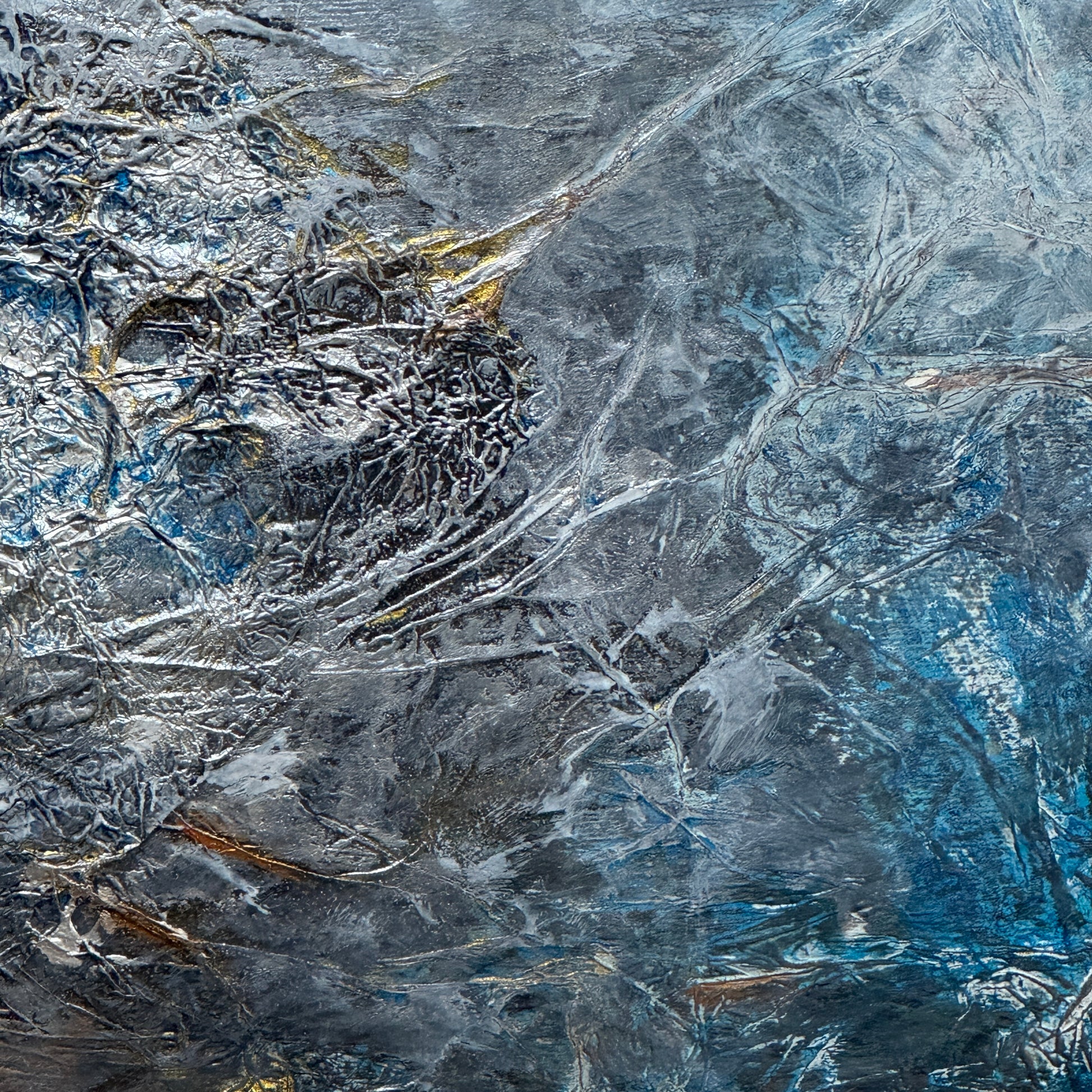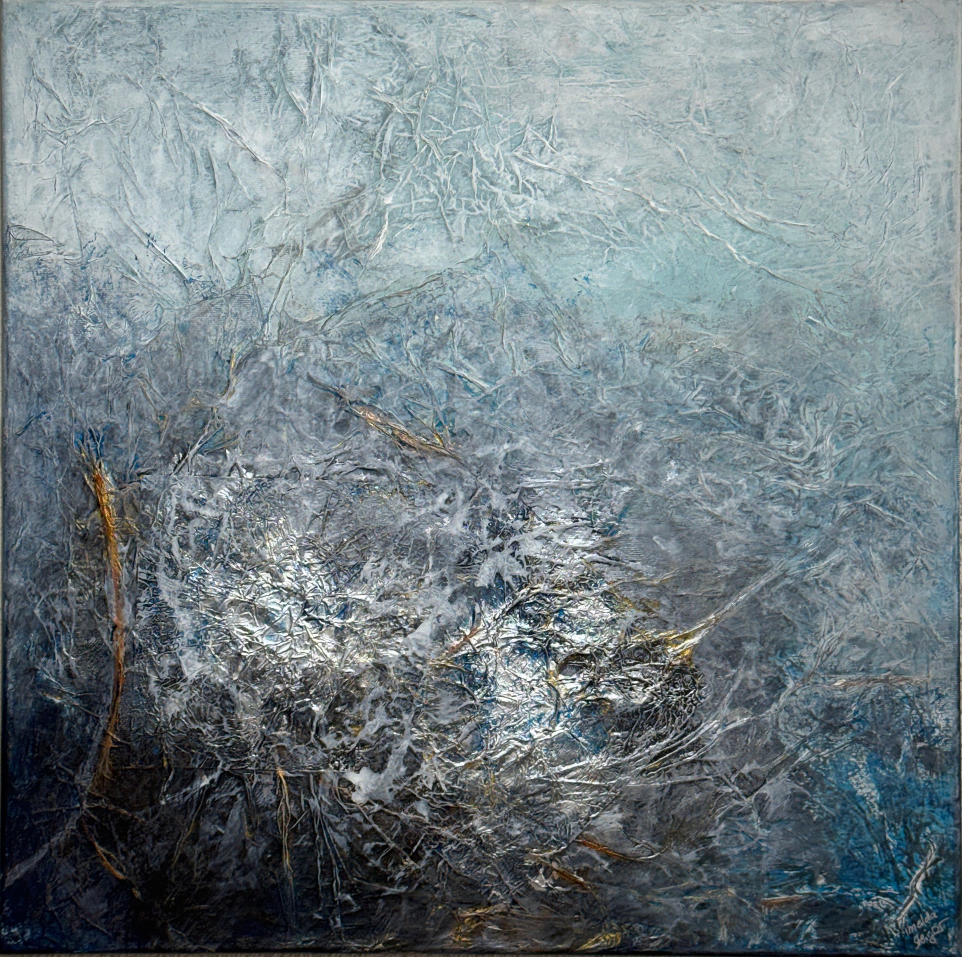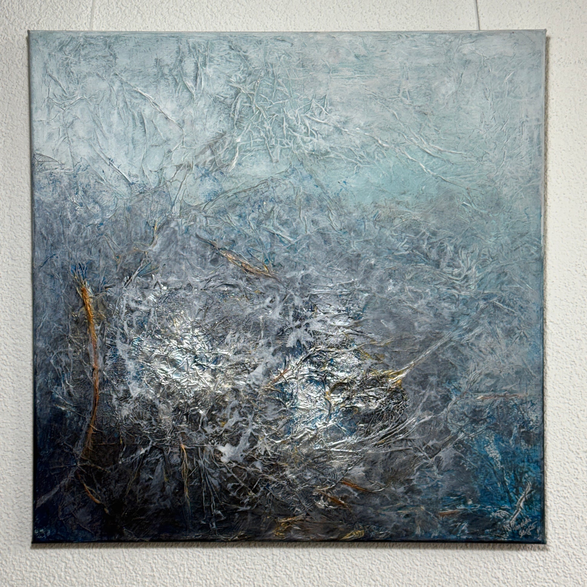 Dieses Werk entführt den Betrachter in eine stille, fast magische Welt, in der Zeit und Raum für einen Augenblick stillzustehen scheinen. Die zarten, eisblauen und silbergrauen Strukturen erinnern an gefrorene Landschaften, an zarte Eiskristalle, die im ersten Morgenlicht schimmern.