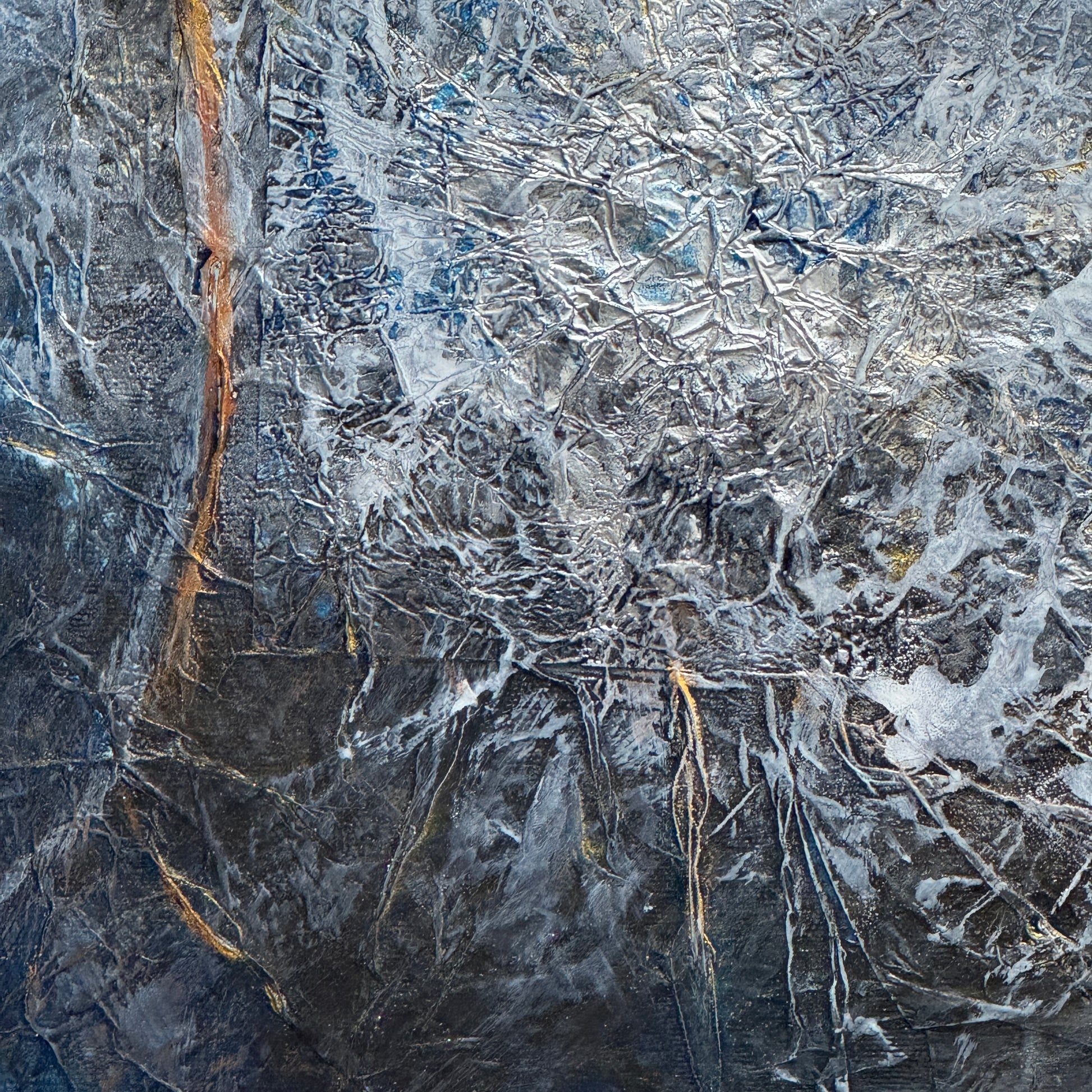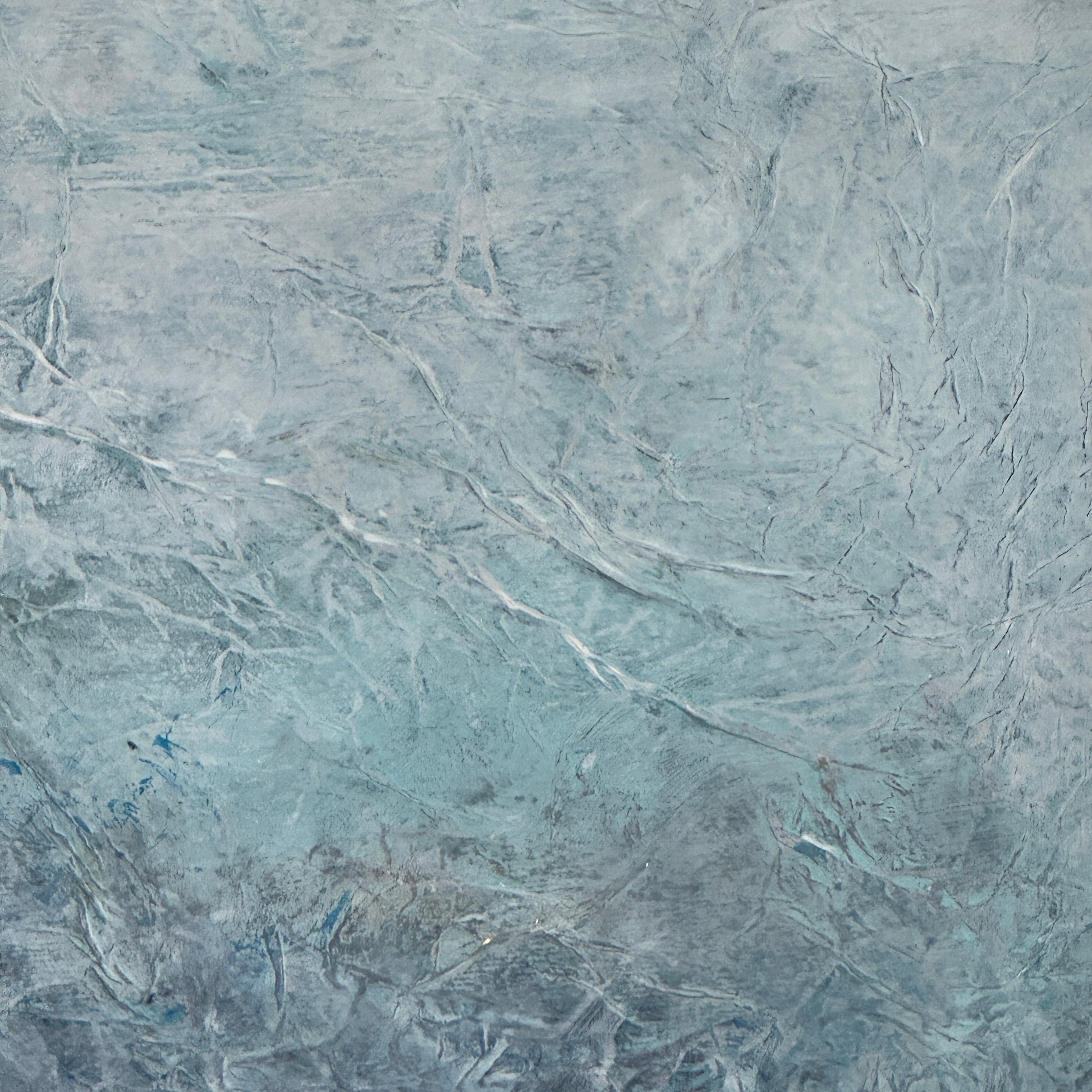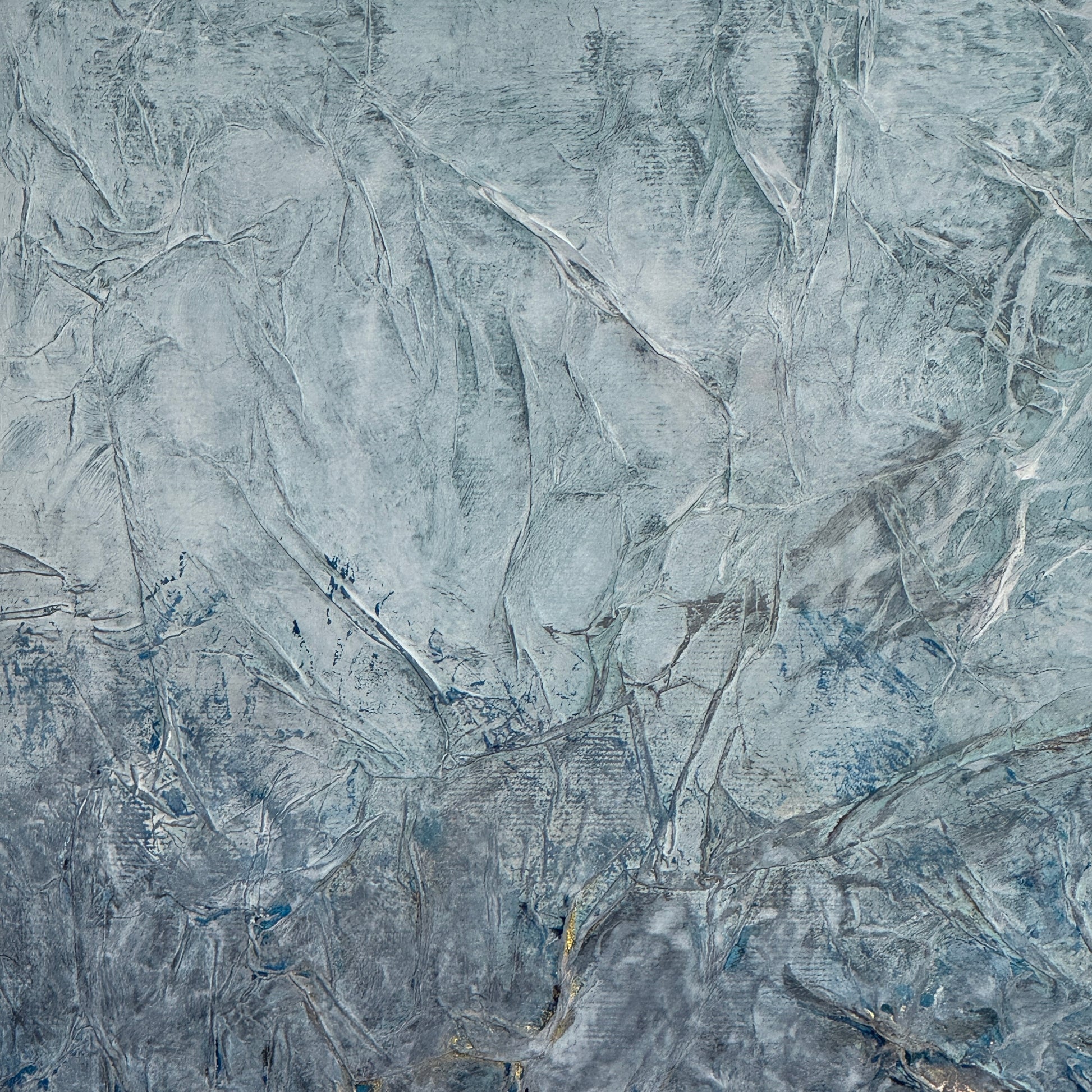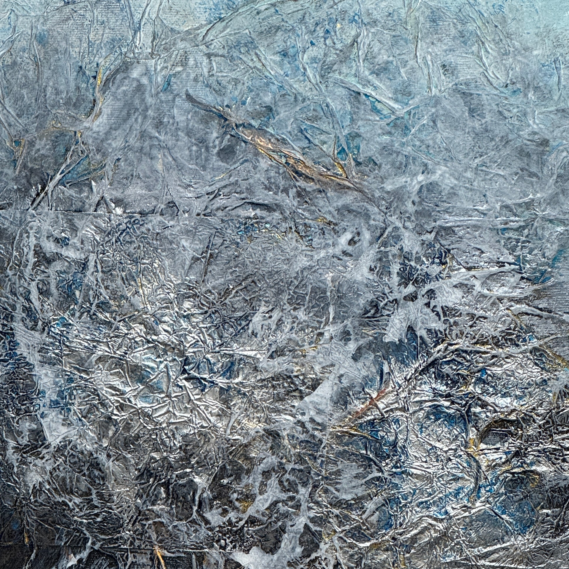 Dieses Werk entführt den Betrachter in eine stille, fast magische Welt, in der Zeit und Raum für einen Augenblick stillzustehen scheinen. Die zarten, eisblauen und silbergrauen Strukturen erinnern an gefrorene Landschaften, an zarte Eiskristalle, die im ersten Morgenlicht schimmern.