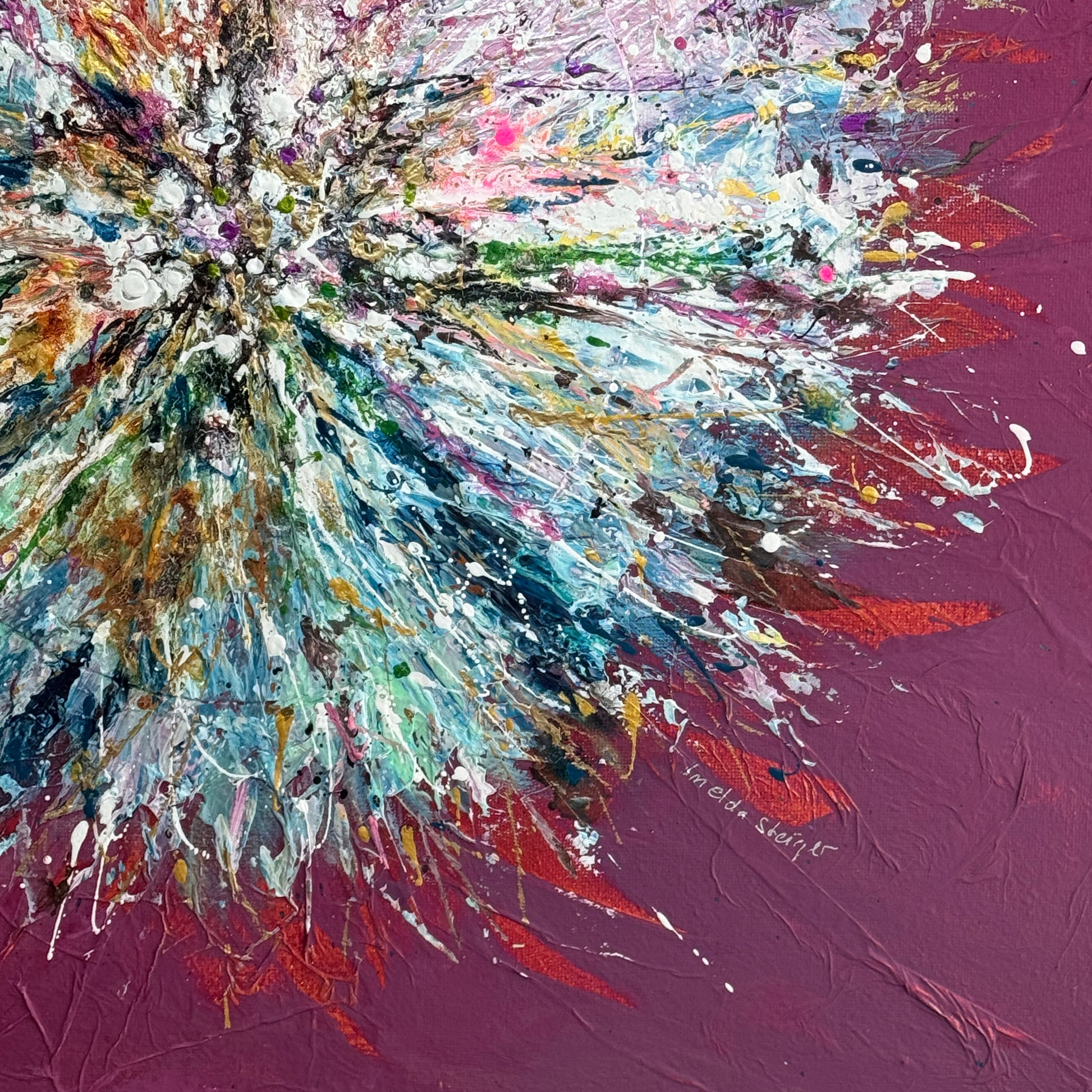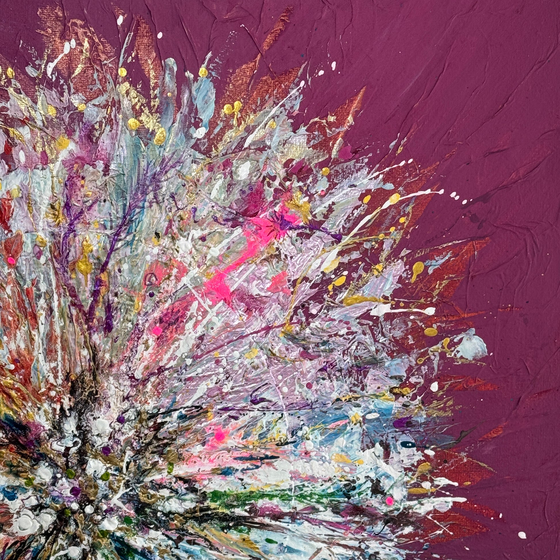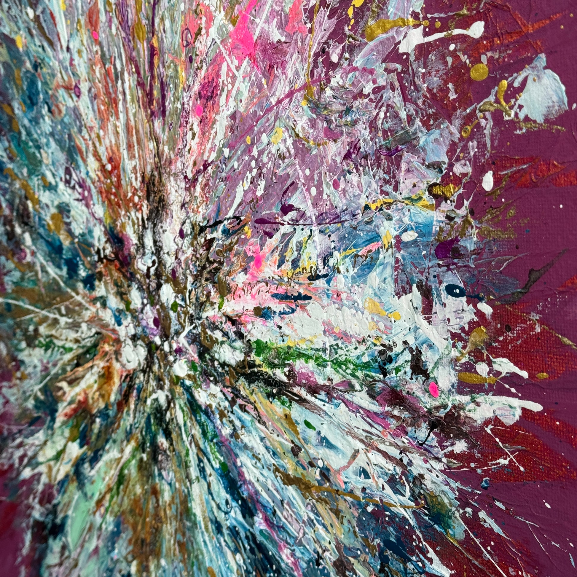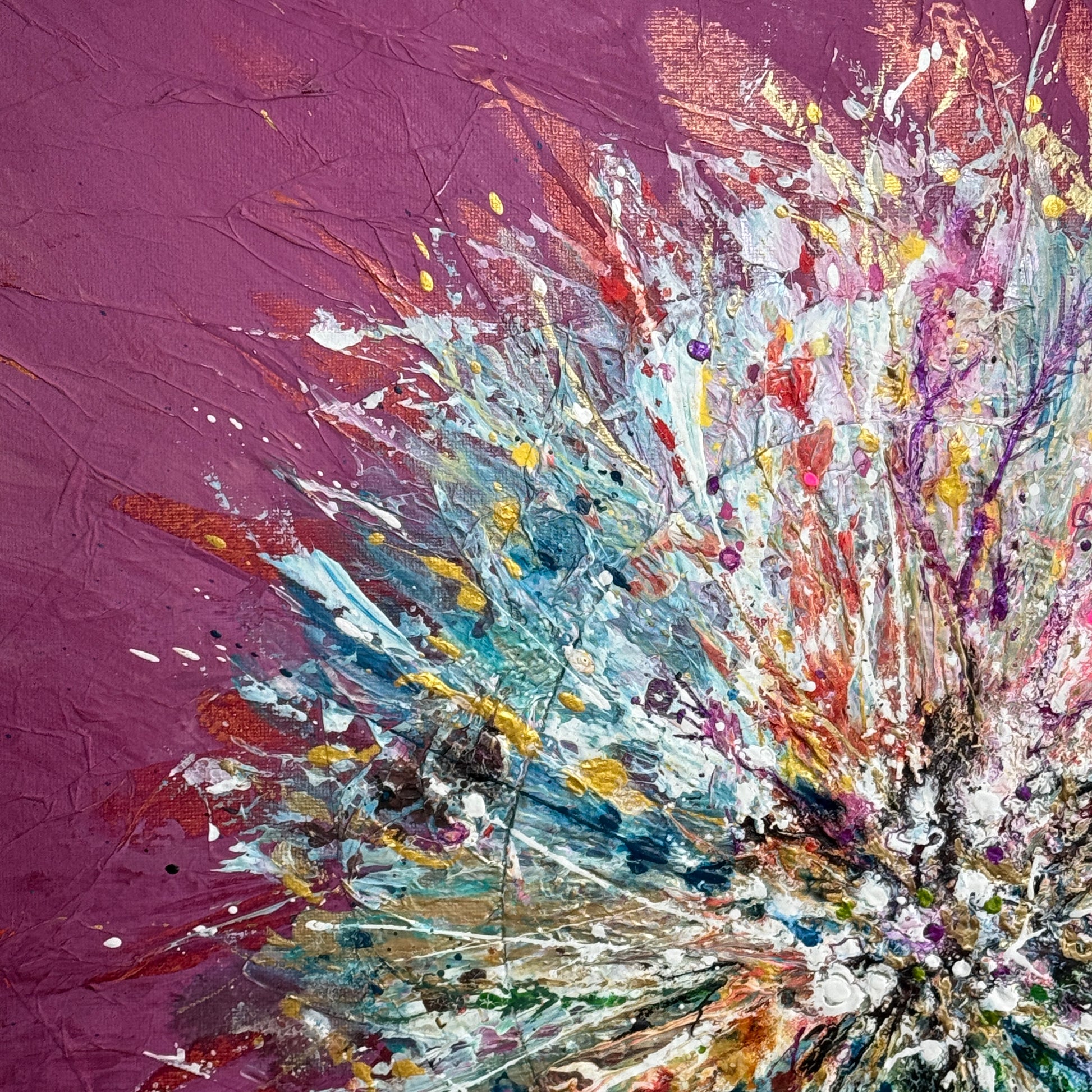 Aus der Stille des violetten Grundes erhebt sich ein Moment reiner Schöpfungskraft. In spontanen Bewegungen, fast wie ein Tanz, fanden die Farben ihren Weg auf die Leinwand ein Wirbel aus Licht, Emotion und Energie. Jede Farbschicht erzählt von einem Funken Inspiration, von Chaos, das sich in Harmonie verwandelt.