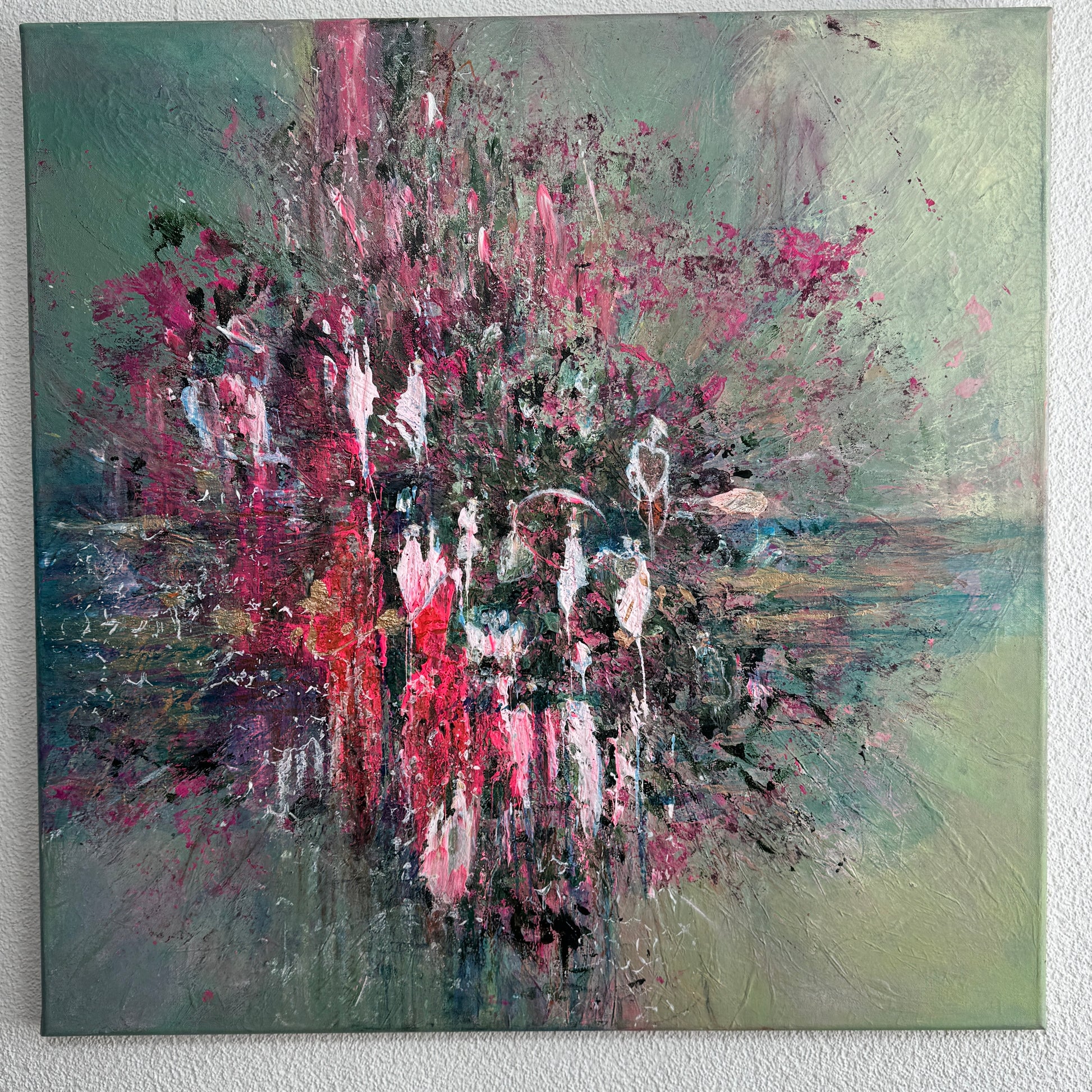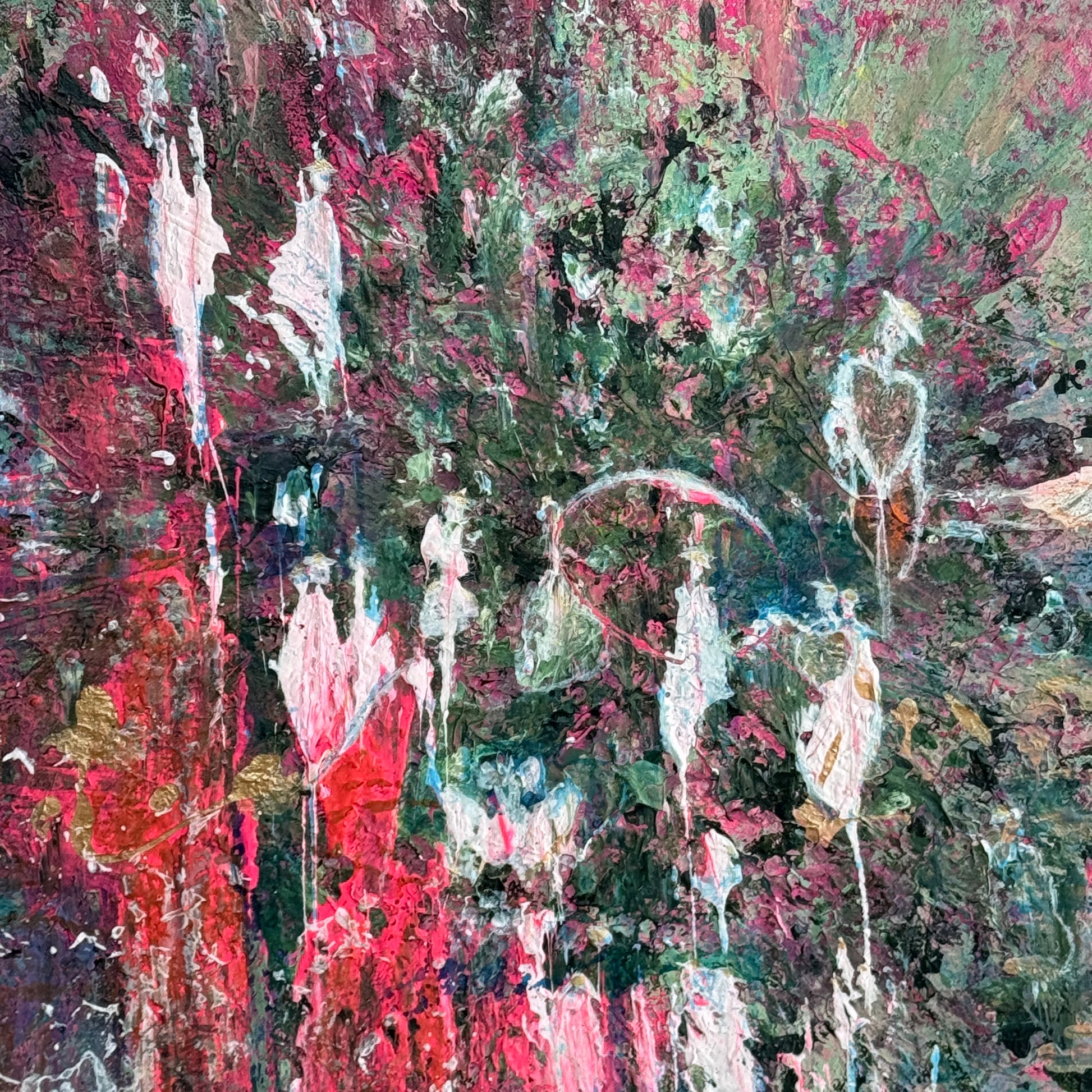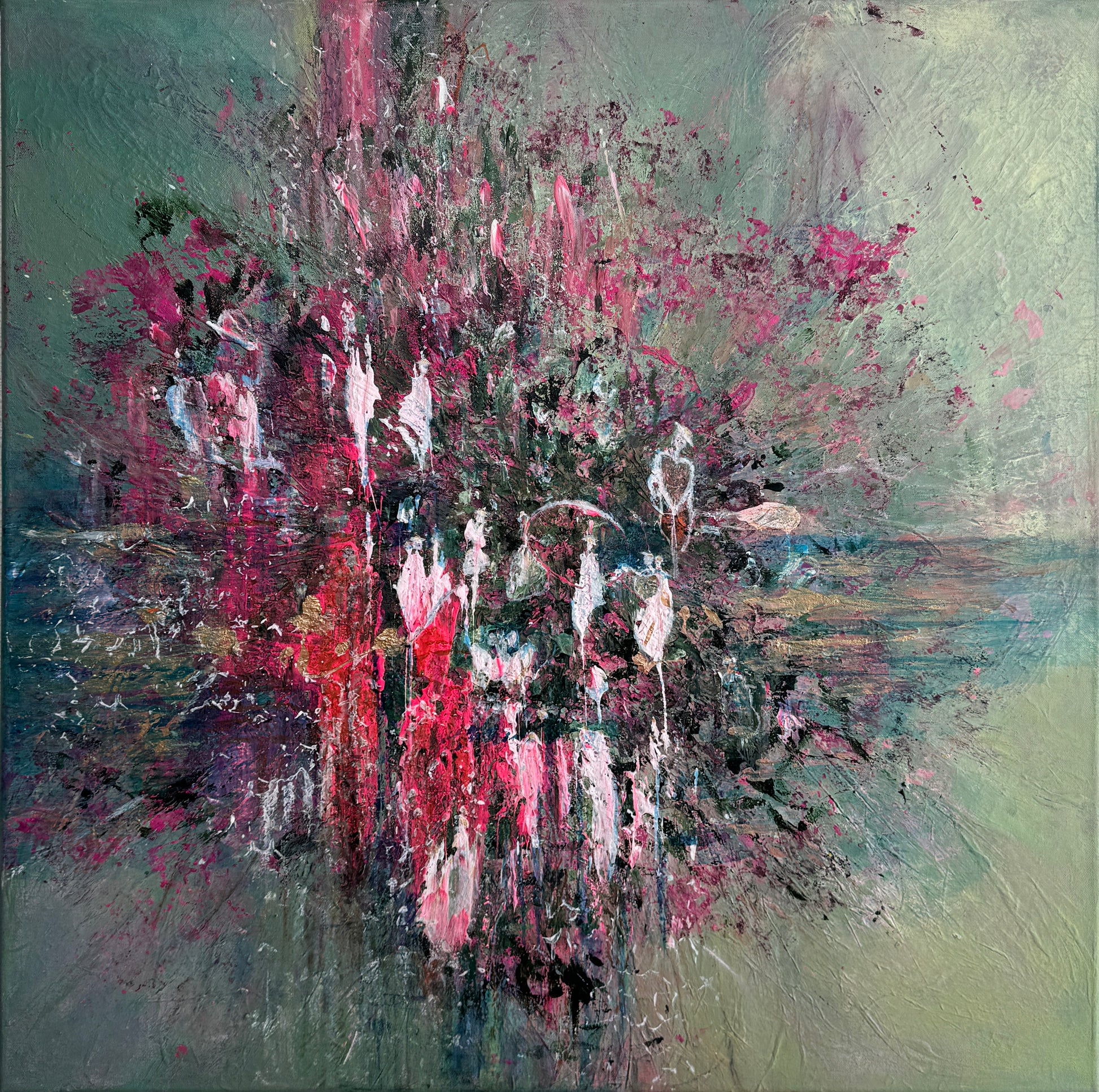 Zarte Rosa- und kräftige Rottöne entfalten sich vor einem sanften, nebelhaften Hintergrund wie tanzende Blütenblätter im Wind. Die Farben wirbeln ineinander, verschmelzen zu einem lebendigen Spiel aus Bewegung und Emotion.