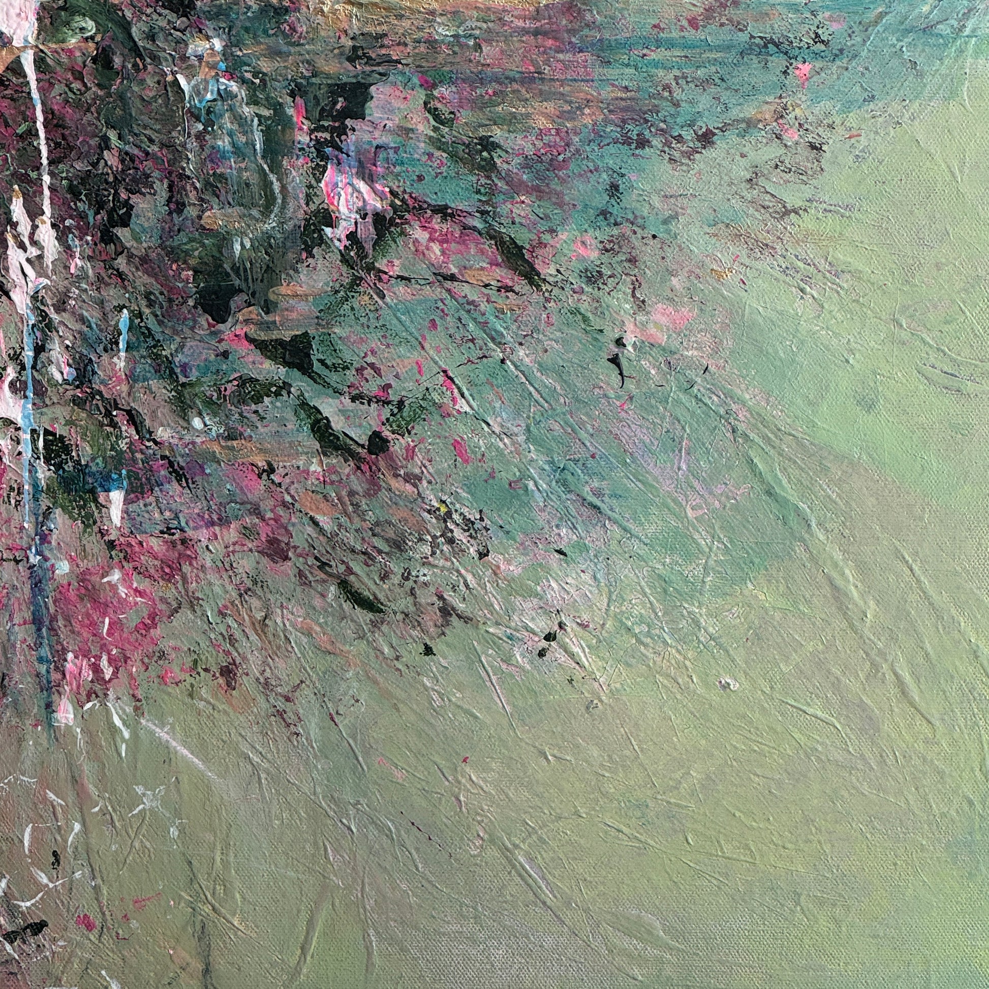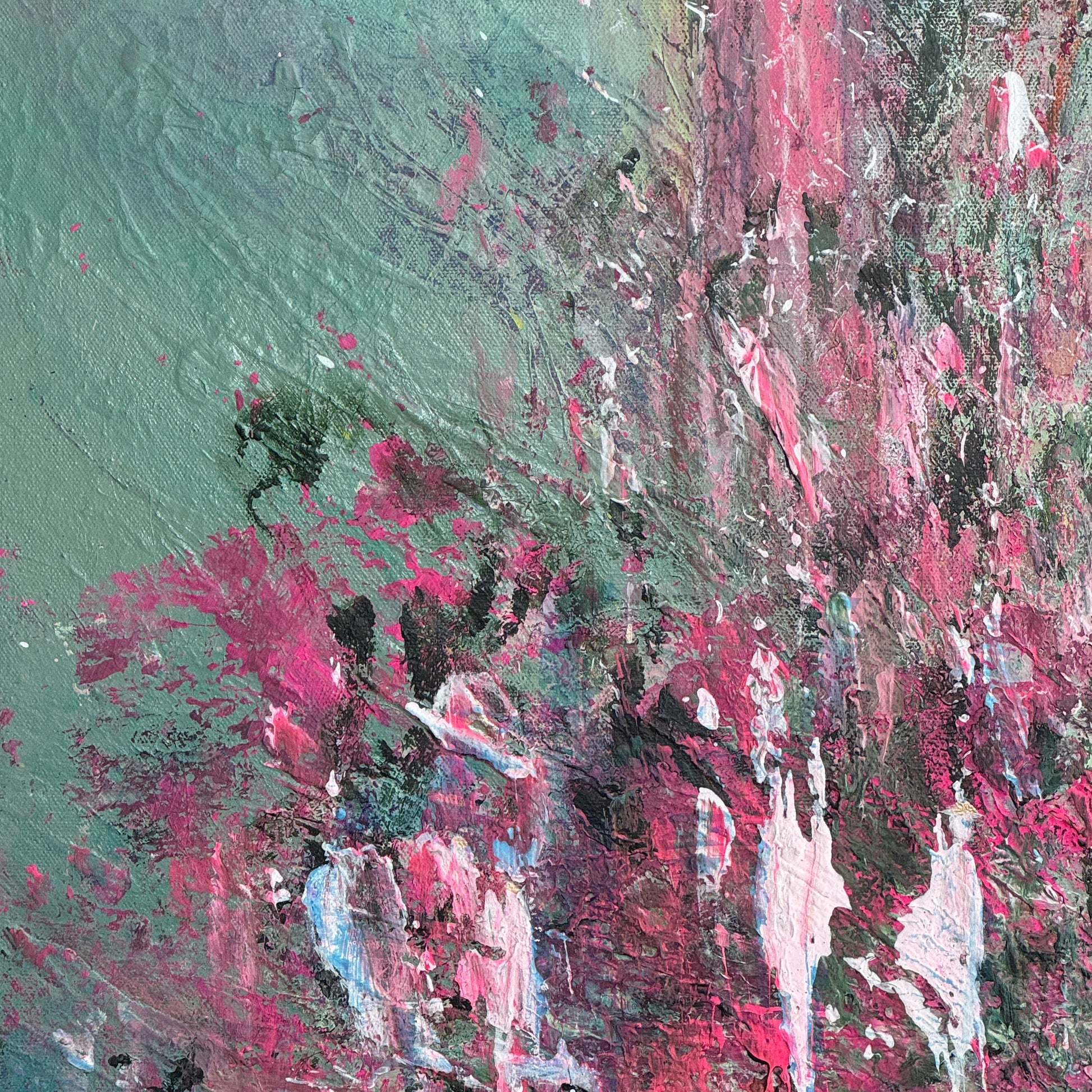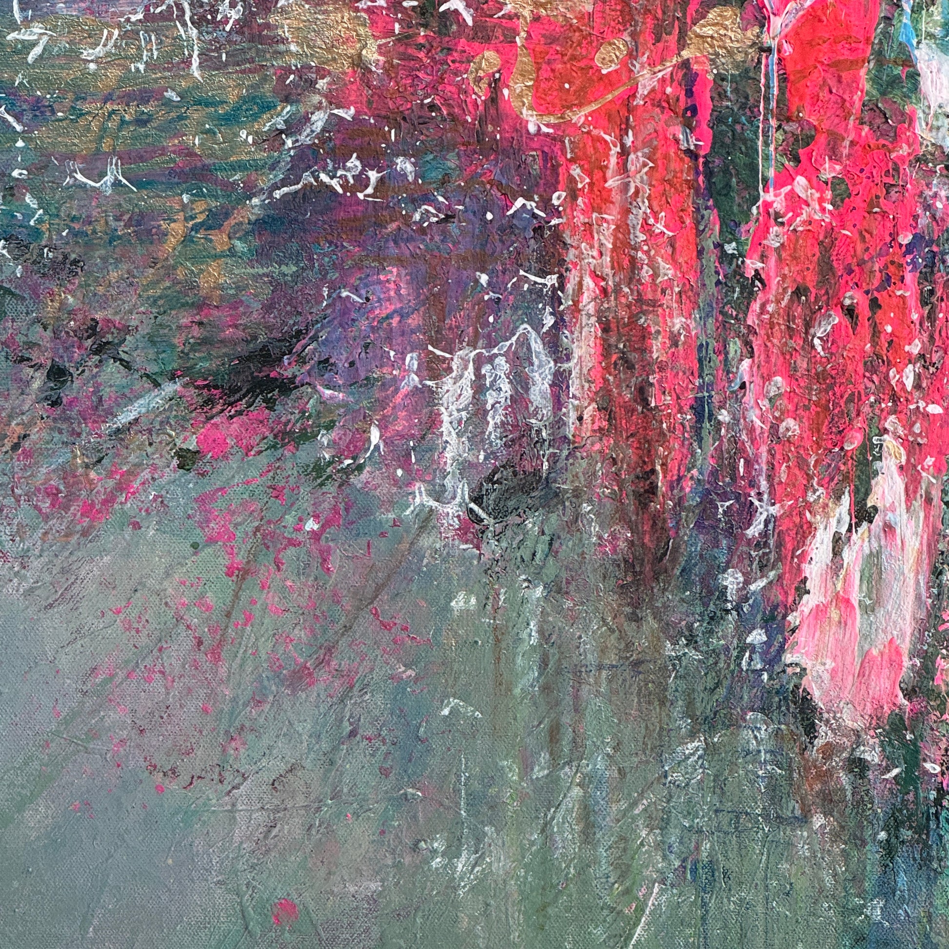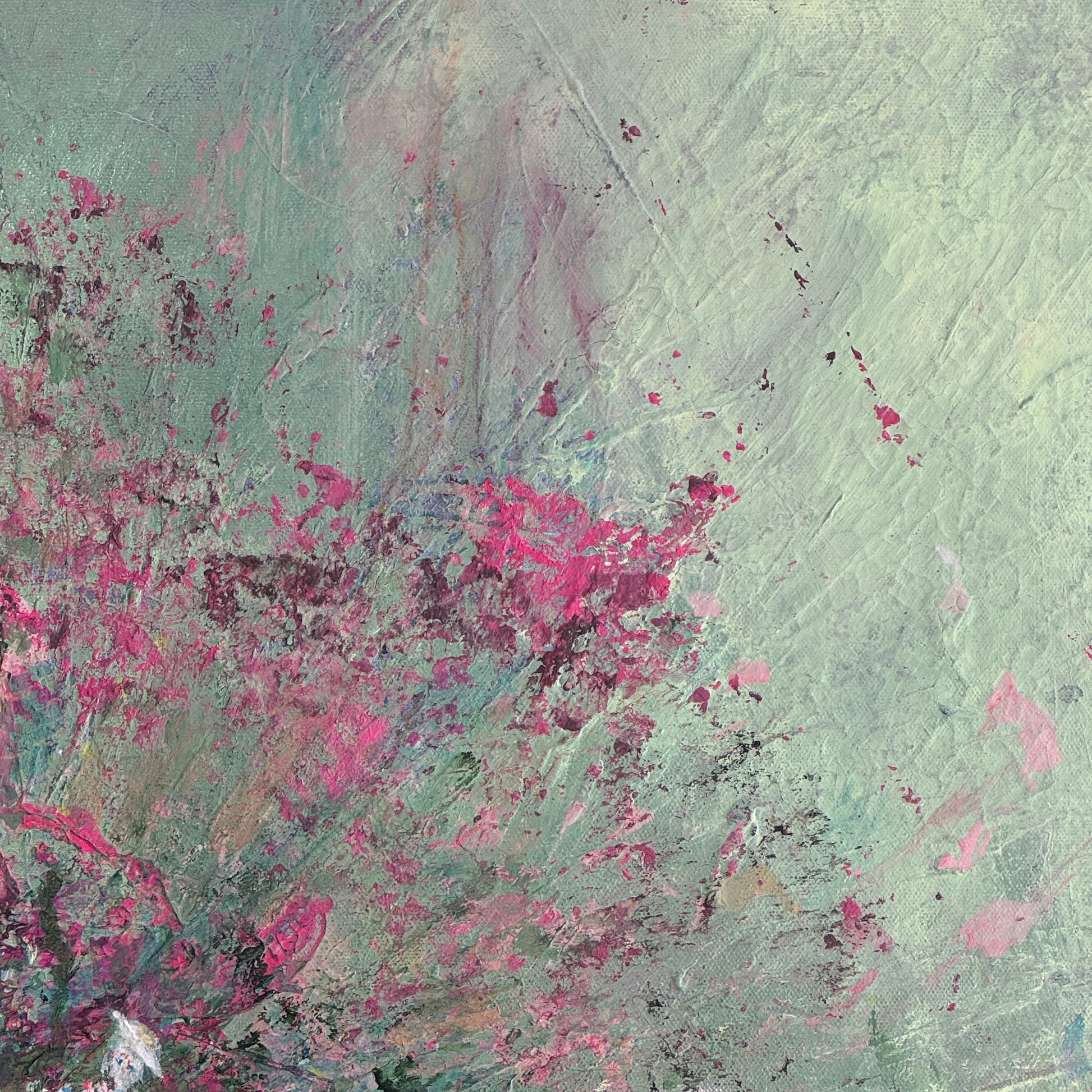 Zarte Rosa- und kräftige Rottöne entfalten sich vor einem sanften, nebelhaften Hintergrund wie tanzende Blütenblätter im Wind. Die Farben wirbeln ineinander, verschmelzen zu einem lebendigen Spiel aus Bewegung und Emotion.