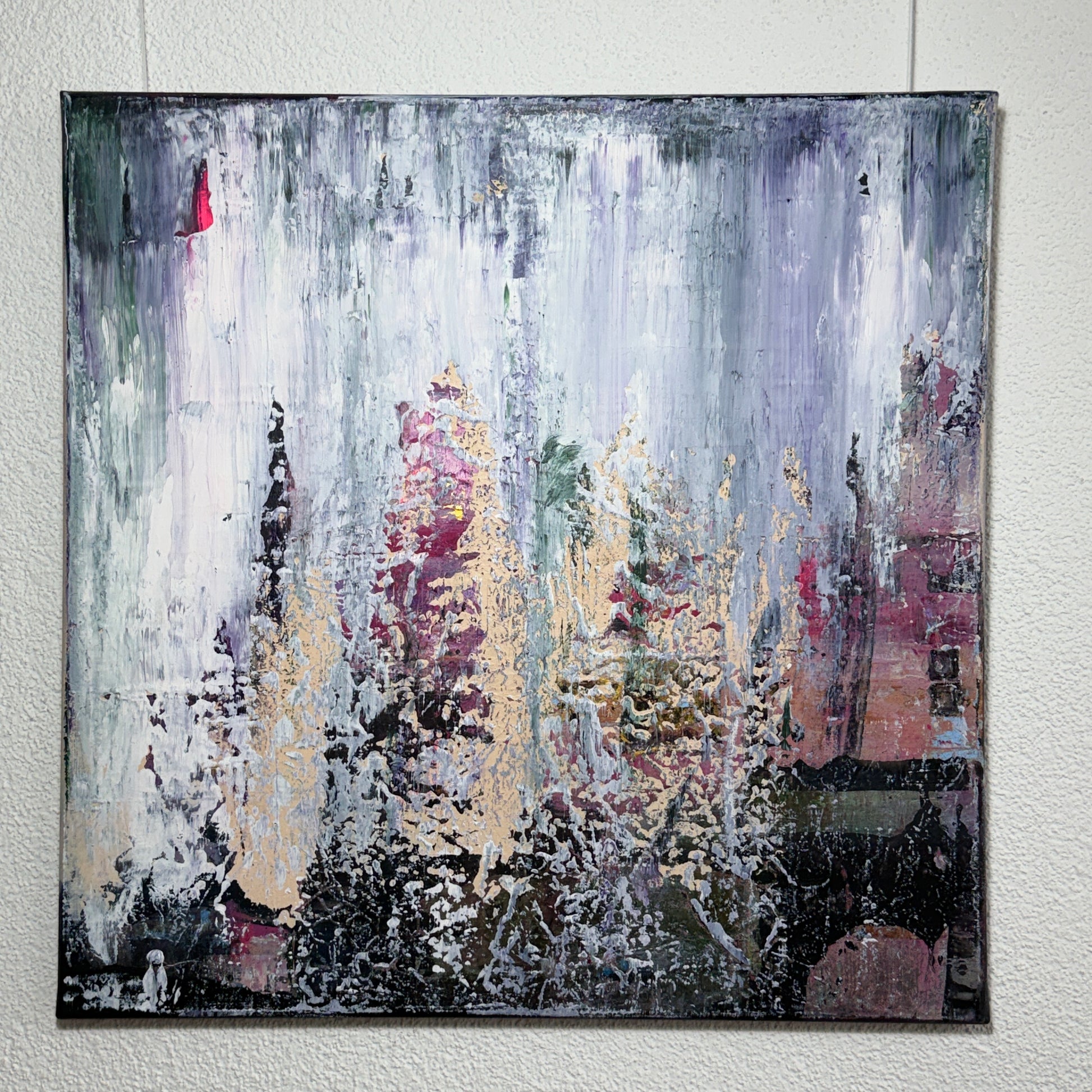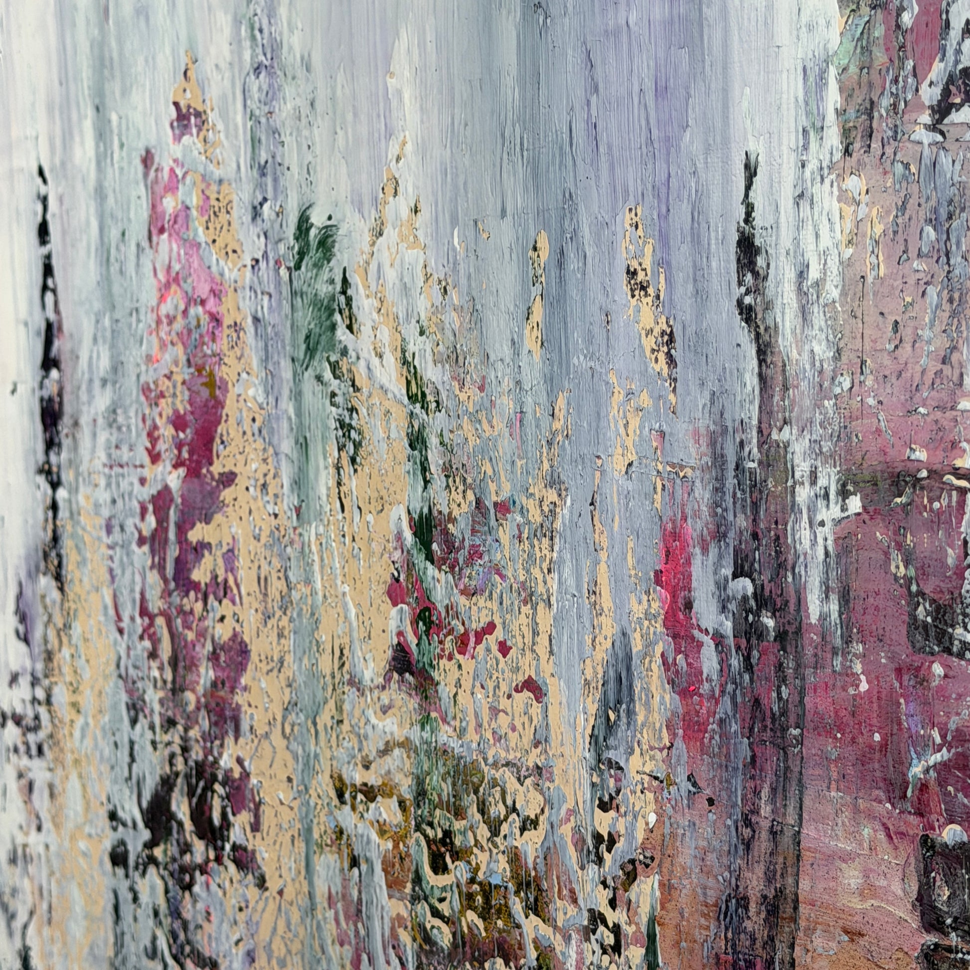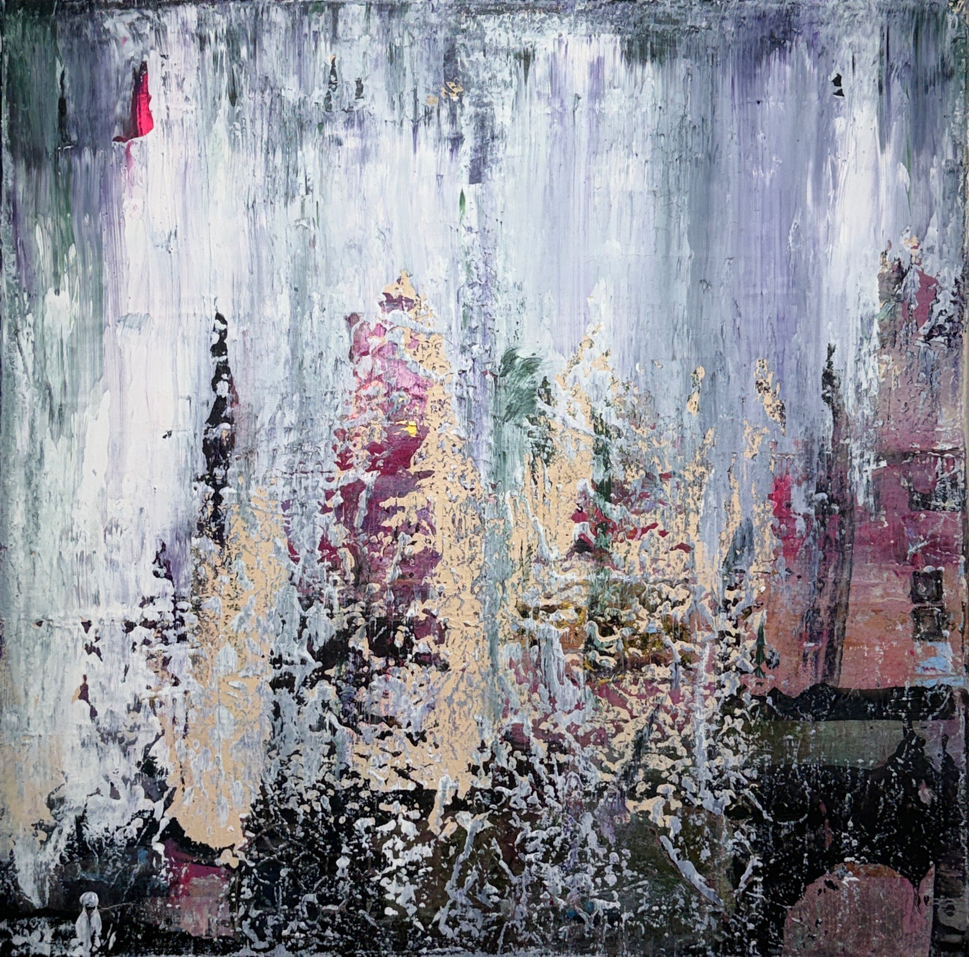 Wie durch einen Schleier aus Nebel und Zeit erscheint eine Stadt, die nicht mehr klar greifbar ist. Schicht um Schicht legen sich Farben übereinander, verlaufen, brechen auf und geben den Blick frei auf Fragmente von Architektur, Erinnerung und Gefühl. Kühle Grau- und Blautöne dominieren die Fläche, durchzogen von warmen Gold-, Ocker- und Rosaspuren, die wie leuchtende Gedanken aus dem Inneren der Stadt aufscheinen.
