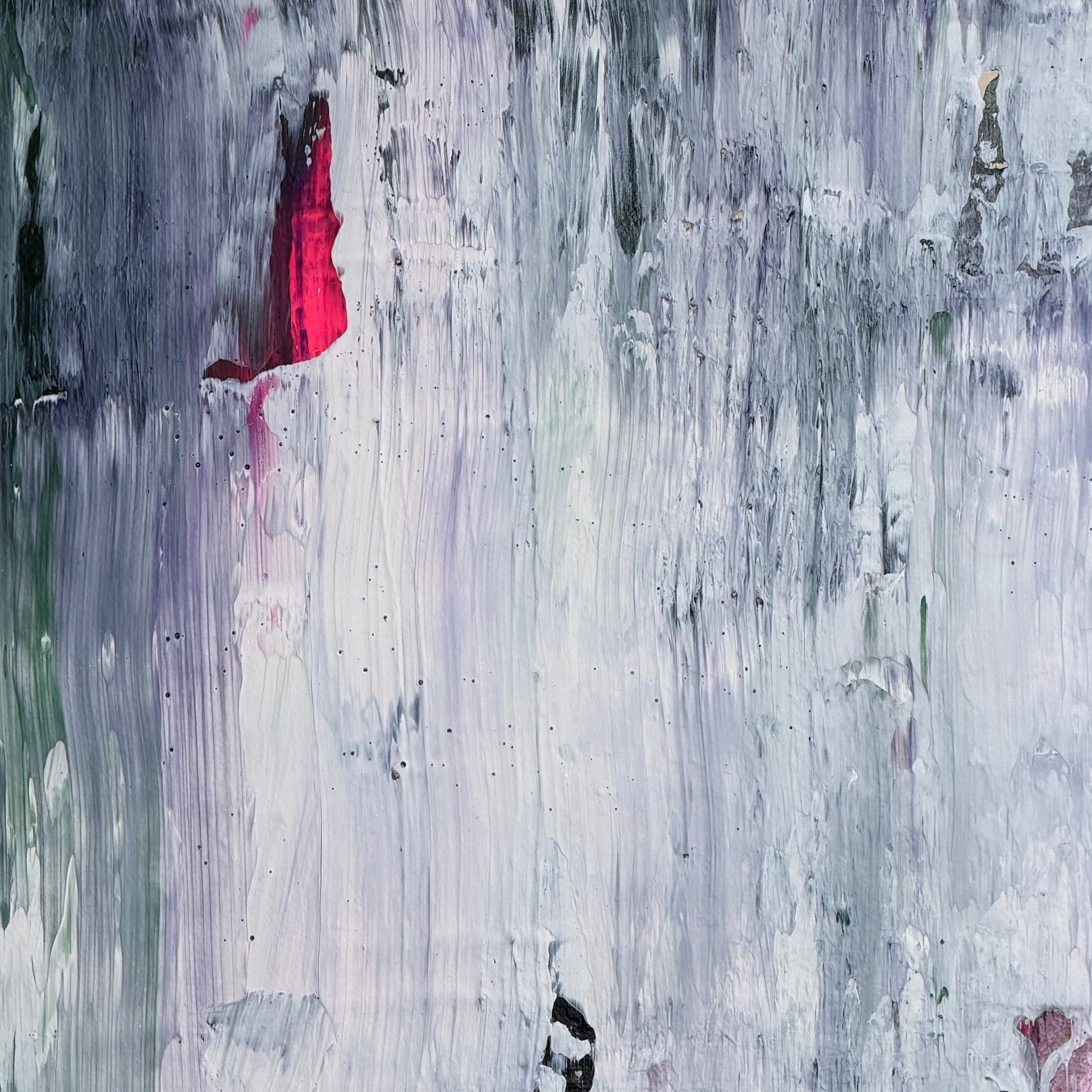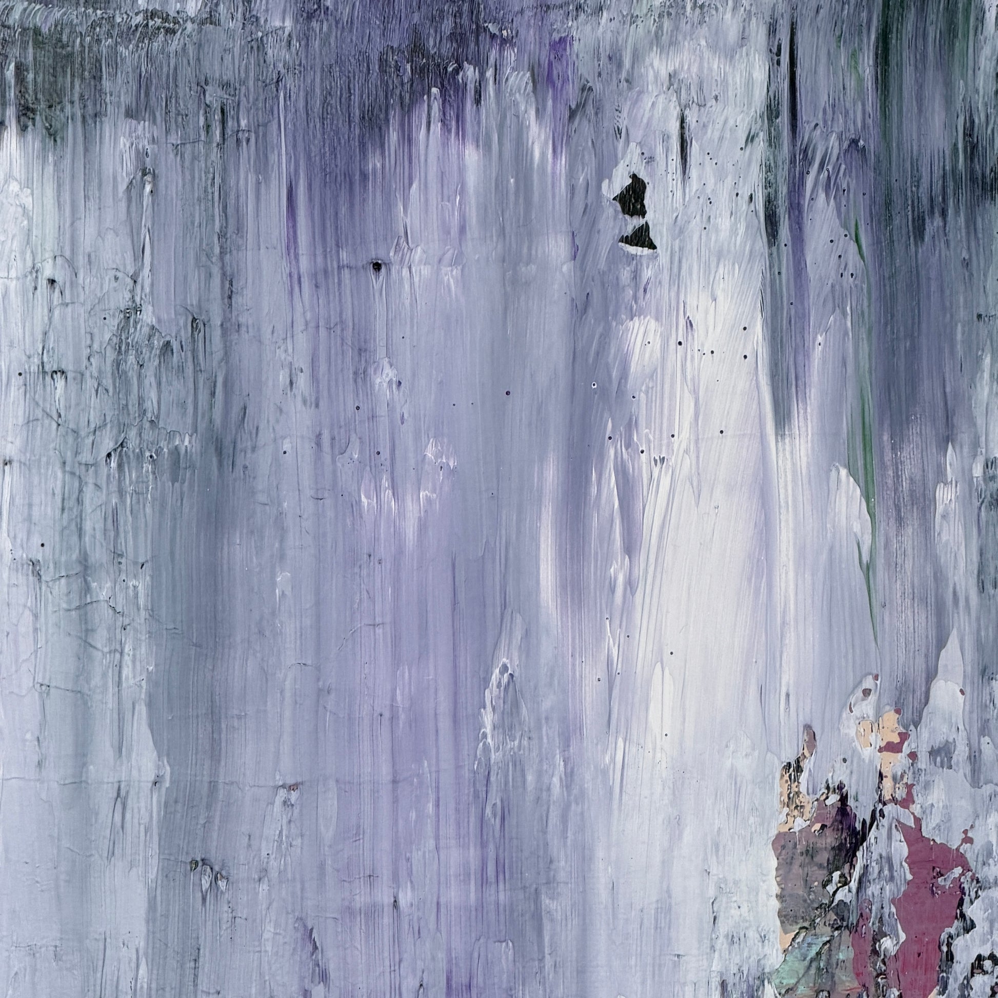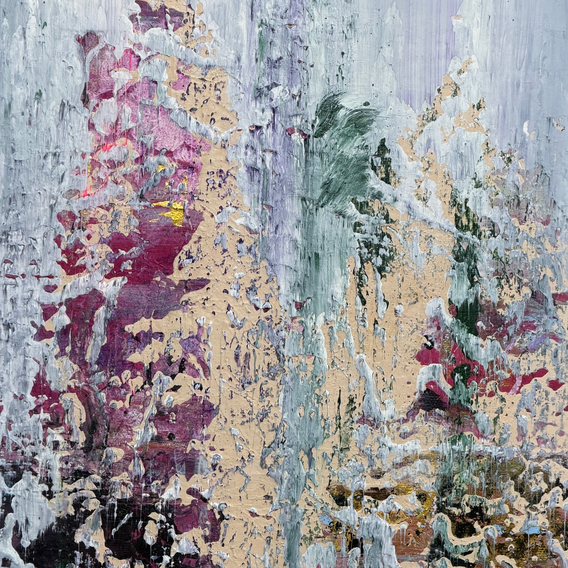 Wie durch einen Schleier aus Nebel und Zeit erscheint eine Stadt, die nicht mehr klar greifbar ist. Schicht um Schicht legen sich Farben übereinander, verlaufen, brechen auf und geben den Blick frei auf Fragmente von Architektur, Erinnerung und Gefühl. Kühle Grau- und Blautöne dominieren die Fläche, durchzogen von warmen Gold-, Ocker- und Rosaspuren, die wie leuchtende Gedanken aus dem Inneren der Stadt aufscheinen.