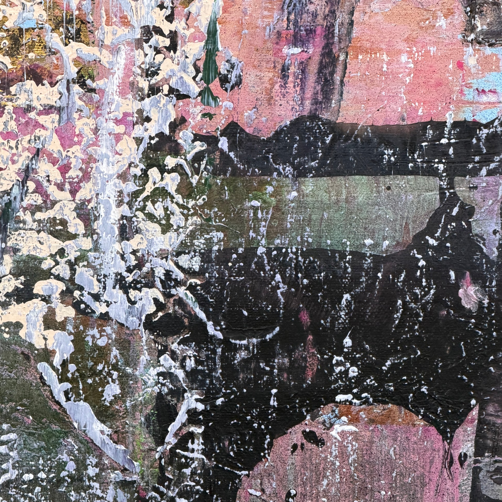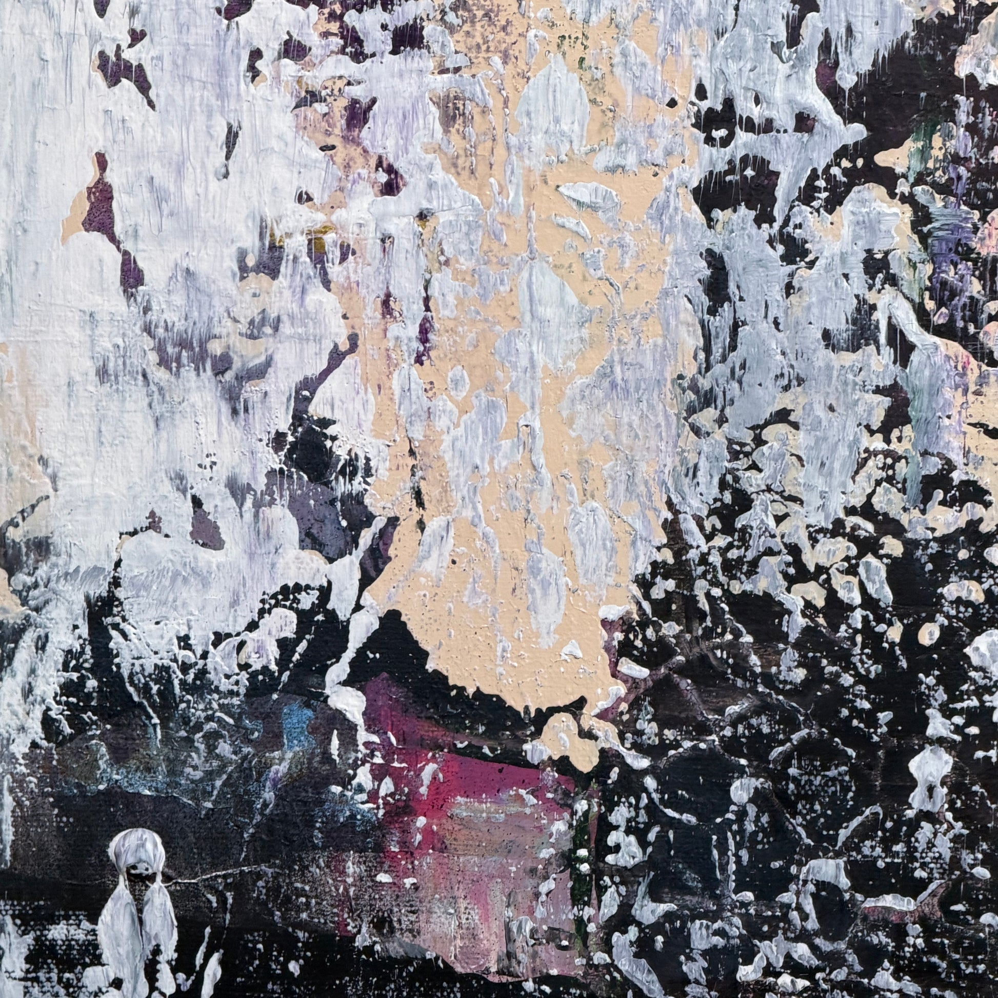 Vertikale Strukturen erinnern an Häuserzeilen oder Türme, doch sie bleiben schemenhaft, fast traumartig. Die Oberfläche wirkt verwittert, als hätte Wind, Regen und Zeit ihre Spuren hinterlassen. Nichts ist abgeschlossen, alles im Übergang – zwischen Aufbau und Zerfall, Stille und Bewegung.