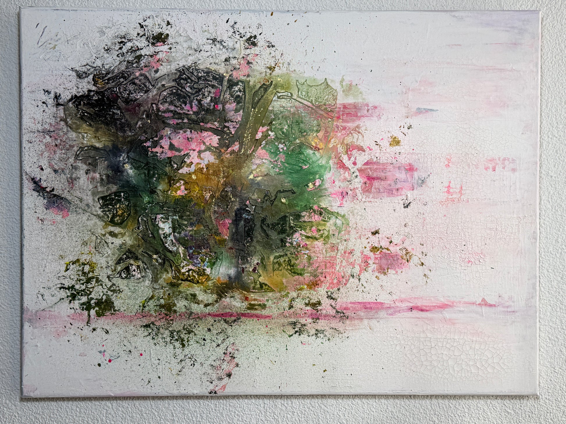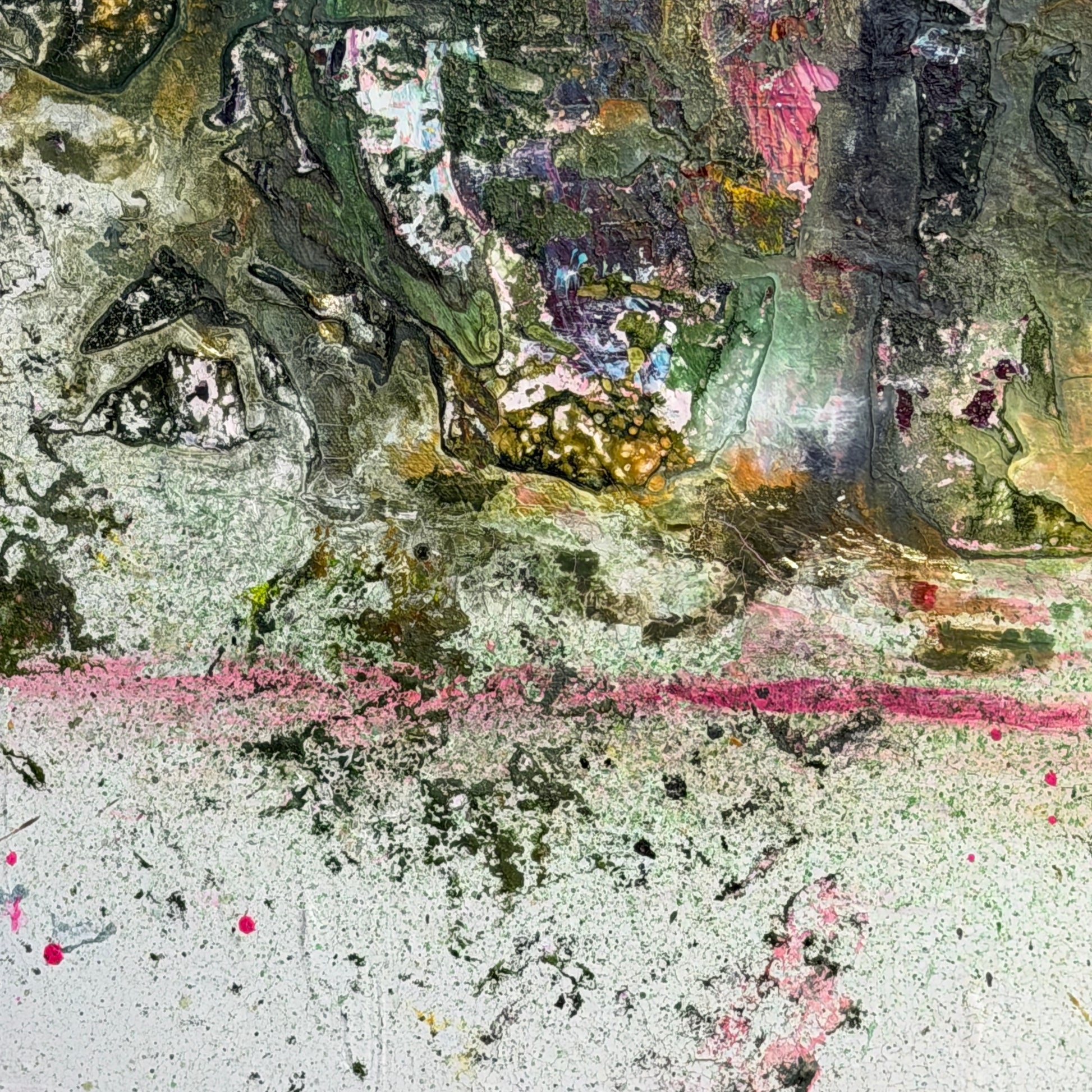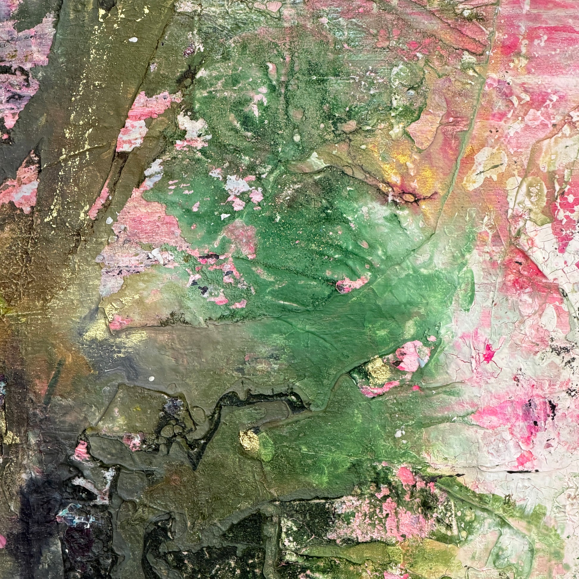 Dieses Werk öffnet ein Tor zu einem geheimnisvollen Ort, der außerhalb unserer sichtbaren Welt existiert. Die Farben scheinen nicht einfach aufgetragen, sondern wie freigelegt – als wären sie Schichten eines verborgenen, lebendigen Raumes. Dunkle, moosige Grünflächen treffen auf zarte Rosénuancen, die wie aufblitzende Blüten im Zwielicht wirken. Aus der Mitte heraus pulsiert eine organische Energie, als würde etwas wachsen, sich ausbreiten, atmen.