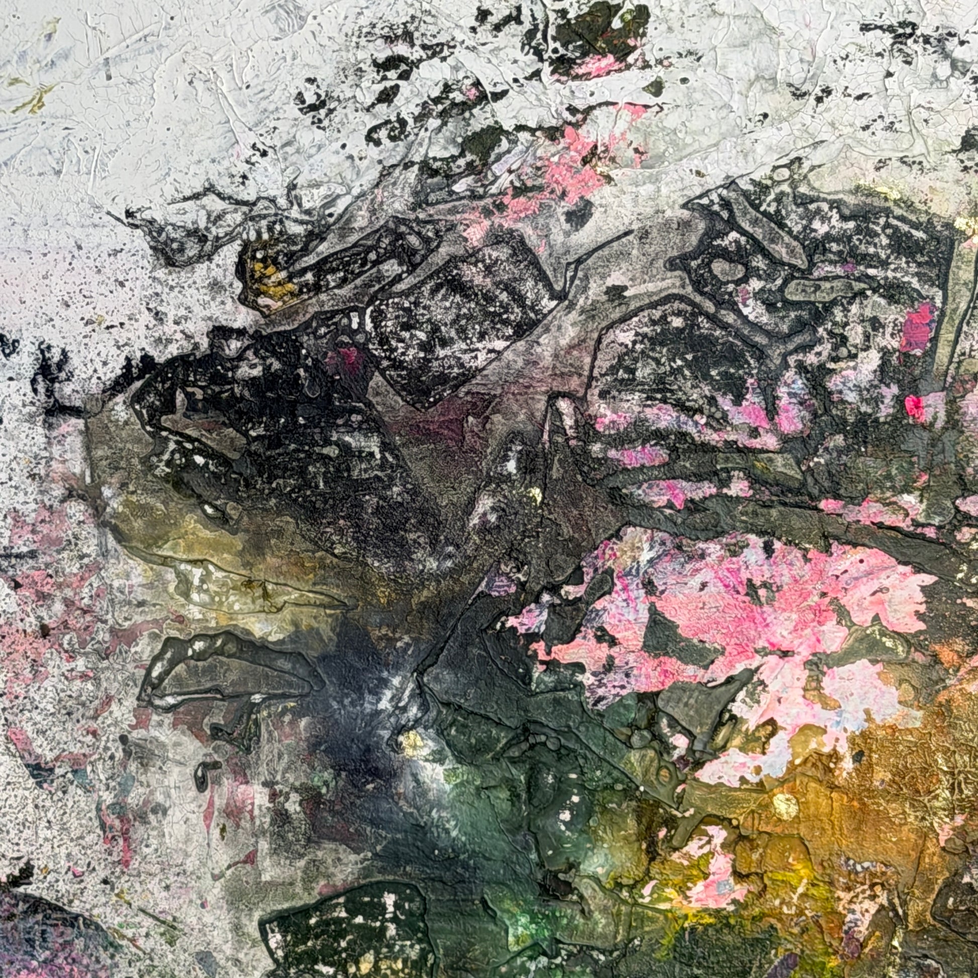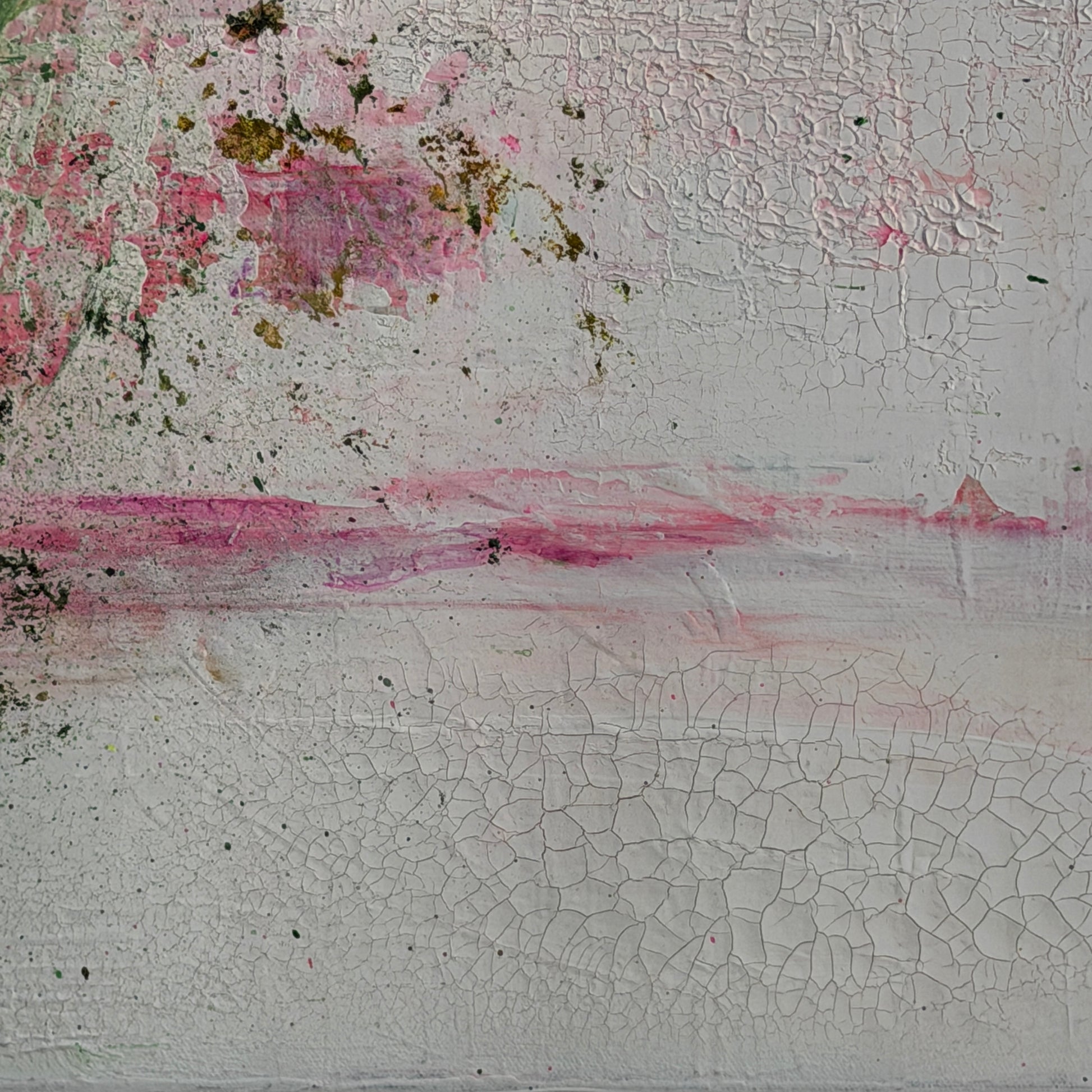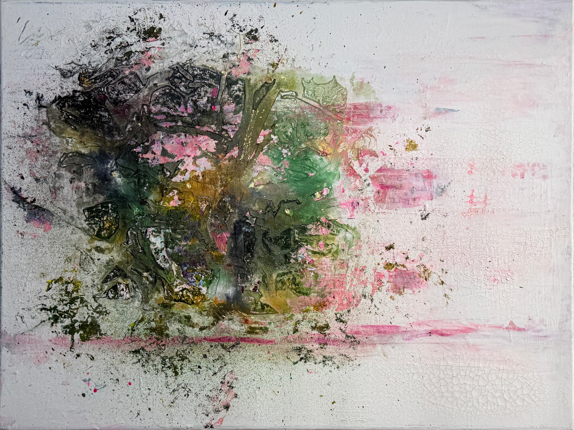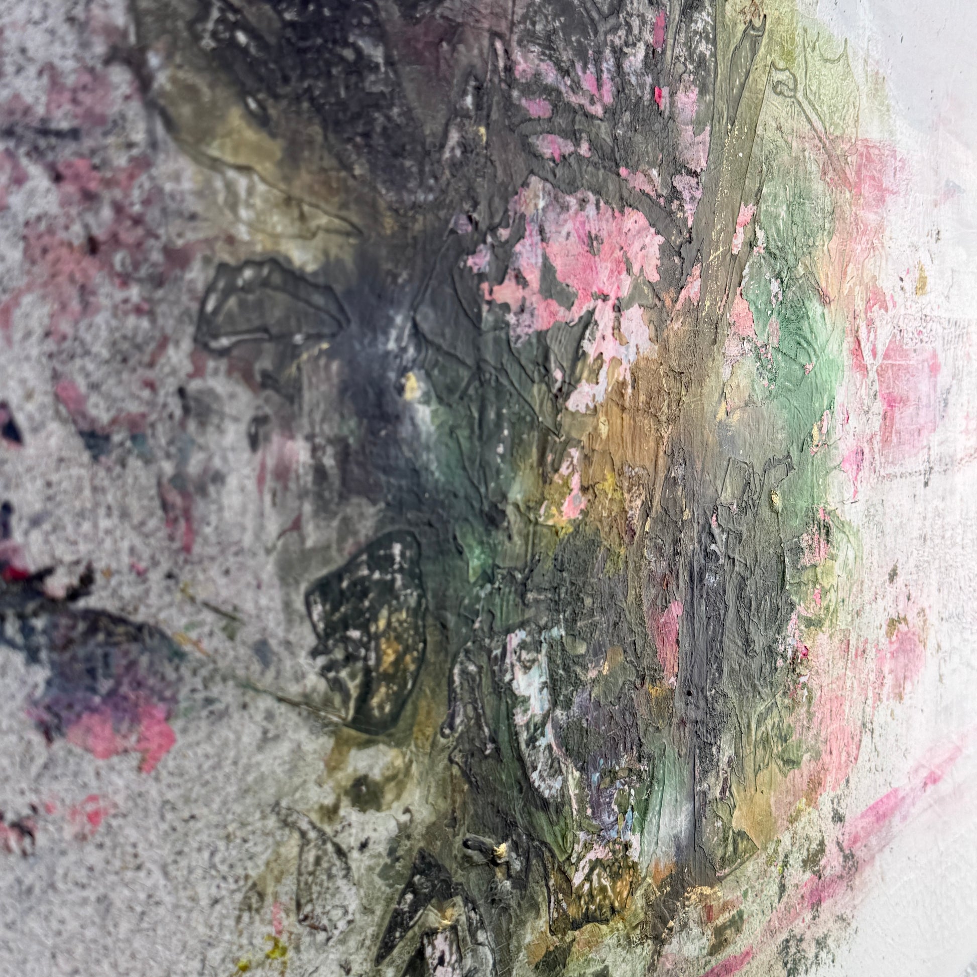 Dieses Werk öffnet ein Tor zu einem geheimnisvollen Ort, der außerhalb unserer sichtbaren Welt existiert. Die Farben scheinen nicht einfach aufgetragen, sondern wie freigelegt – als wären sie Schichten eines verborgenen, lebendigen Raumes. Dunkle, moosige Grünflächen treffen auf zarte Rosénuancen, die wie aufblitzende Blüten im Zwielicht wirken. Aus der Mitte heraus pulsiert eine organische Energie, als würde etwas wachsen, sich ausbreiten, atmen.