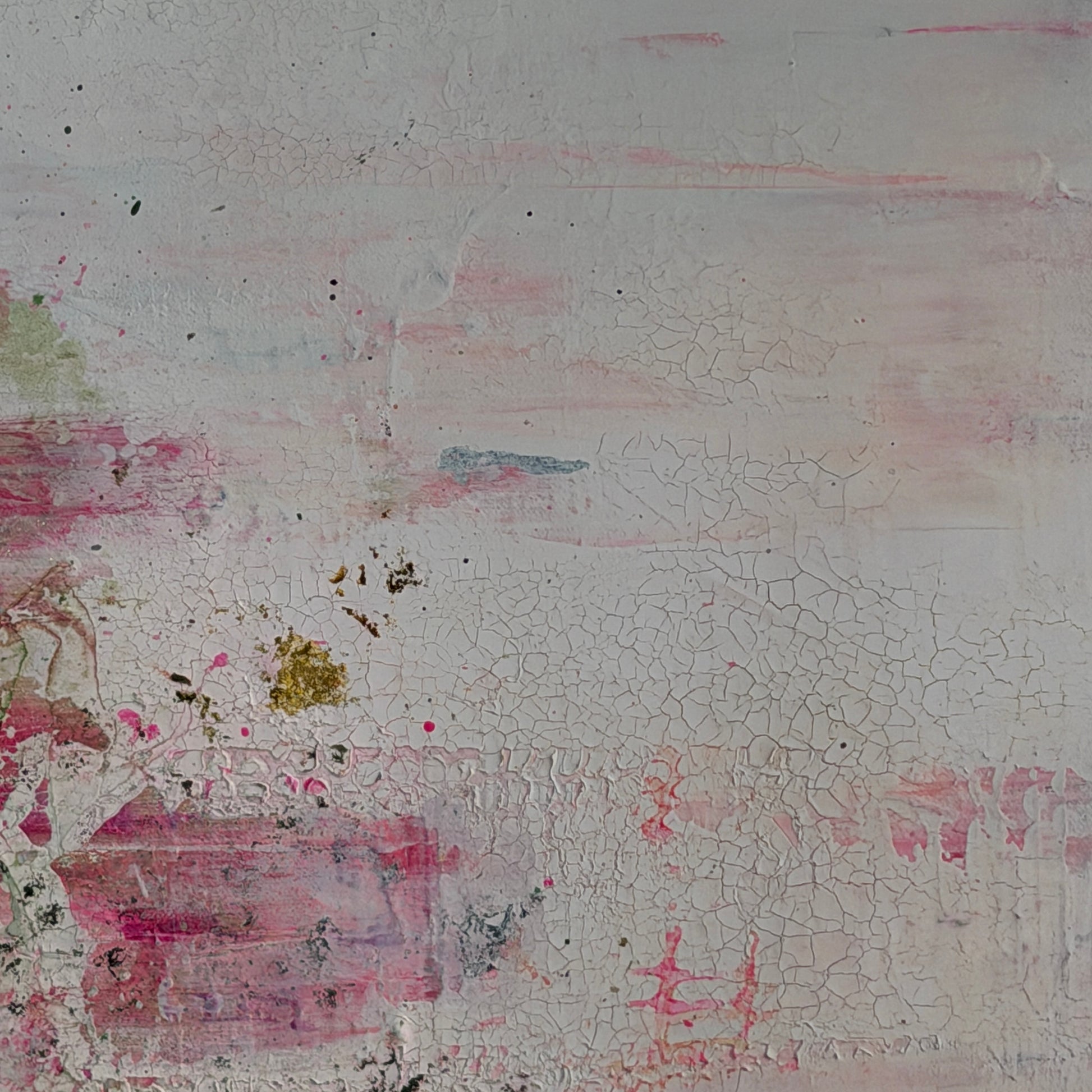Die Texturen lassen Spuren von Zeit und Transformation erkennen: feine Risse, verwischte Schatten, aufgerissene Strukturen – alles erinnert an einen Ort, der sowohl wild als auch behütet ist. Ein Garten, der sich nur jenen zeigt, die bereit sind, still zu werden und in die Zwischenräume zu blicken.