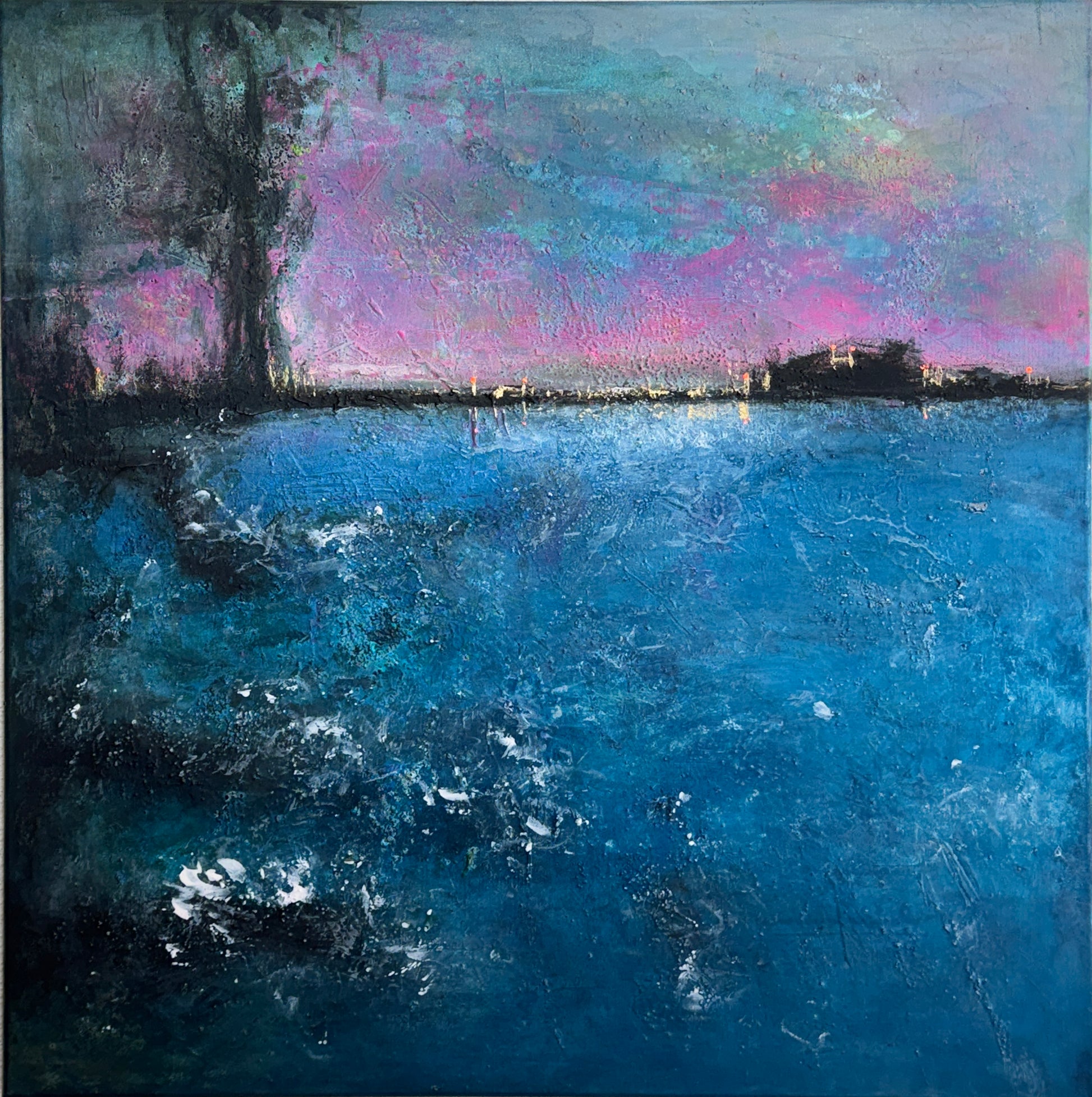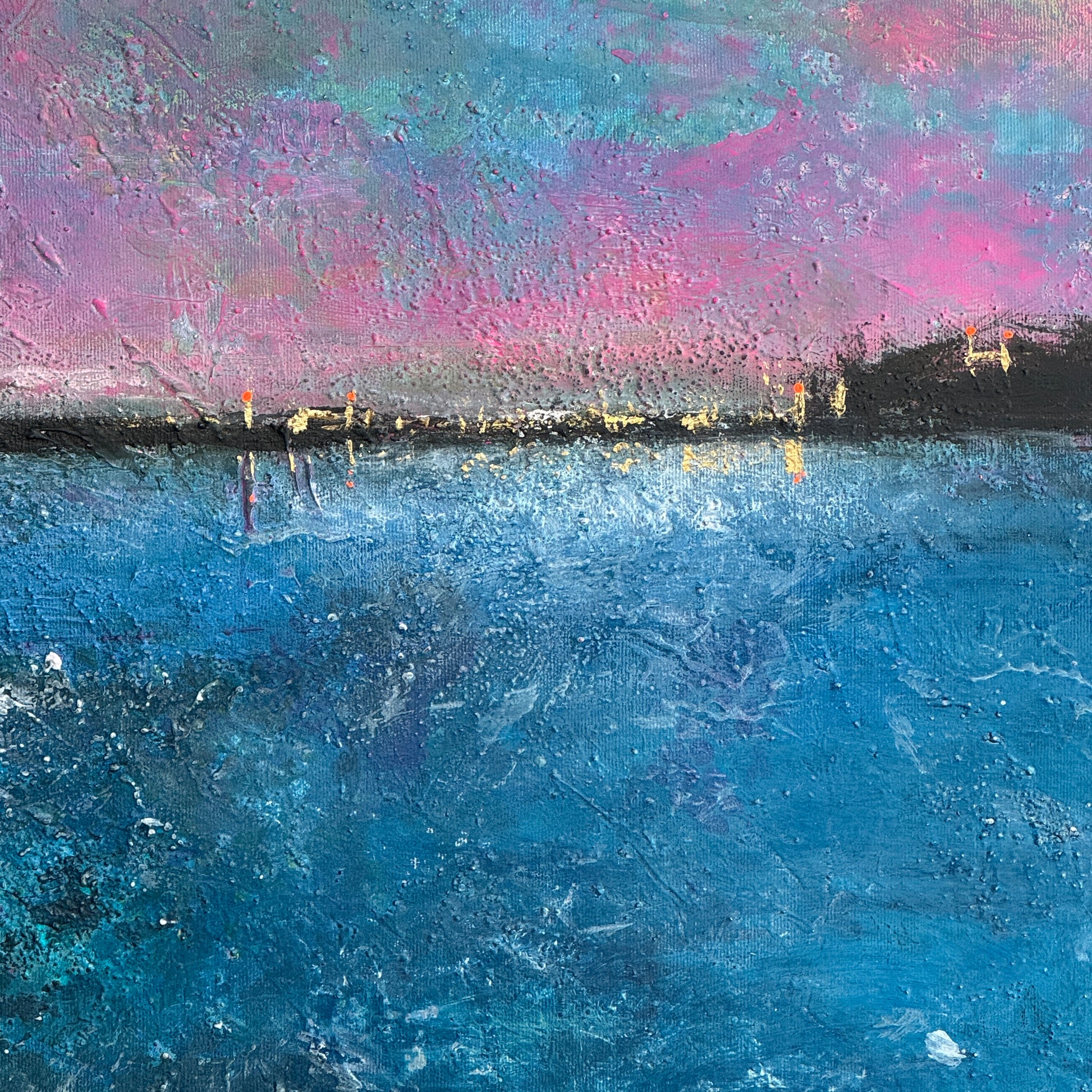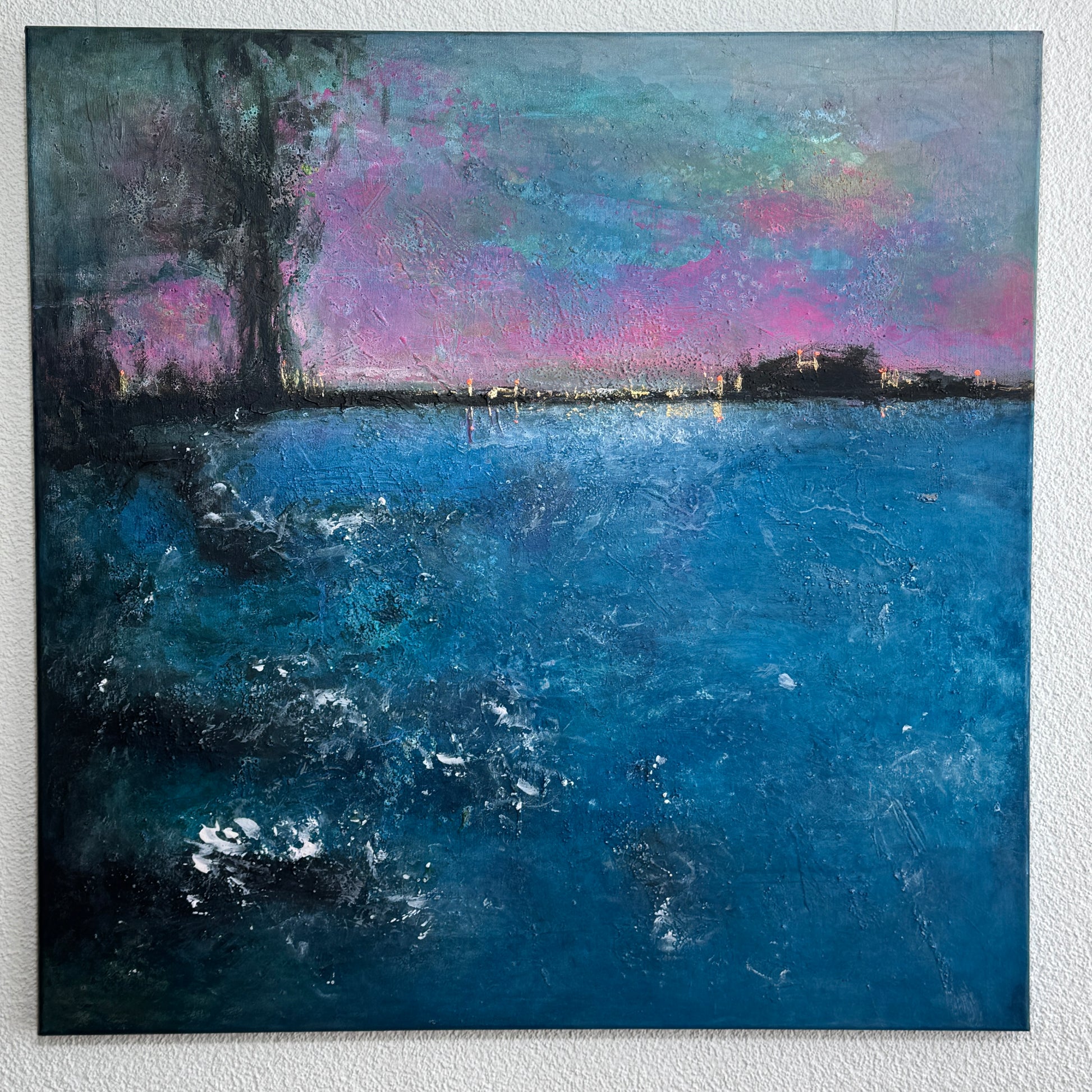 Ein Meisterwerk der Stille und Sehnsucht. Die tiefen Blautöne verschmelzen mit schimmernden Nuancen von Rosa und Türkis zu einem faszinierenden Spiel aus Licht und Schatten.