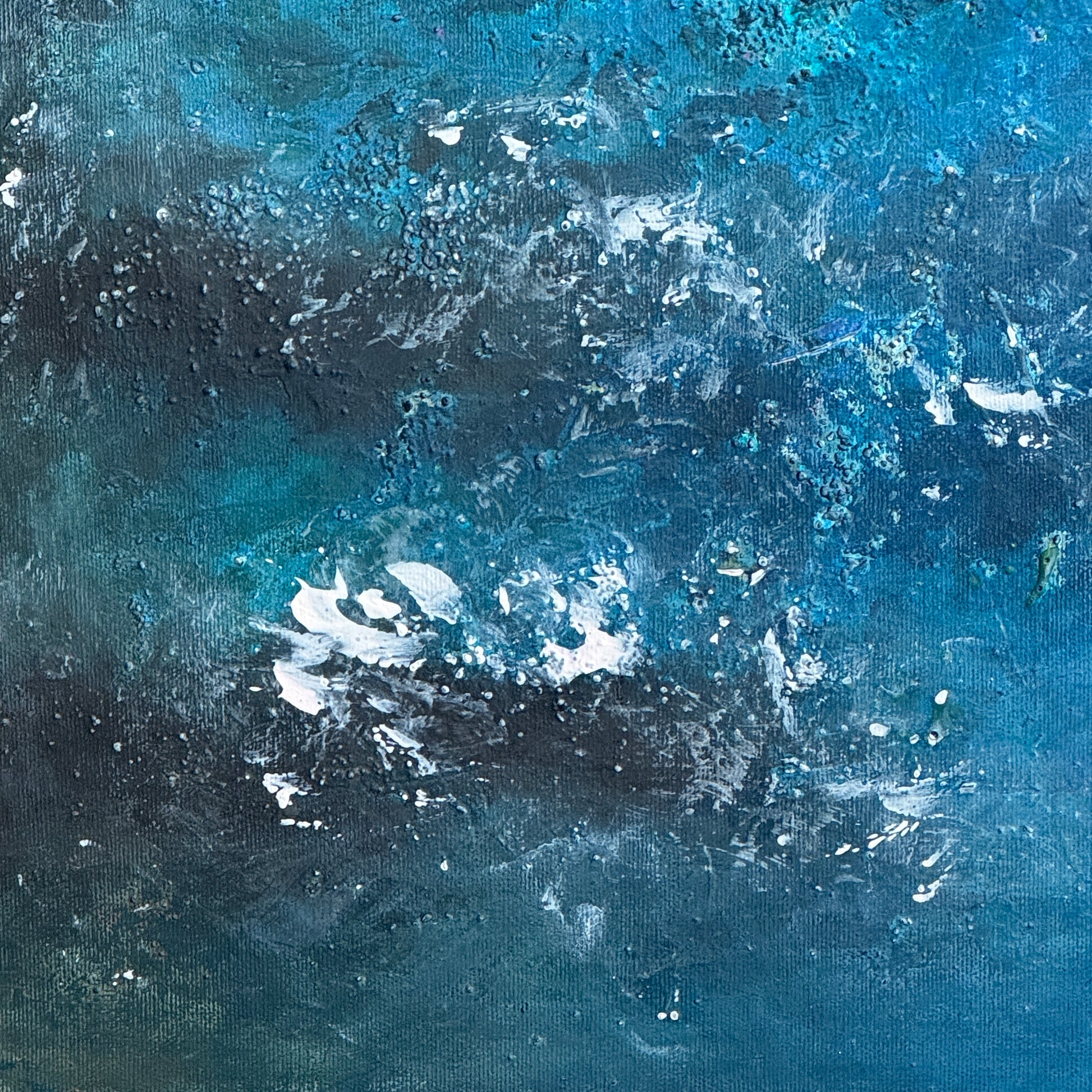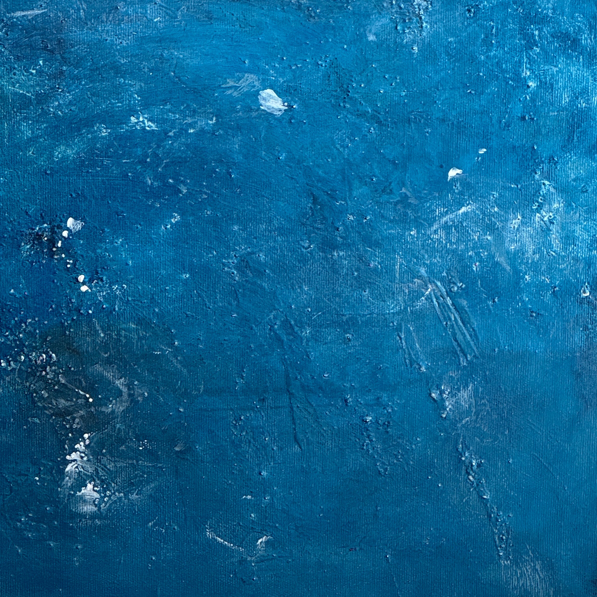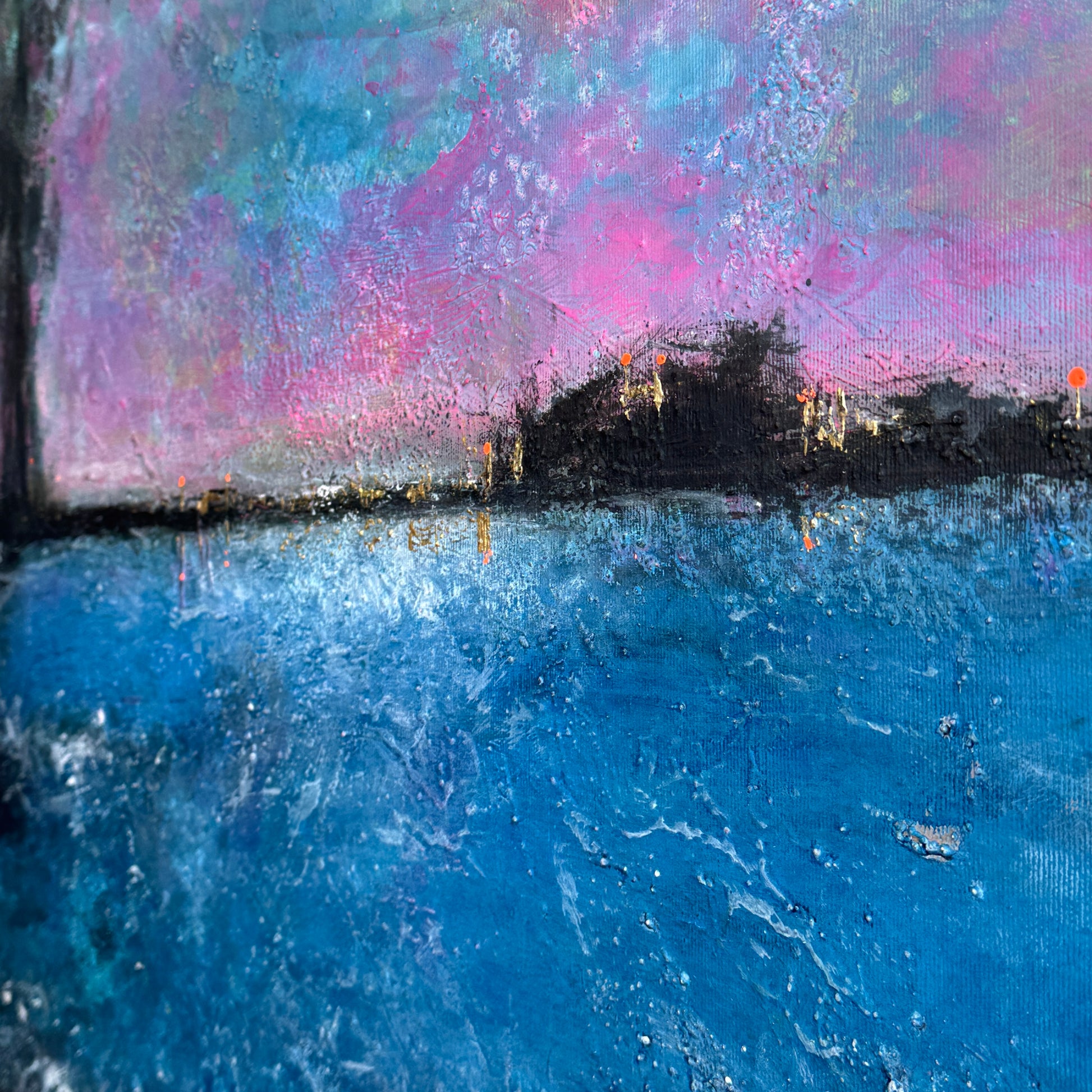 Ein Meisterwerk der Stille und Sehnsucht. Die tiefen Blautöne verschmelzen mit schimmernden Nuancen von Rosa und Türkis zu einem faszinierenden Spiel aus Licht und Schatten.