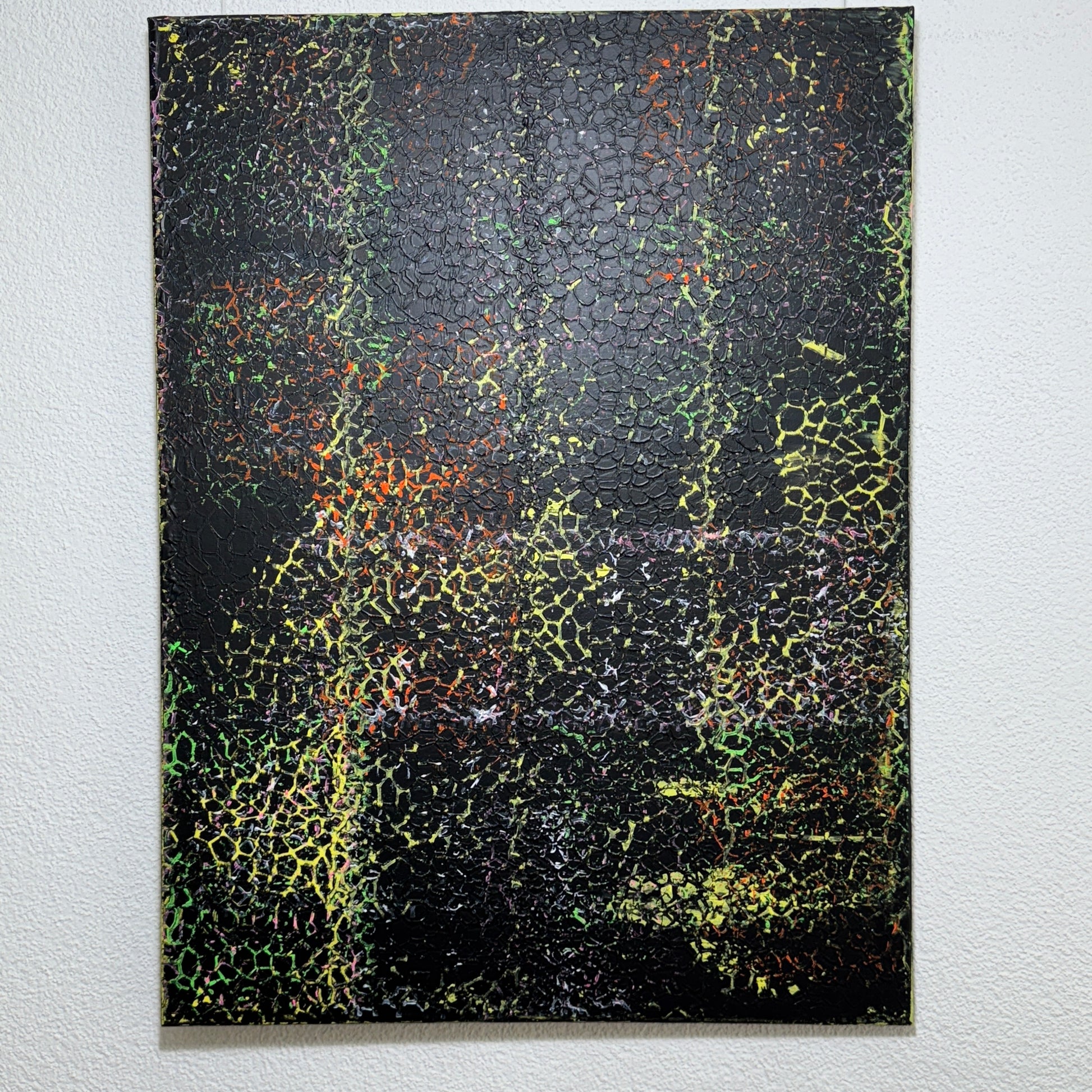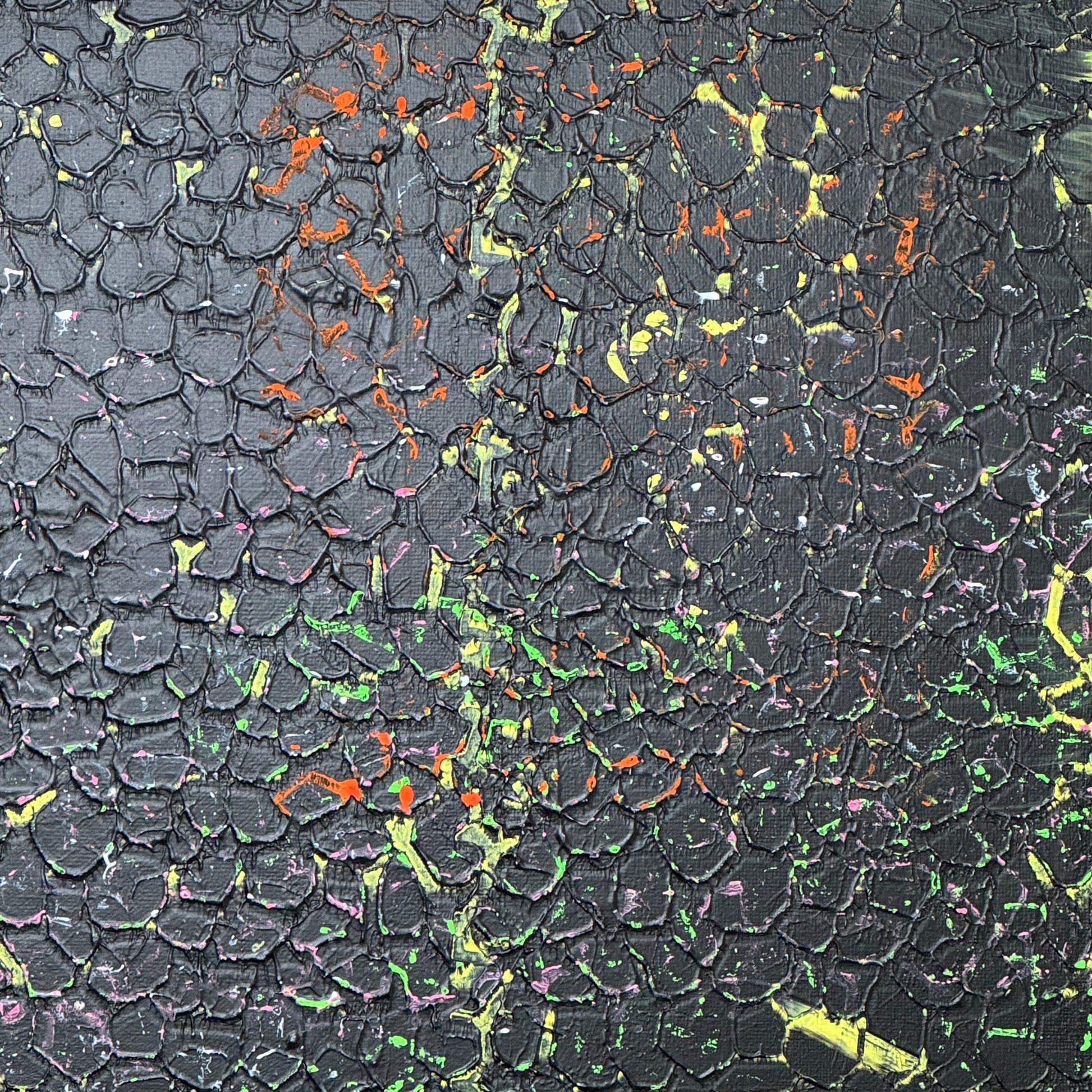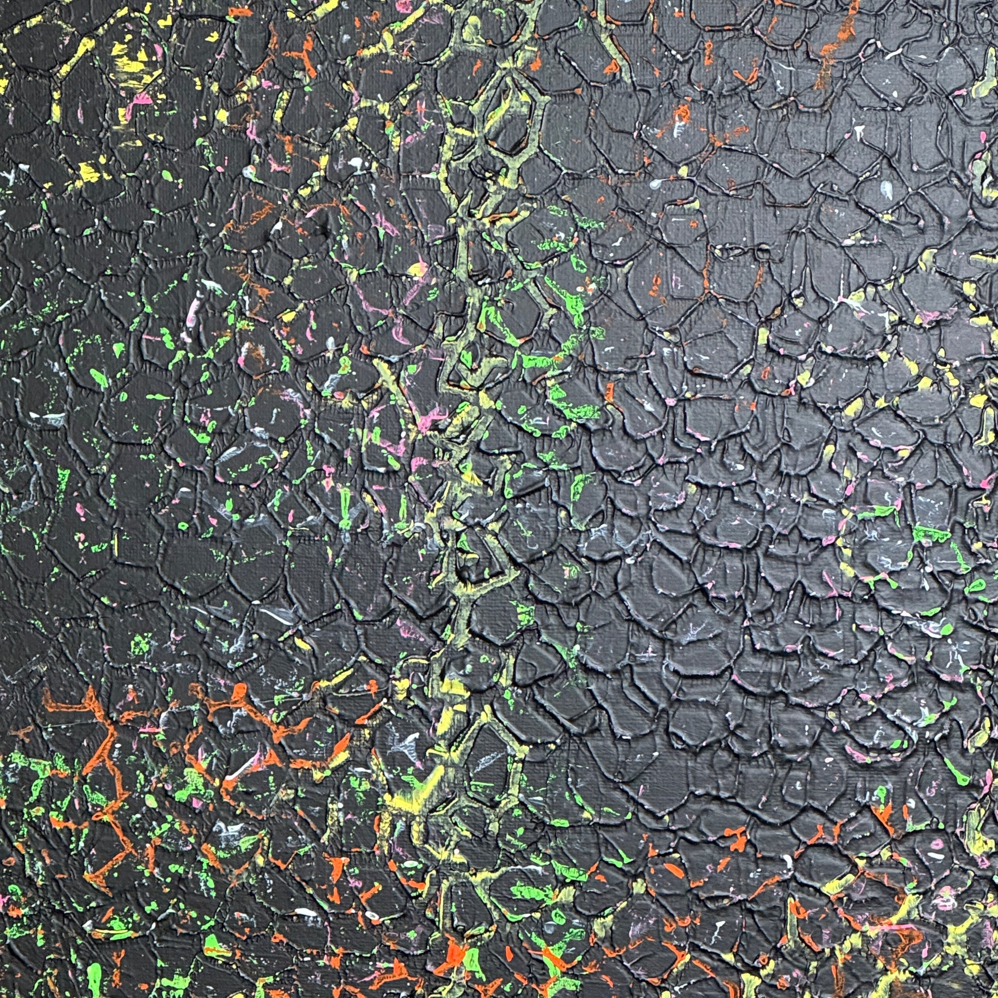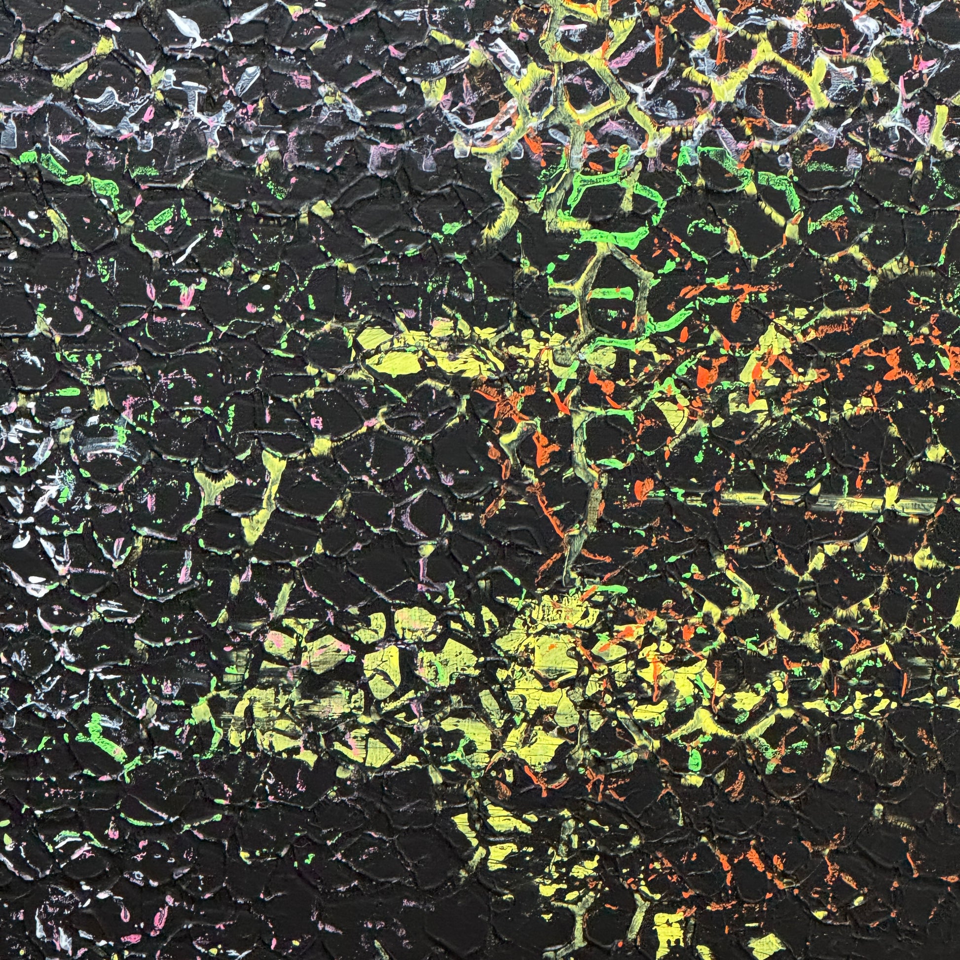 In “Fragmente der Nacht” offenbart sich ein stilles, geheimnisvolles Geflecht aus Farbe und Struktur. Auf den ersten Blick wirkt die Oberfläche dunkel und verschlossen, doch bei näherem Hinsehen treten feine Linien und brüchige Netze zutage – wie Risse im Schleier der Dunkelheit. Die subtilen Schimmer von Grün, Violett und Orange leuchten aus der Tiefe hervor, als wären sie Spuren vergangener Bewegungen oder flüchtiger Erinnerungen.