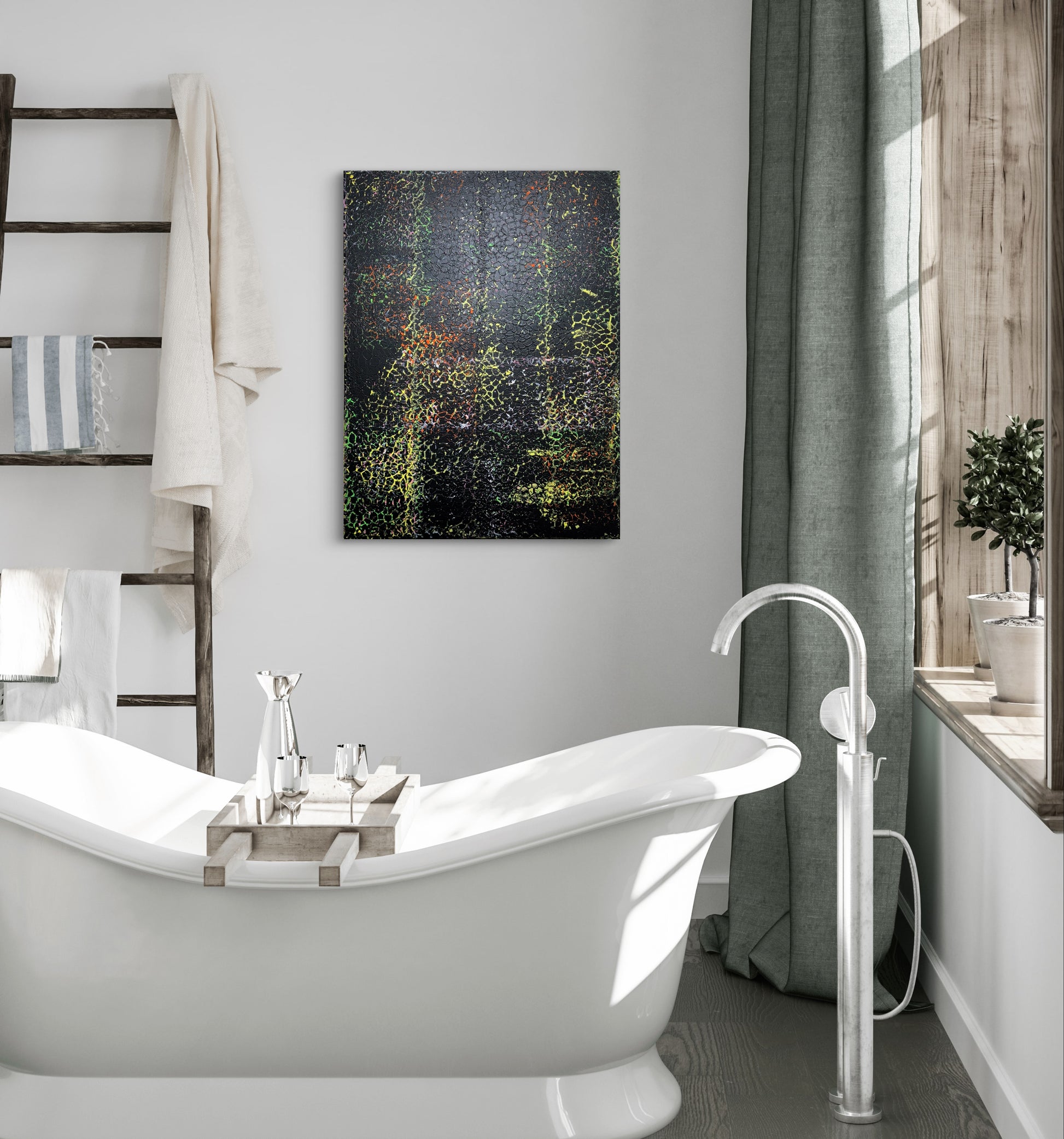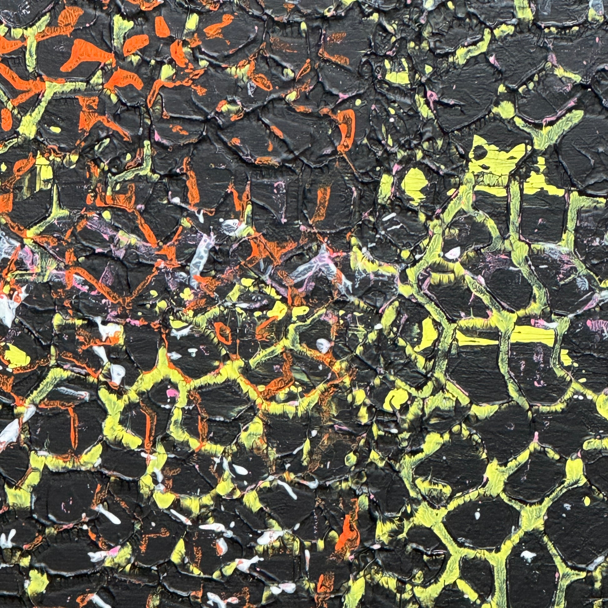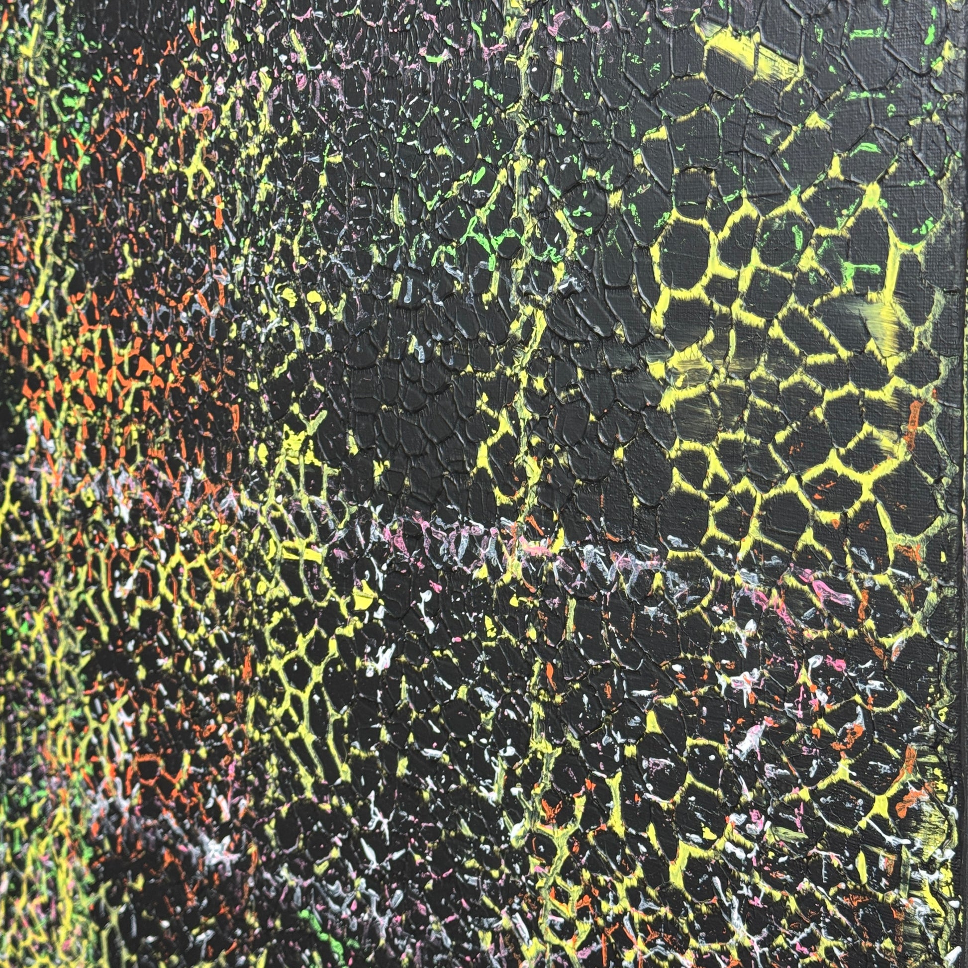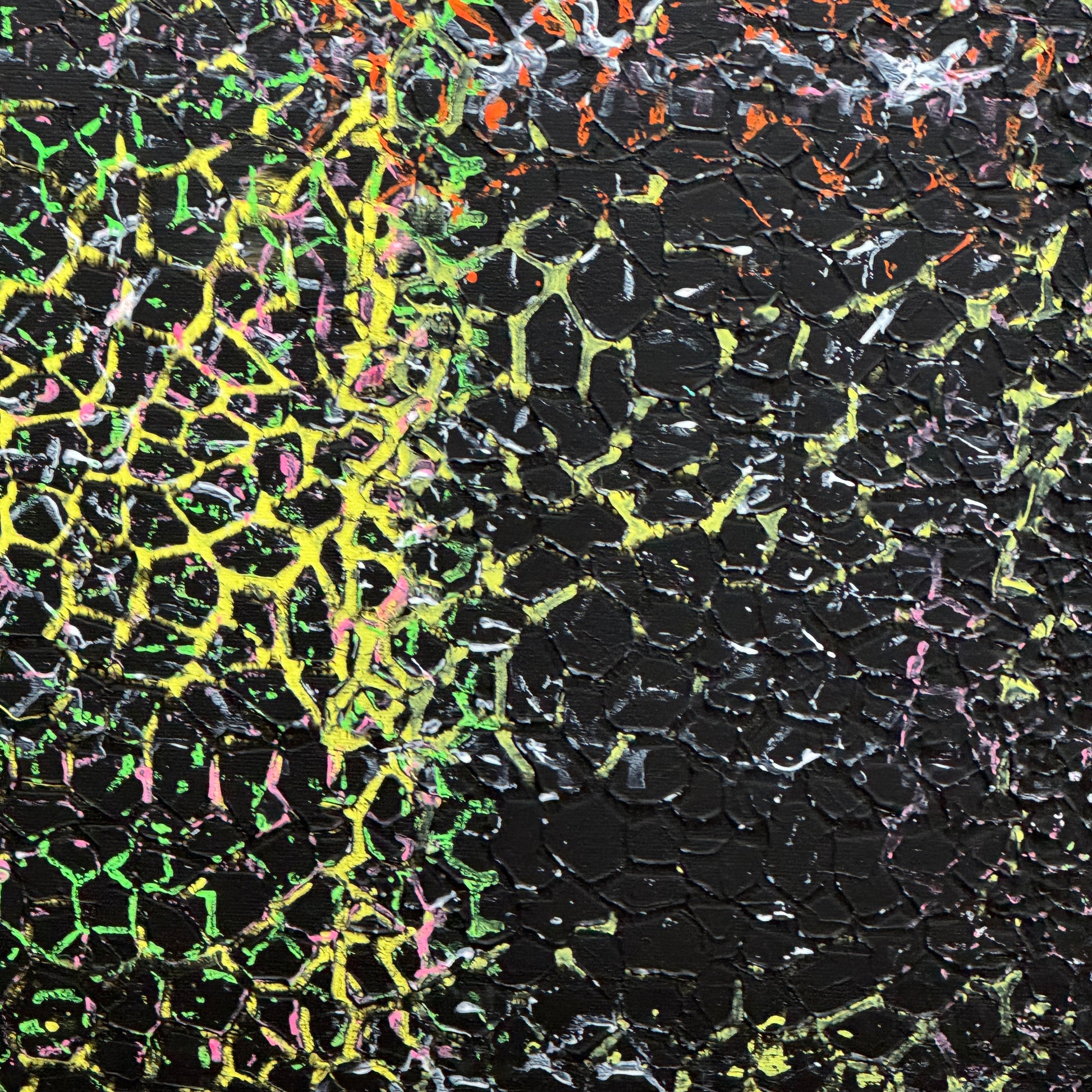 In “Fragmente der Nacht” offenbart sich ein stilles, geheimnisvolles Geflecht aus Farbe und Struktur. Auf den ersten Blick wirkt die Oberfläche dunkel und verschlossen, doch bei näherem Hinsehen treten feine Linien und brüchige Netze zutage – wie Risse im Schleier der Dunkelheit. Die subtilen Schimmer von Grün, Violett und Orange leuchten aus der Tiefe hervor, als wären sie Spuren vergangener Bewegungen oder flüchtiger Erinnerungen.