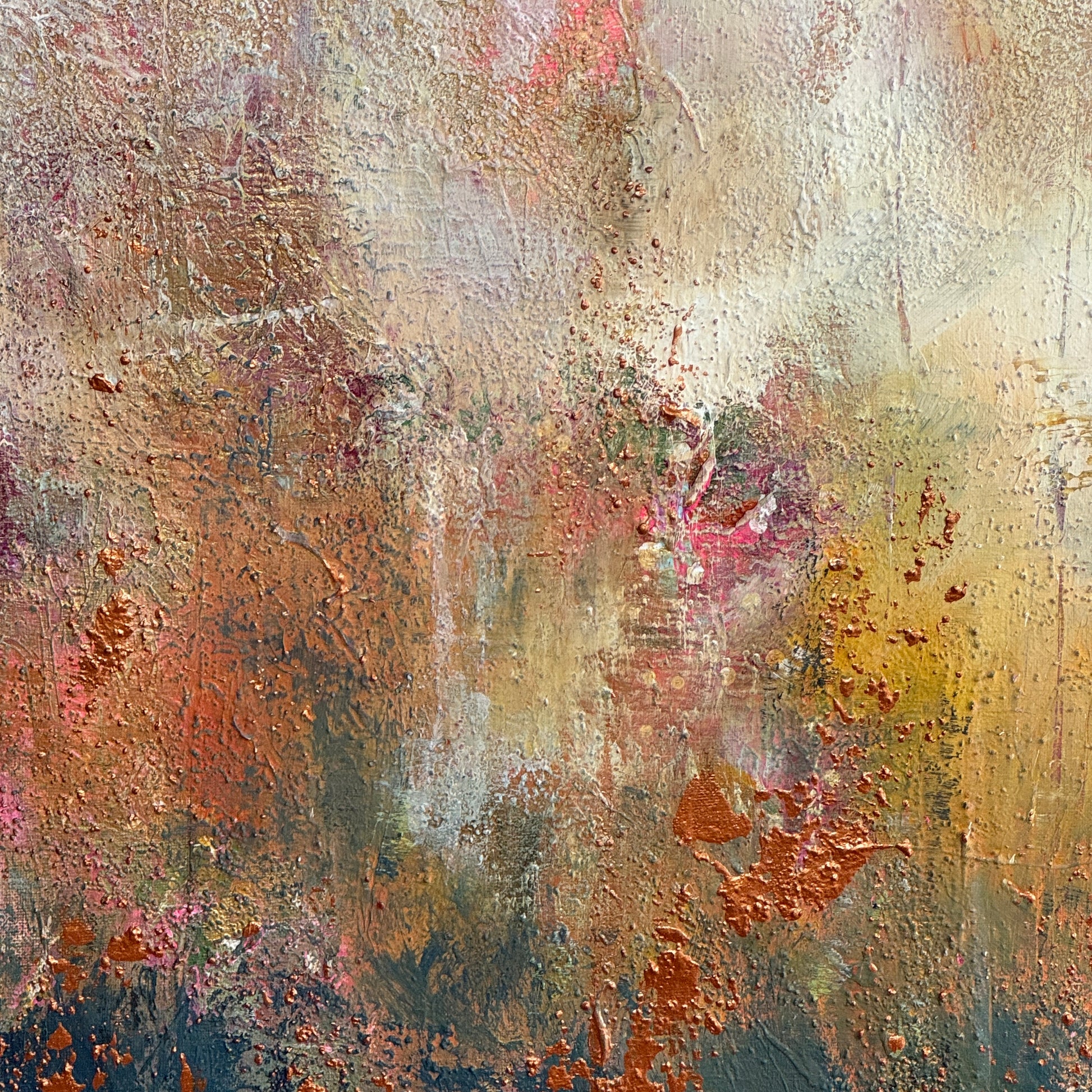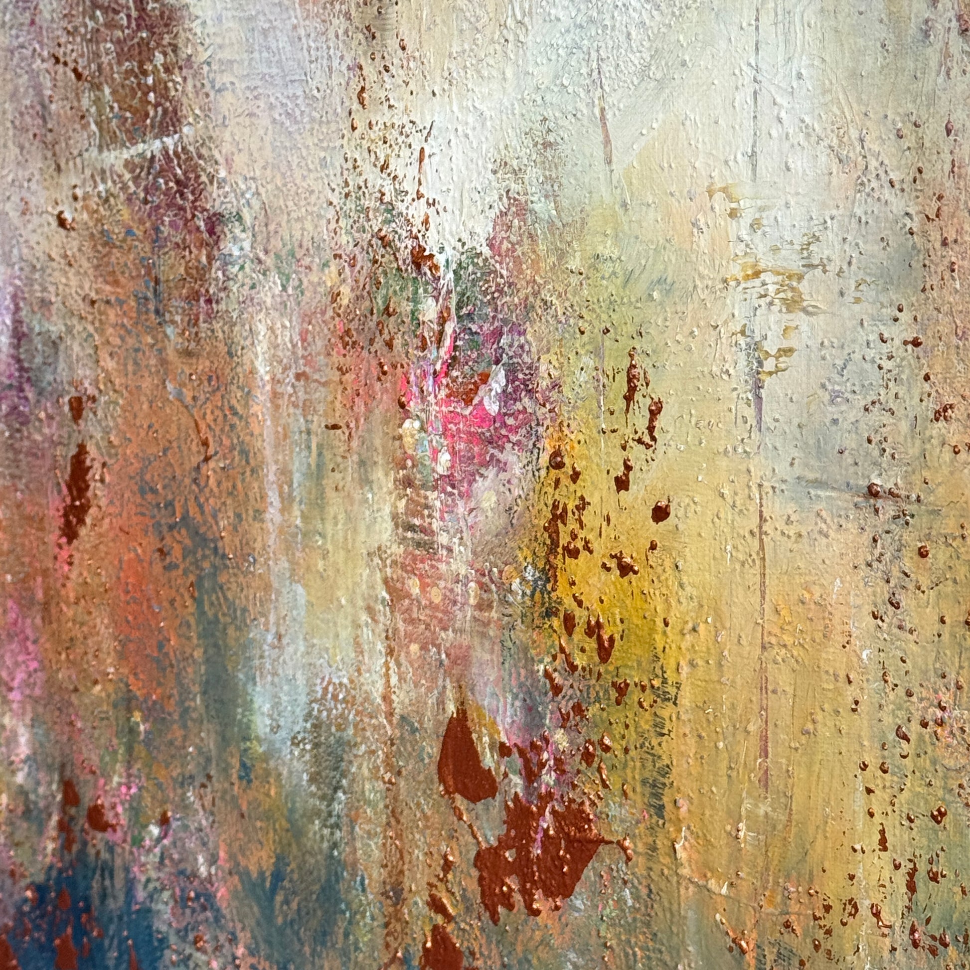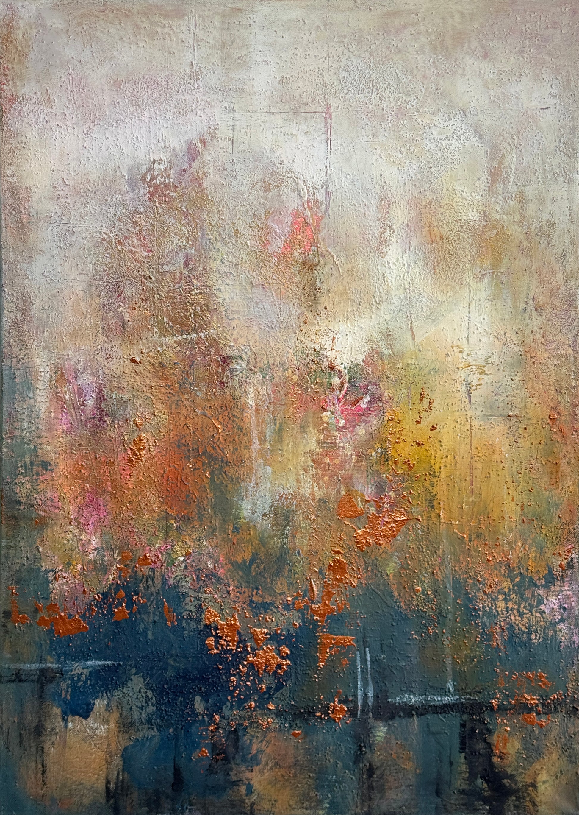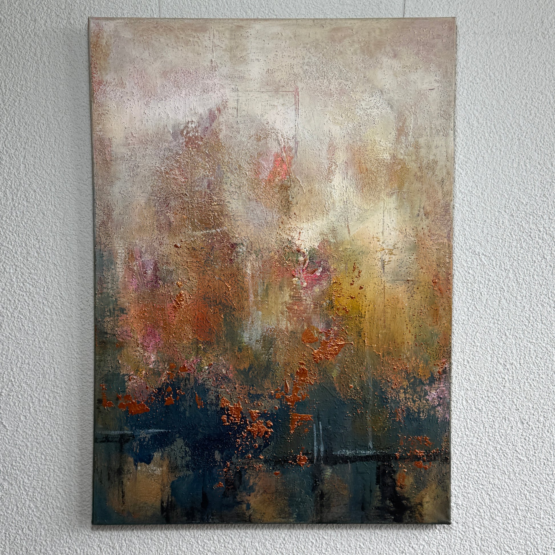 Ein sanfter Nebel scheint sich über die Leinwand zu legen, als würde der Herbst selbst leise flüstern. Warme Goldtöne und zarte Rosé-Nuancen mischen sich mit kühlen Blau- und Grauschichten, wie fallende Blätter, die im Spiel des Windes tanzen, bevor sie den Boden berühren.
