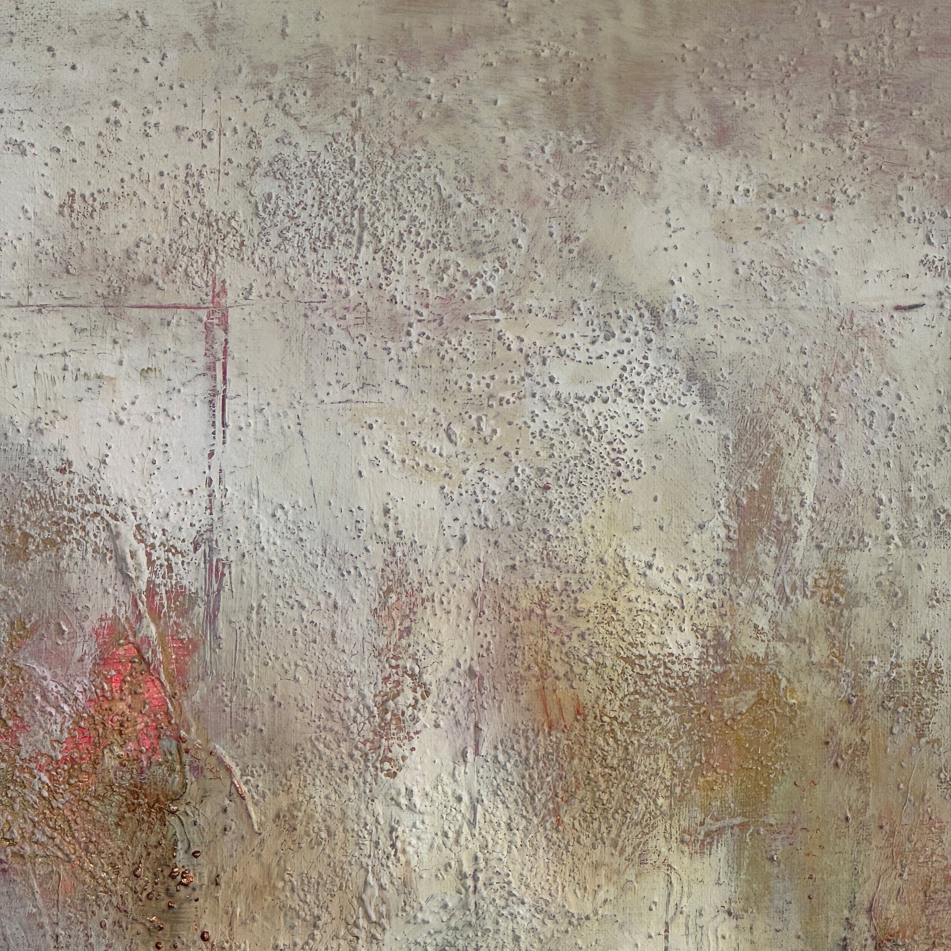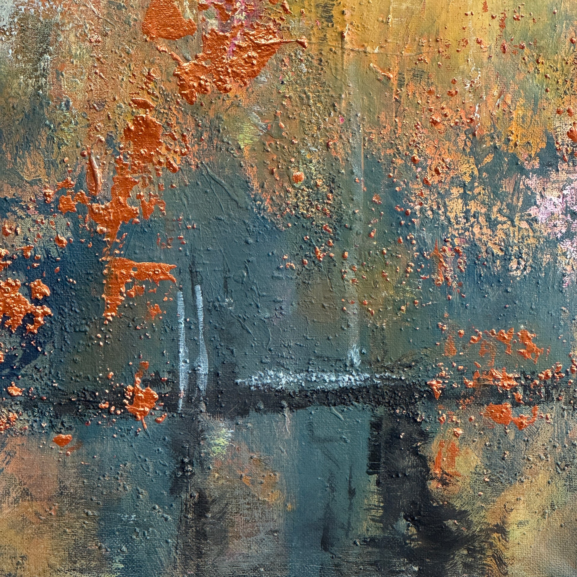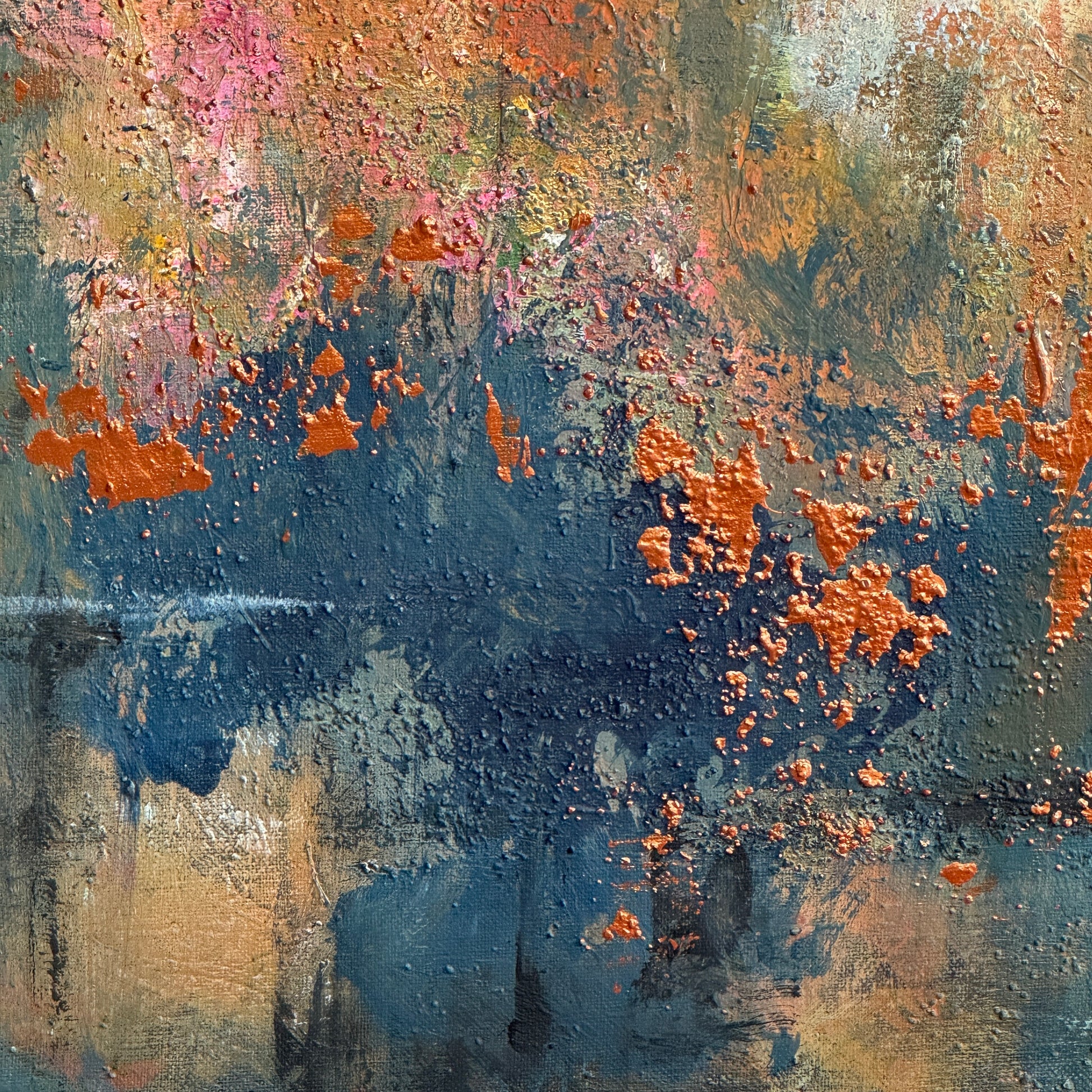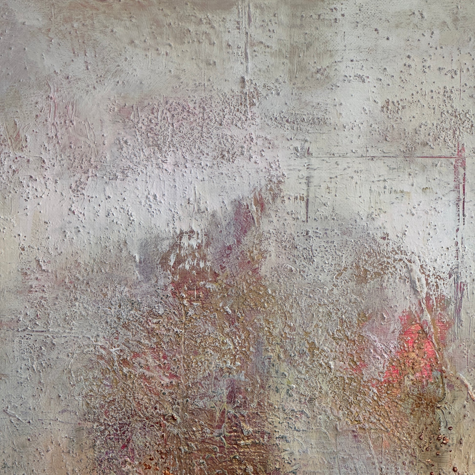 Ein sanfter Nebel scheint sich über die Leinwand zu legen, als würde der Herbst selbst leise flüstern. Warme Goldtöne und zarte Rosé-Nuancen mischen sich mit kühlen Blau- und Grauschichten, wie fallende Blätter, die im Spiel des Windes tanzen, bevor sie den Boden berühren.