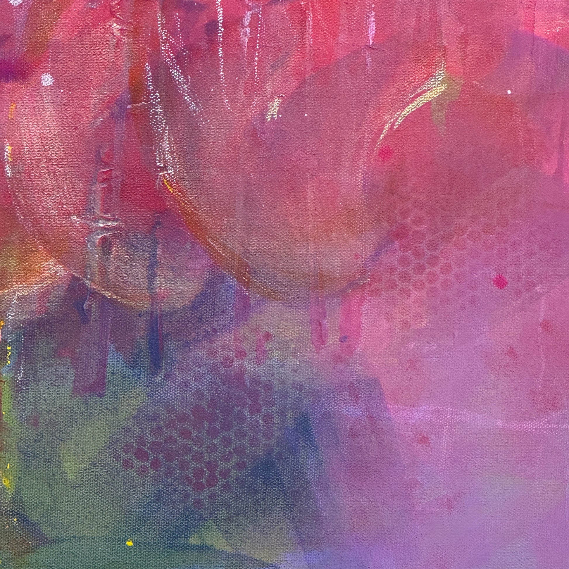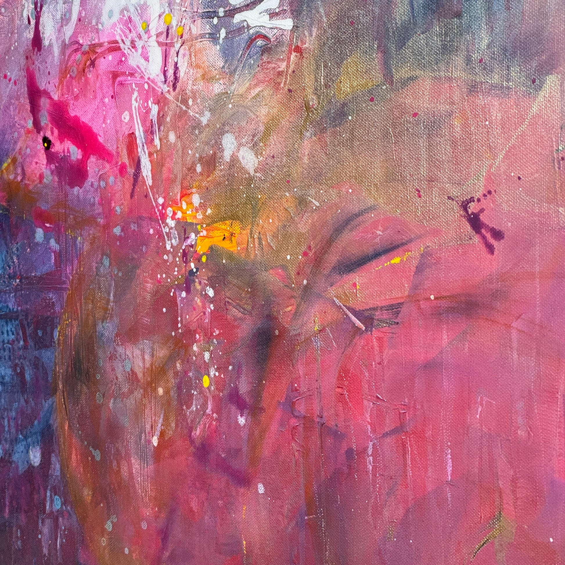 Zwischen sanften Rosa- und Violetttönen entfaltet sich seine Gestalt, fast schemenhaft, als würde er gerade erst entstehen.