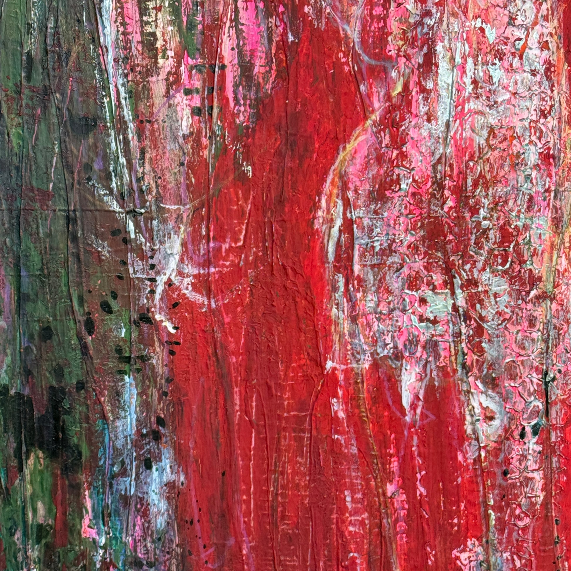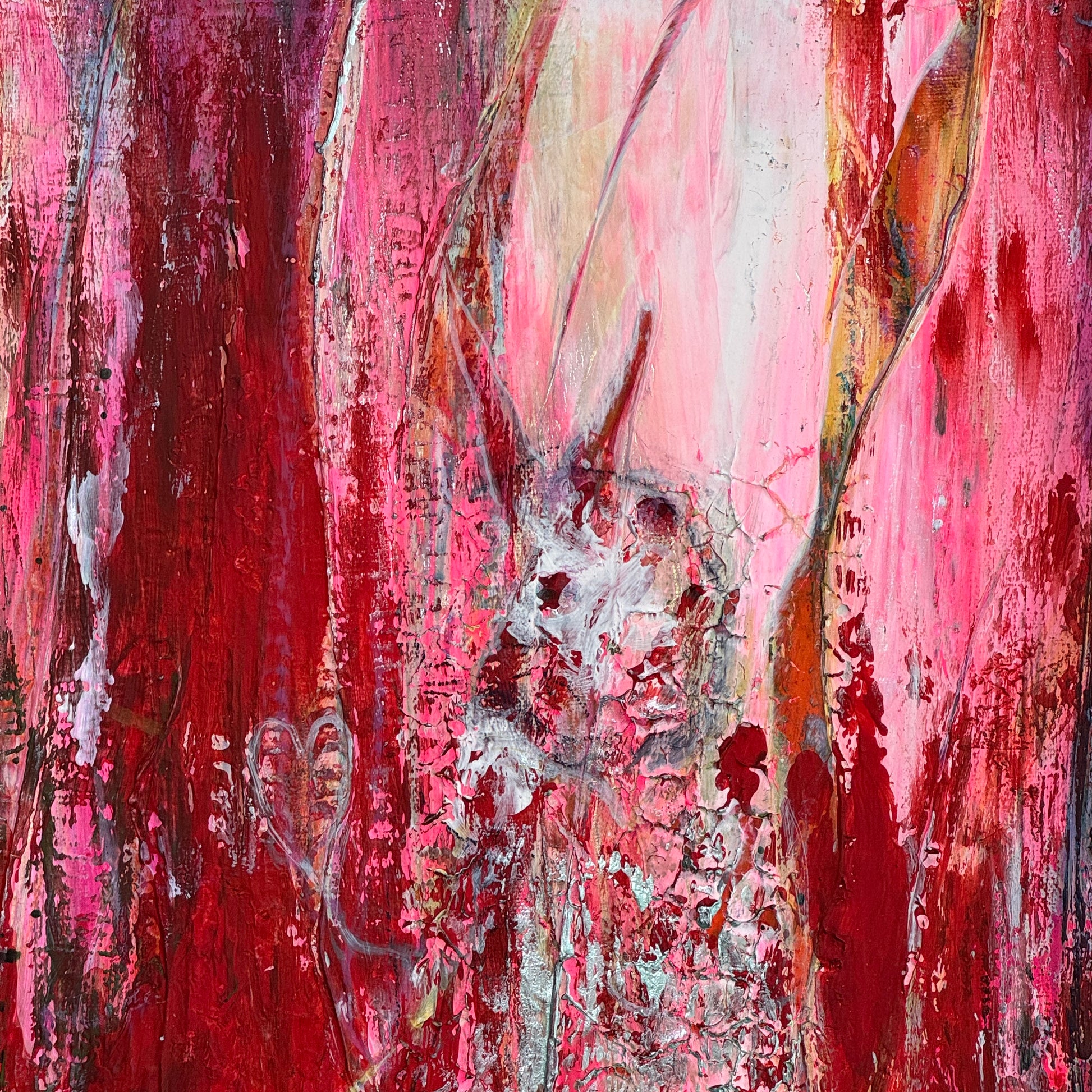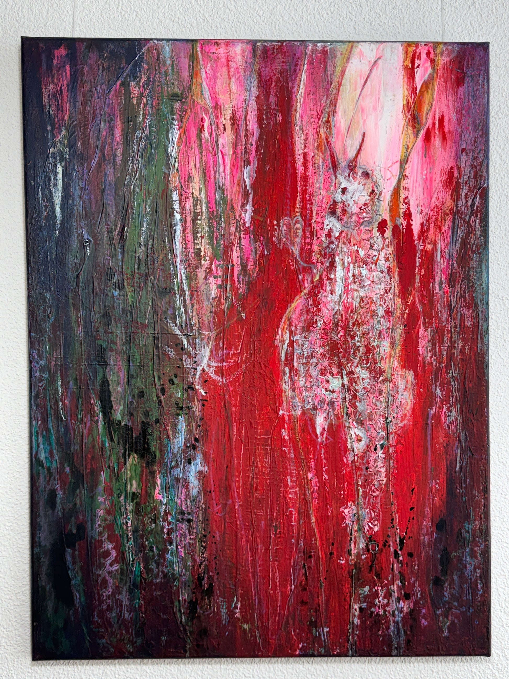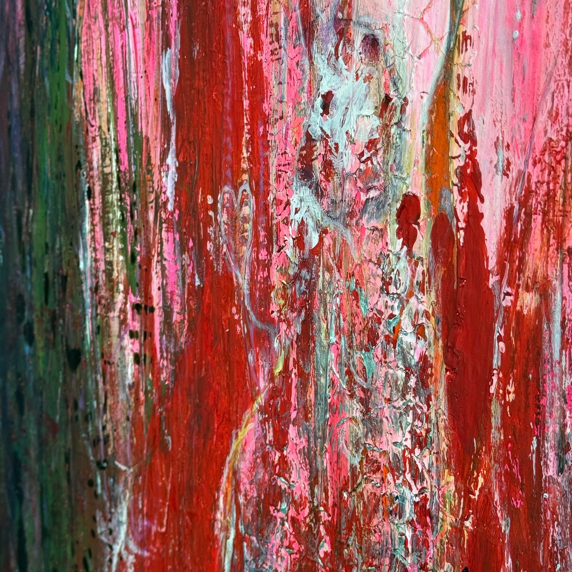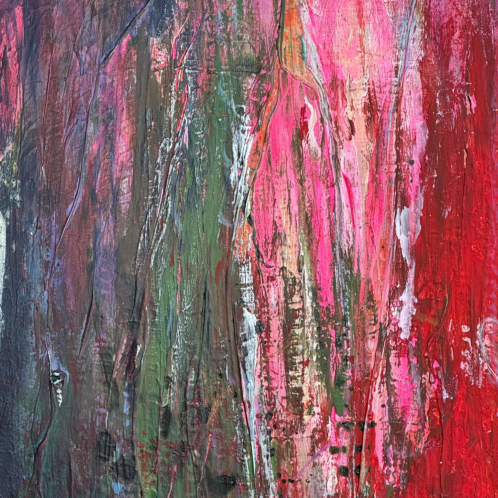 Die intensiven Rot- und Pinktöne treffen auf düstere Grüntöne und tiefes Schwarz, als würden zwei Welten miteinander verschmelzen – die sichtbare und die verborgene.