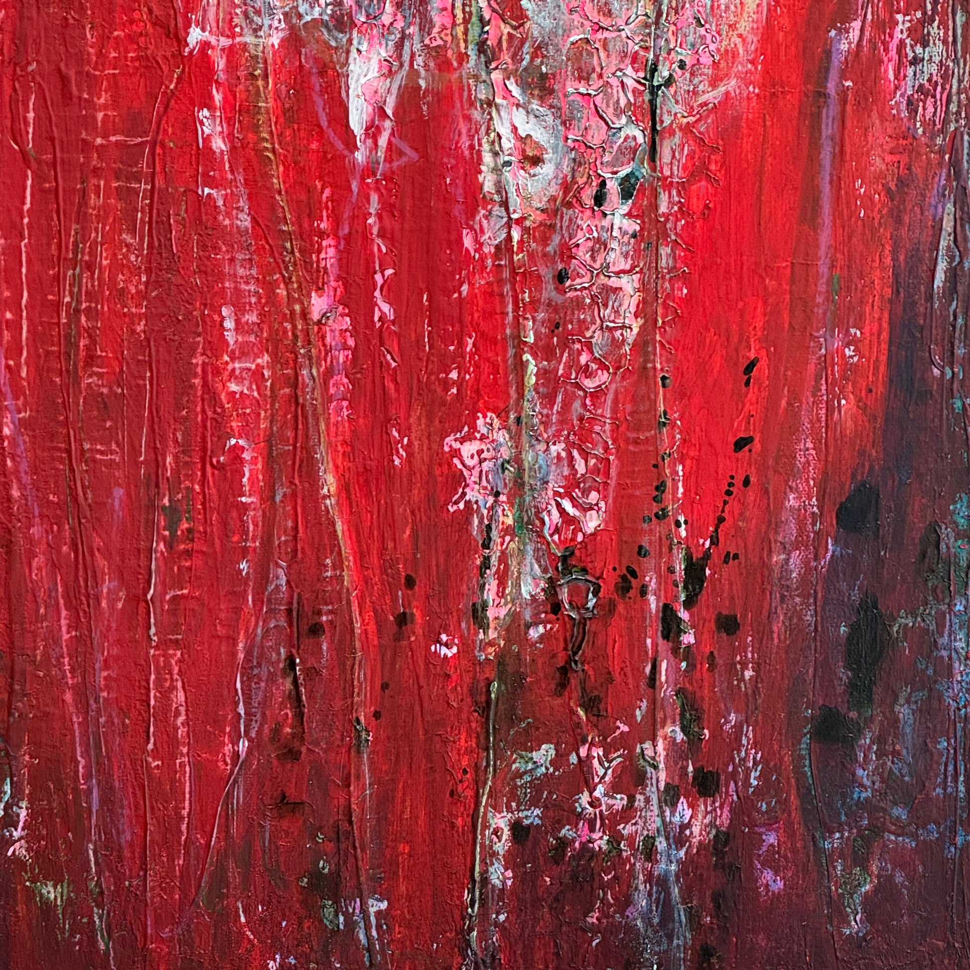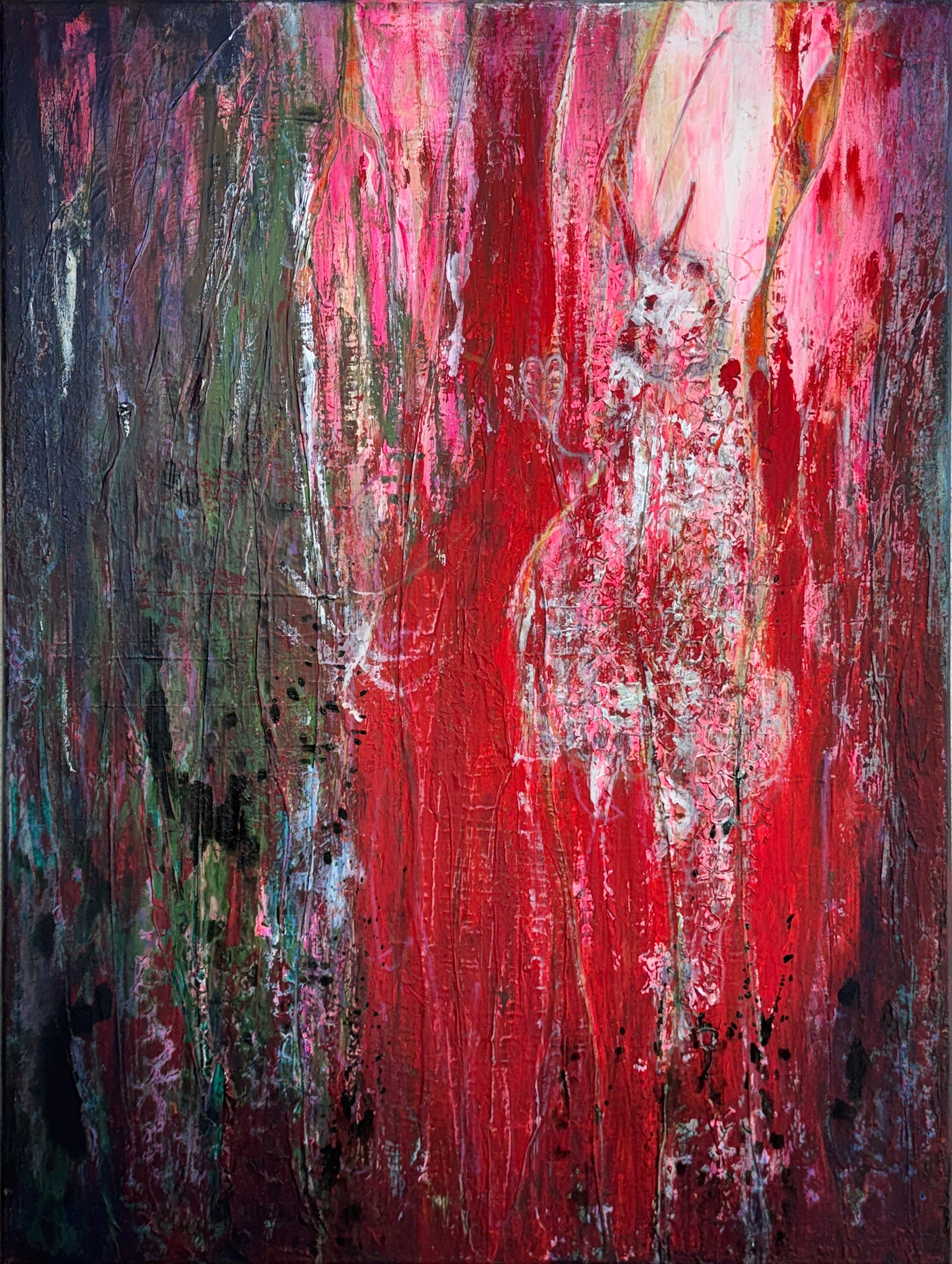 Aus den Tiefen eines verborgenen Waldes erwacht eine geheimnisvolle Gestalt – halb gesehen, halb erahnt. Rot wie flüssiges Feuer ergießt sich die Farbe über die Leinwand, als würde das Bild selbst atmen. Zwischen Strukturen, die an uralte Bäume erinnern, verbirgt sich eine Präsenz, die sich dem Blick nicht ganz offenbart.