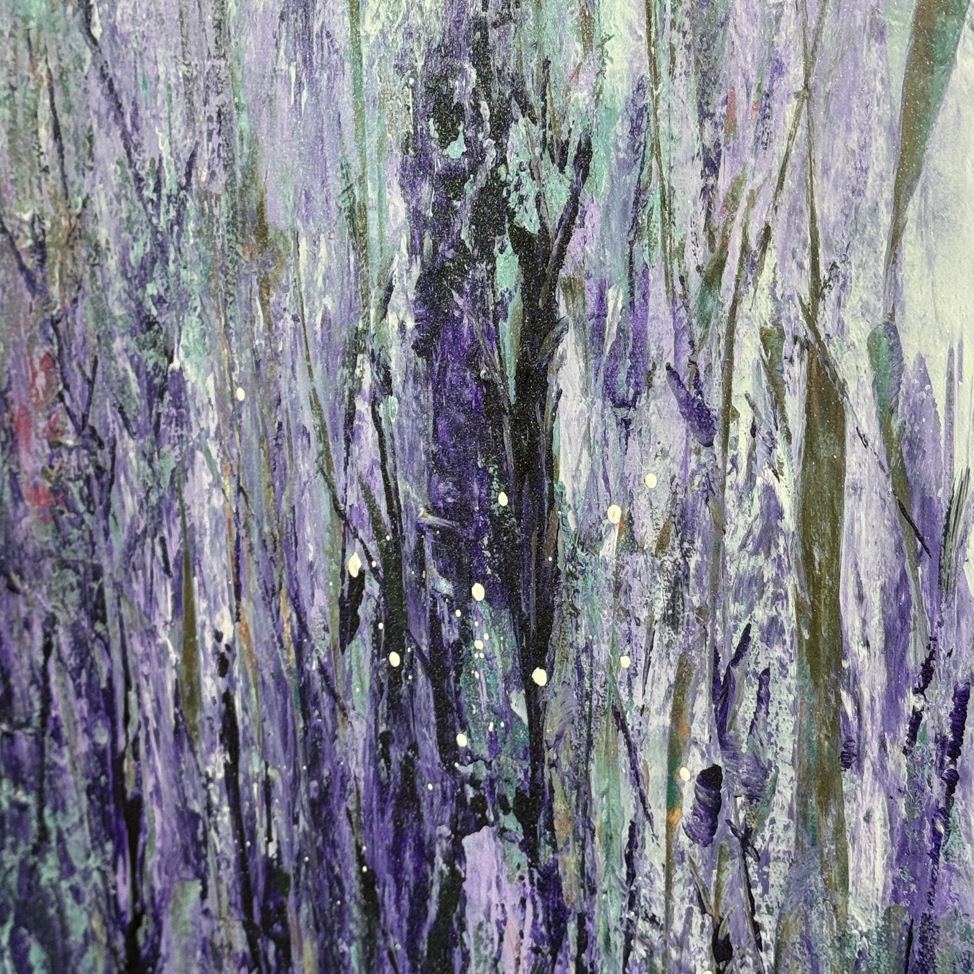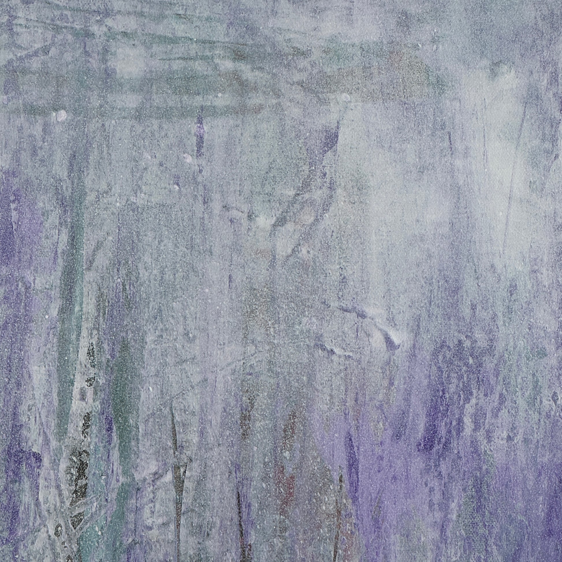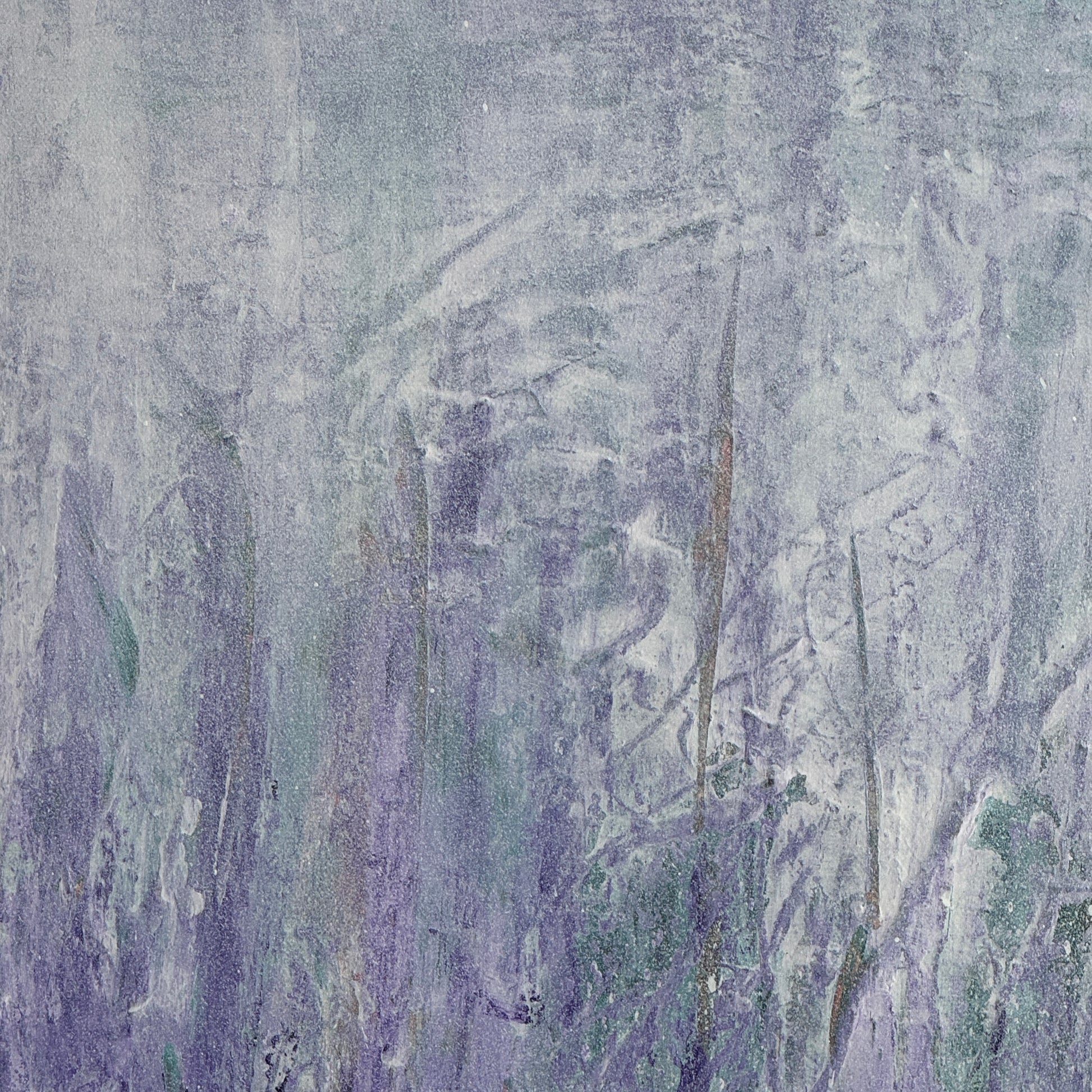 Ein Nebel aus zarten Violett- und Fliedertönen breitet sich über die Leinwand aus. In der unteren Bildhälfte erheben sich wilde, abstrakte Formen, die an Lavendelfelder im sanften Morgenlicht erinnern. Die kräftigen, dunkleren Pinselstriche am Boden erzeugen Tiefe, während feine Linien wie duftende Halme und Blüten in den helleren, nebligen Hintergrund aufsteigen.