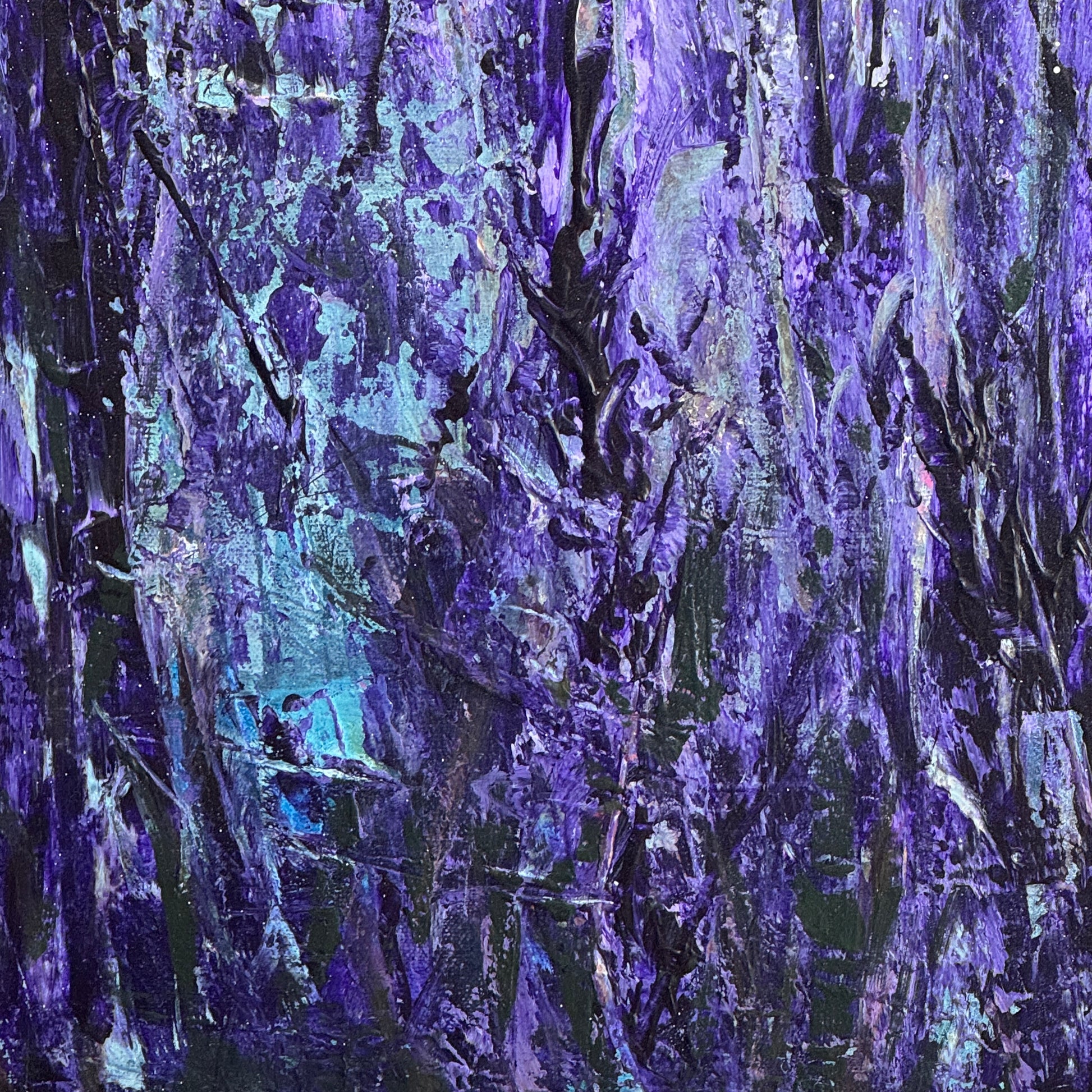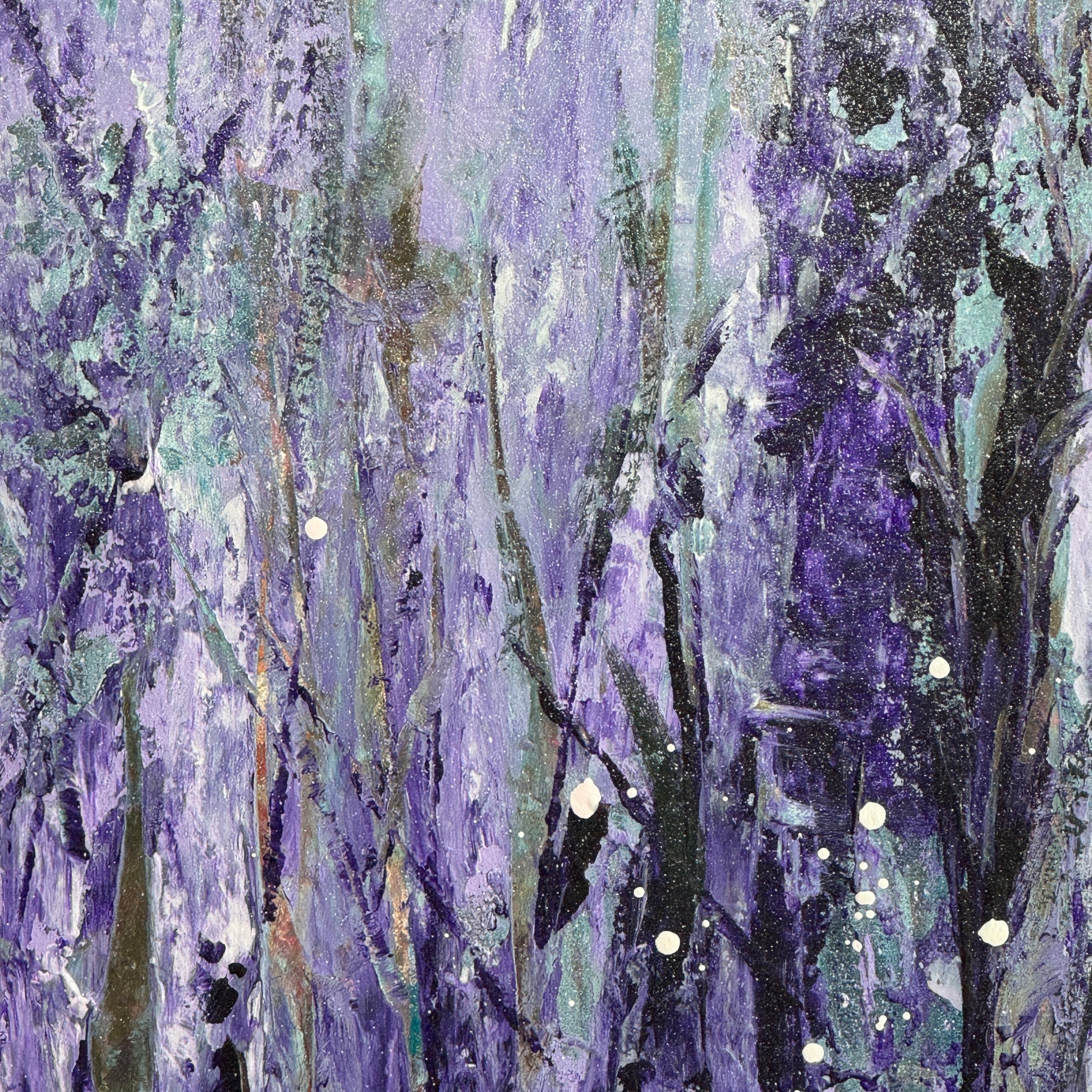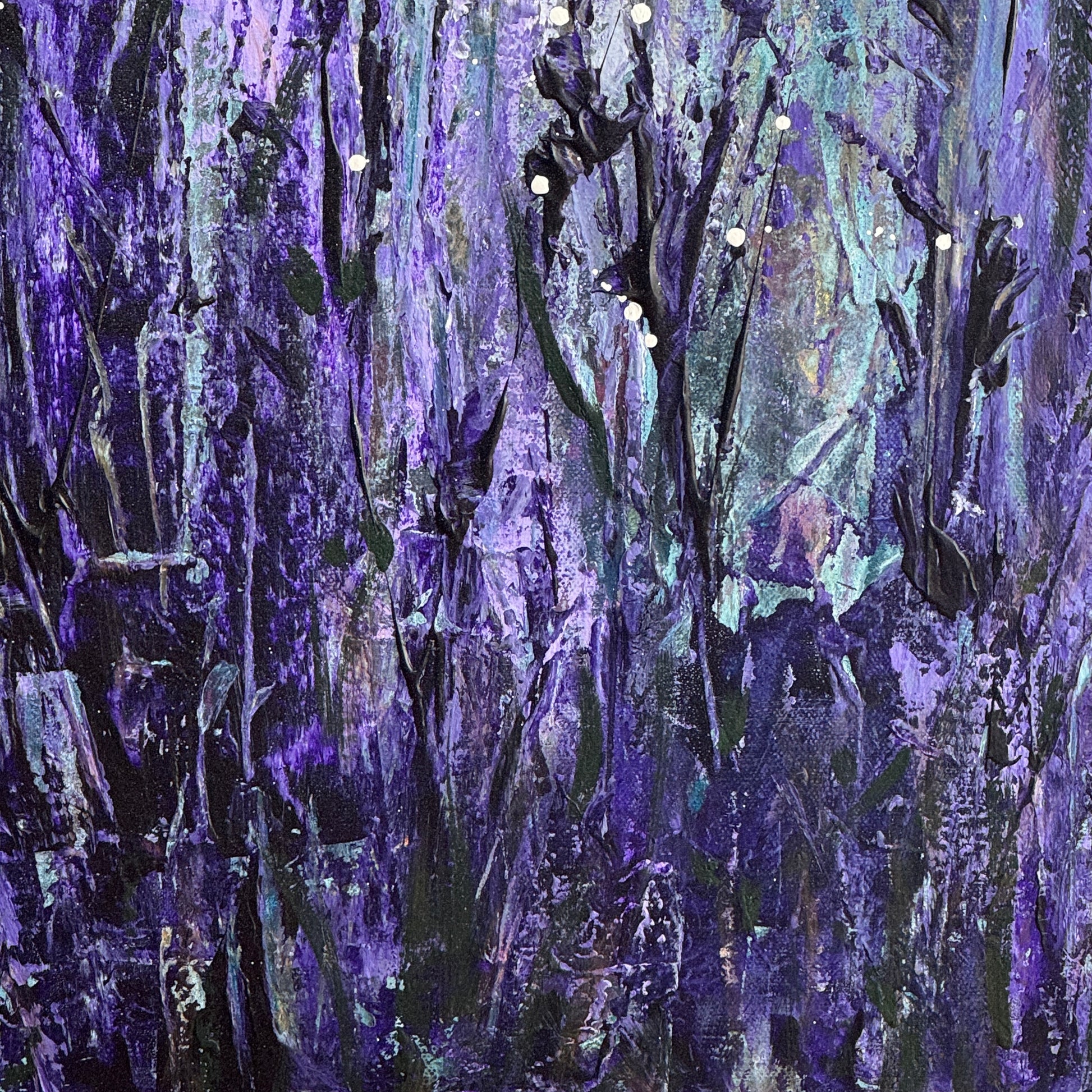 Ein Nebel aus zarten Violett- und Fliedertönen breitet sich über die Leinwand aus. In der unteren Bildhälfte erheben sich wilde, abstrakte Formen, die an Lavendelfelder im sanften Morgenlicht erinnern. Die kräftigen, dunkleren Pinselstriche am Boden erzeugen Tiefe, während feine Linien wie duftende Halme und Blüten in den helleren, nebligen Hintergrund aufsteigen.