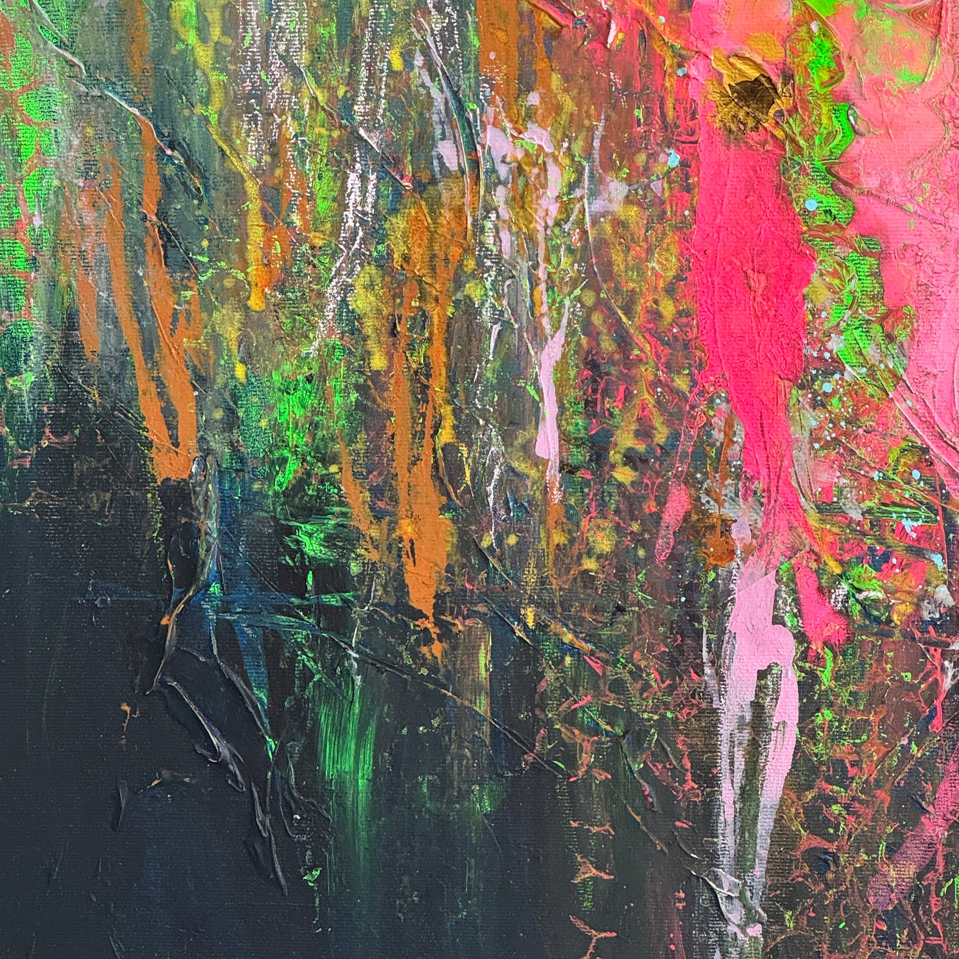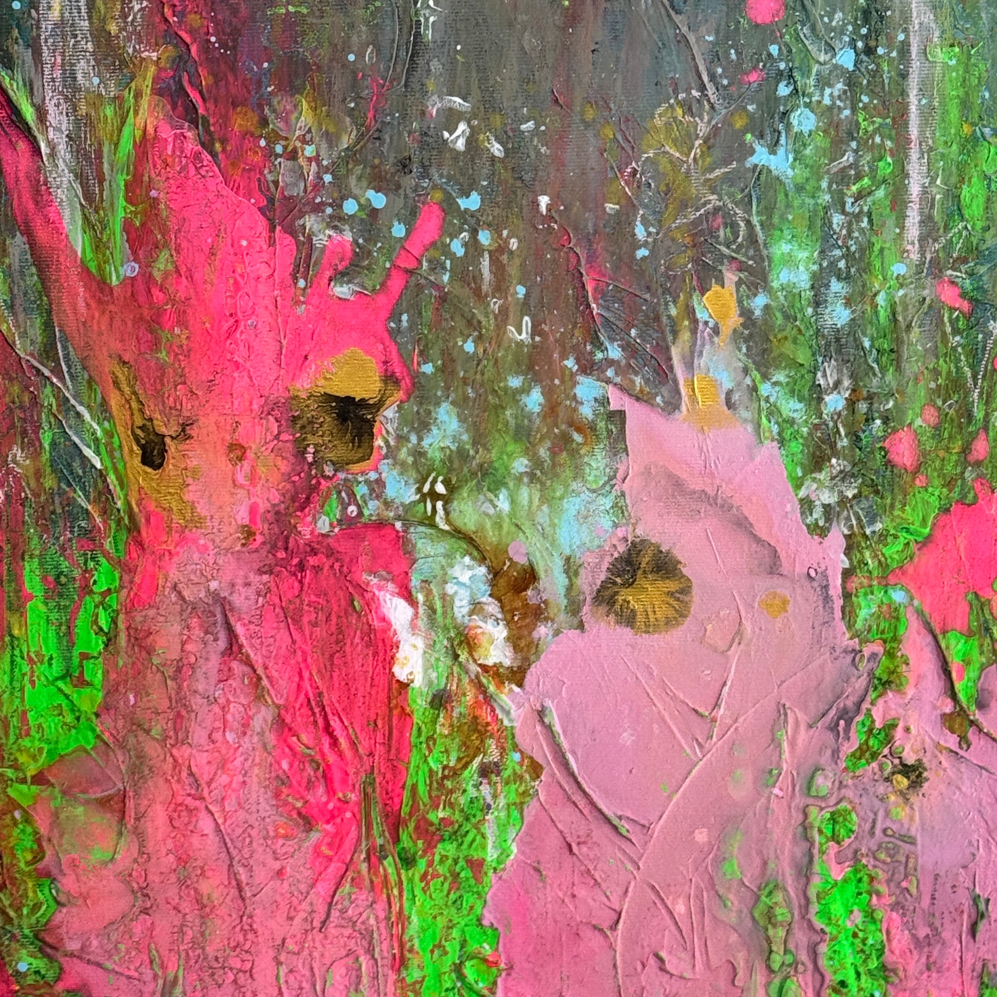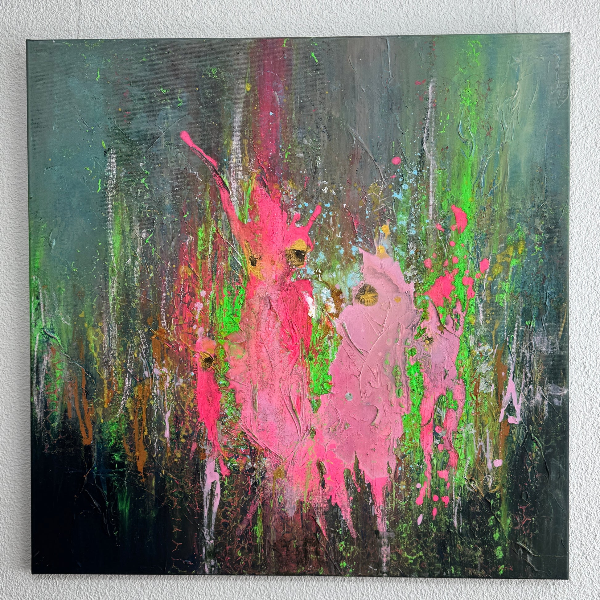 „Papageien im Gespräch“ ist ein ausdrucksstarkes, abstraktes Kunstwerk, das mit lebendigen Neonfarben und dynamischen Pinselstrichen fasziniert. Kräftige Pink- und Grüntöne verschmelzen in energetischen Formen und erinnern an zwei Papageien, die in einem lebhaften Dialog stehen. Die Tiefe des dunklen Hintergrunds lässt die leuchtenden Farben noch intensiver strahlen und verleiht dem Bild eine geheimnisvolle, fast tropische Atmosphäre. Ein echter Blickfang, der jedem Raum eine moderne, energiegeladene Note verleiht.