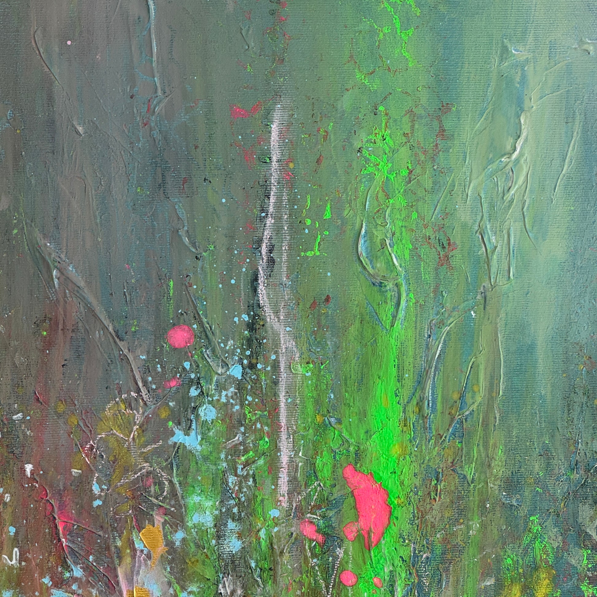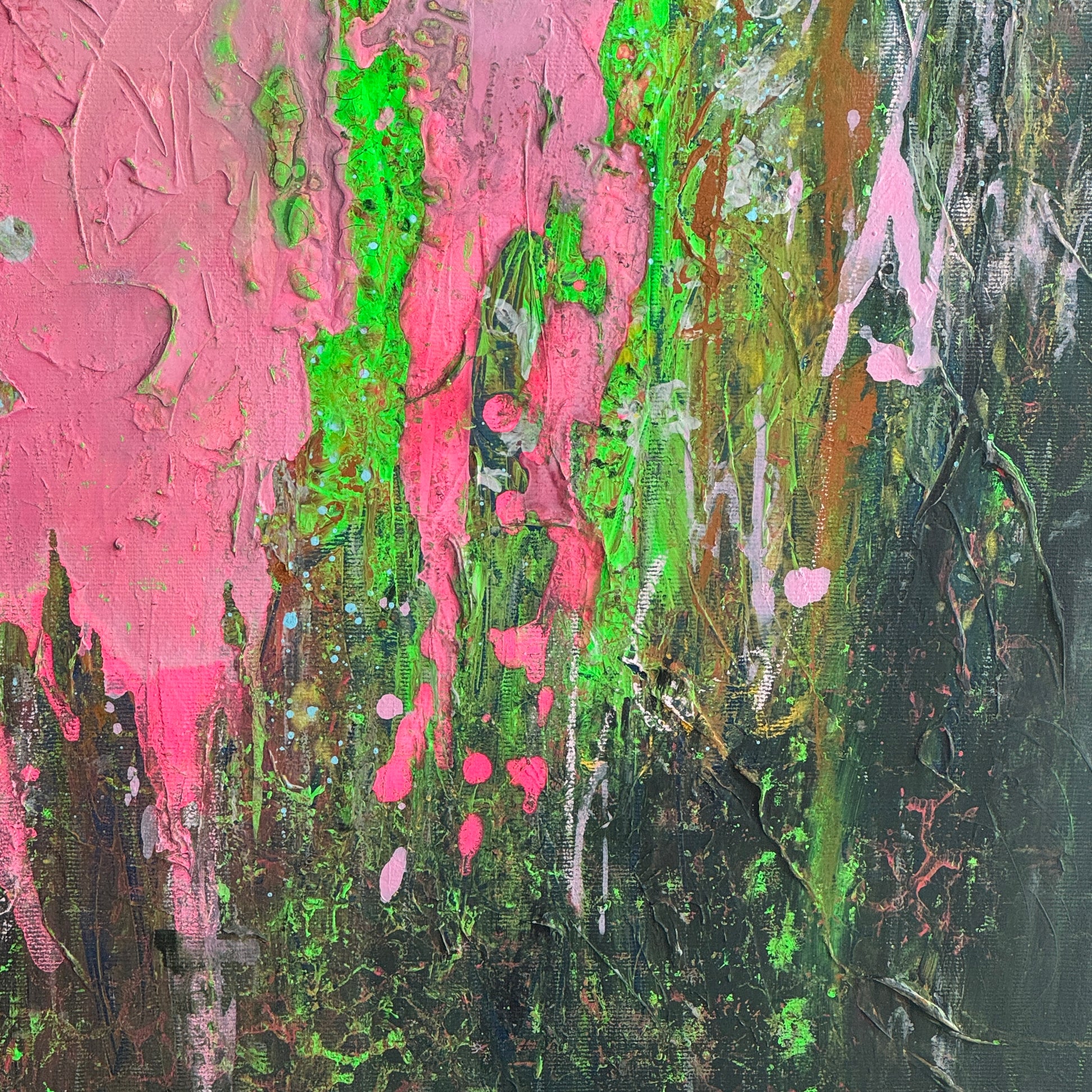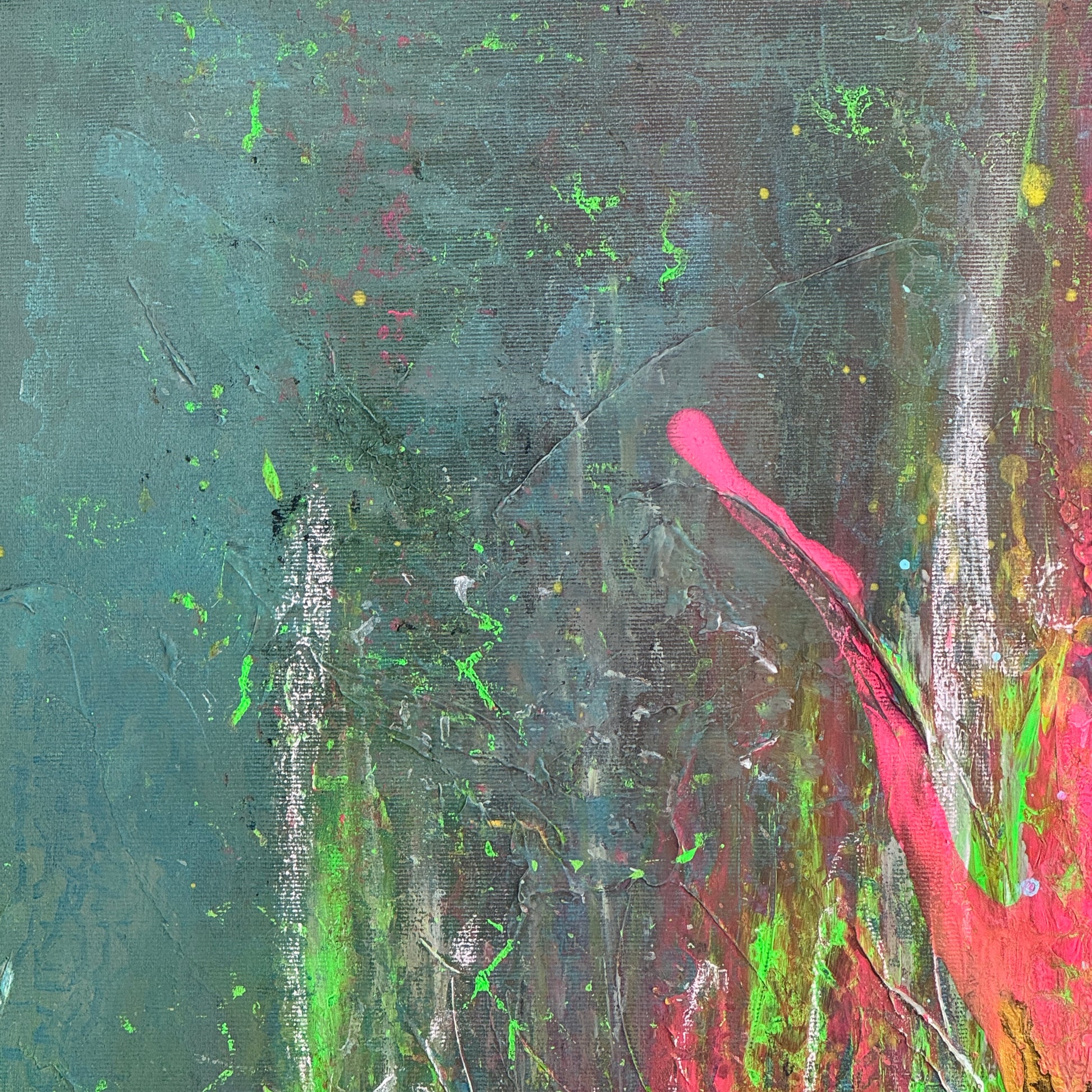 „Papageien im Gespräch“ ist ein ausdrucksstarkes, abstraktes Kunstwerk, das mit lebendigen Neonfarben und dynamischen Pinselstrichen fasziniert. Kräftige Pink- und Grüntöne verschmelzen in energetischen Formen und erinnern an zwei Papageien, die in einem lebhaften Dialog stehen. Die Tiefe des dunklen Hintergrunds lässt die leuchtenden Farben noch intensiver strahlen und verleiht dem Bild eine geheimnisvolle, fast tropische Atmosphäre. Ein echter Blickfang, der jedem Raum eine moderne, energiegeladene Note verleiht.
