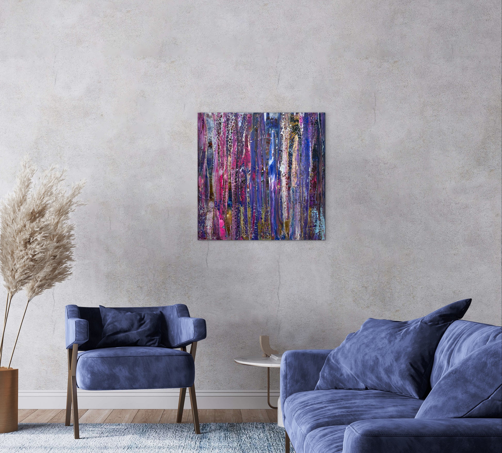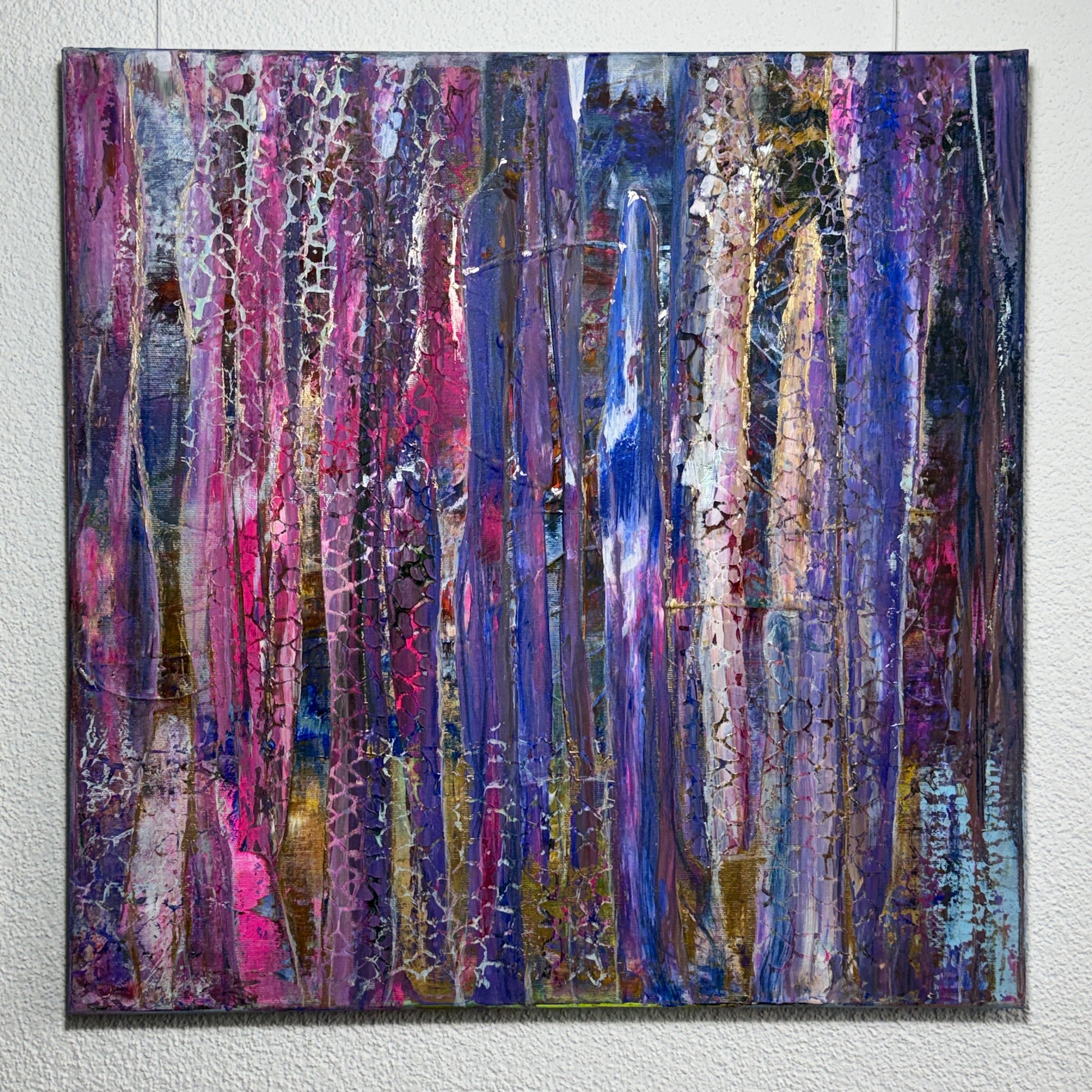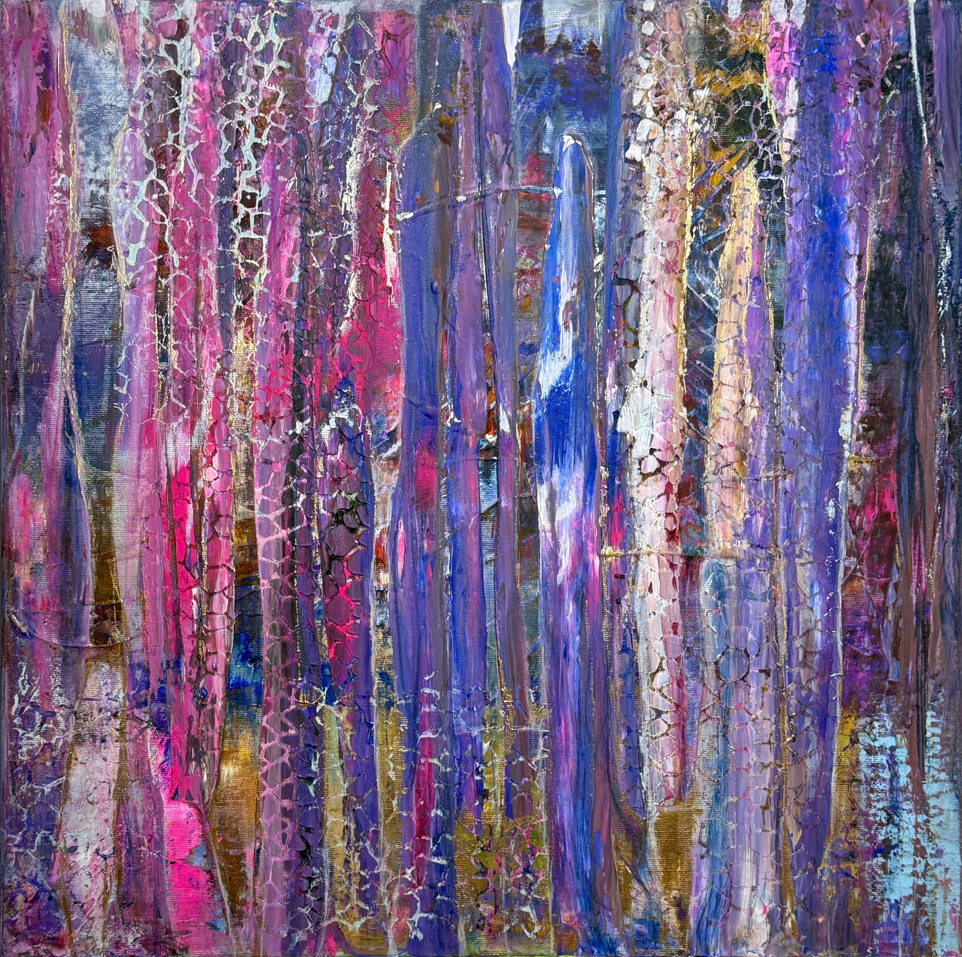 Wie ein leiser Vorhang aus Licht senken sich die Farben herab – Schicht um Schicht, Schleier um Schleier. Violett flüstert von Tiefe und Geheimnis, während leuchtendes Pink wie ein Herzschlag durch die vertikalen Bahnen pulsiert. Dazwischen schimmern kühle Blautöne, als würden sie verborgene Räume öffnen, in denen Erinnerungen wohnen.
