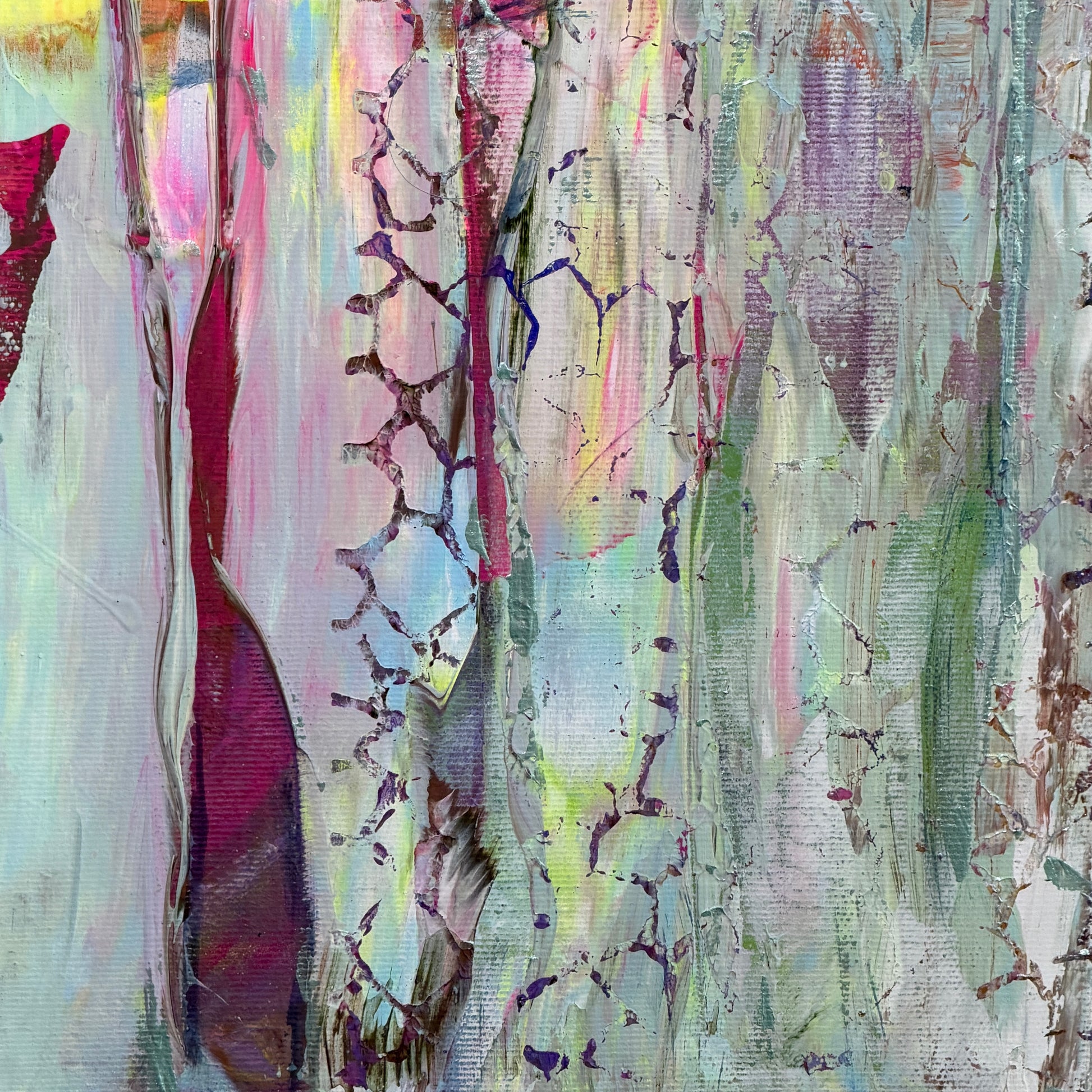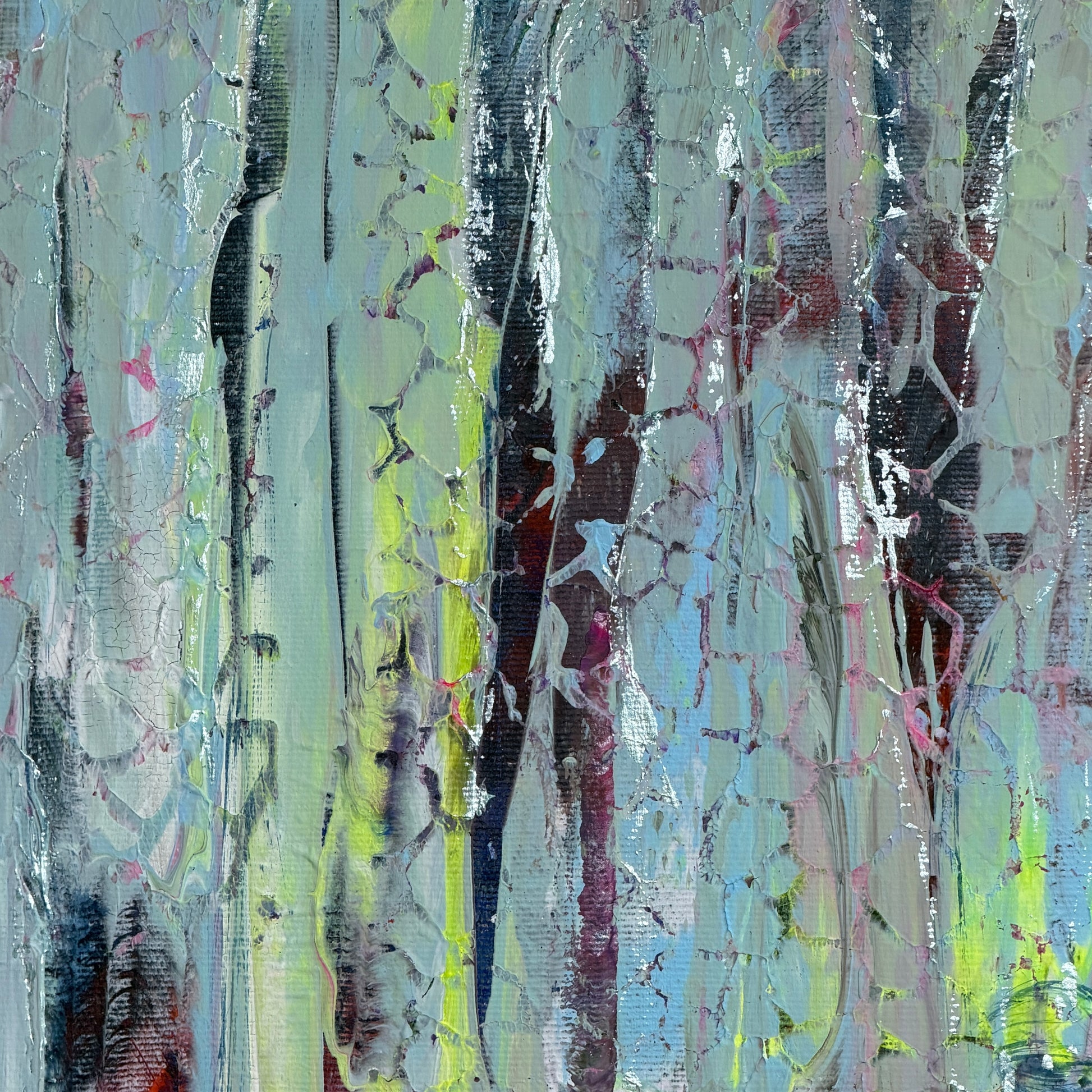 Ich habe dieses Bild gemalt wie man einen Moment festhält, der eigentlich weiterfließen will. Nicht mit klaren Konturen, sondern mit Spuren. Schicht um Schicht habe ich Farbe gelegt, wieder abgenommen, verwischt, freigelegt – wie Erinnerung: nie ganz sauber, nie ganz eindeutig, aber wahr in ihrem Zittern.