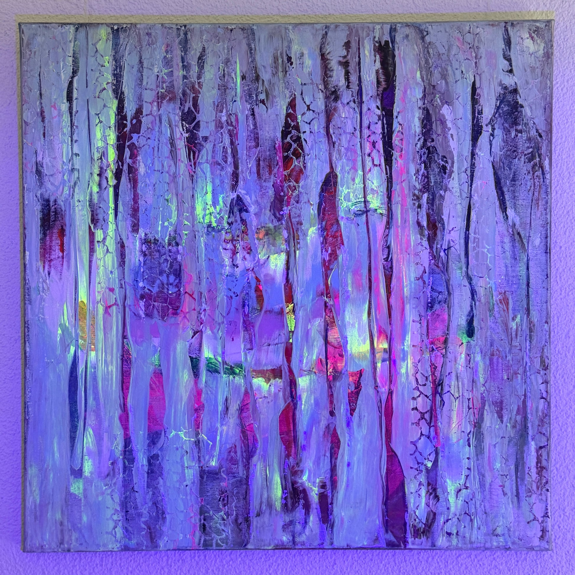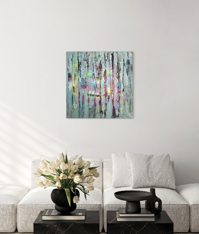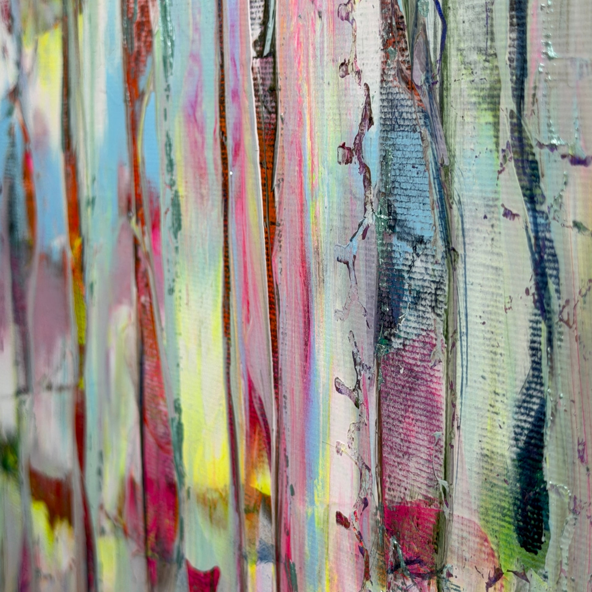 Die Vertikalen sind mein Regen. Er fällt nicht nur vom Himmel, er fällt durch die Zeit. Er zieht Linien über das, was einmal leuchtete, und lässt es trotzdem durchscheinen: ein Pink, das wie ein heimlicher Puls bleibt, ein Gelb wie ein kurzer Aufbruch, Blau wie Atem, Rot wie etwas, das sich nicht beruhigen lässt. Alles ist da, aber nichts schreit. Die Farben reden leise, als würden sie sich gegenseitig trösten.