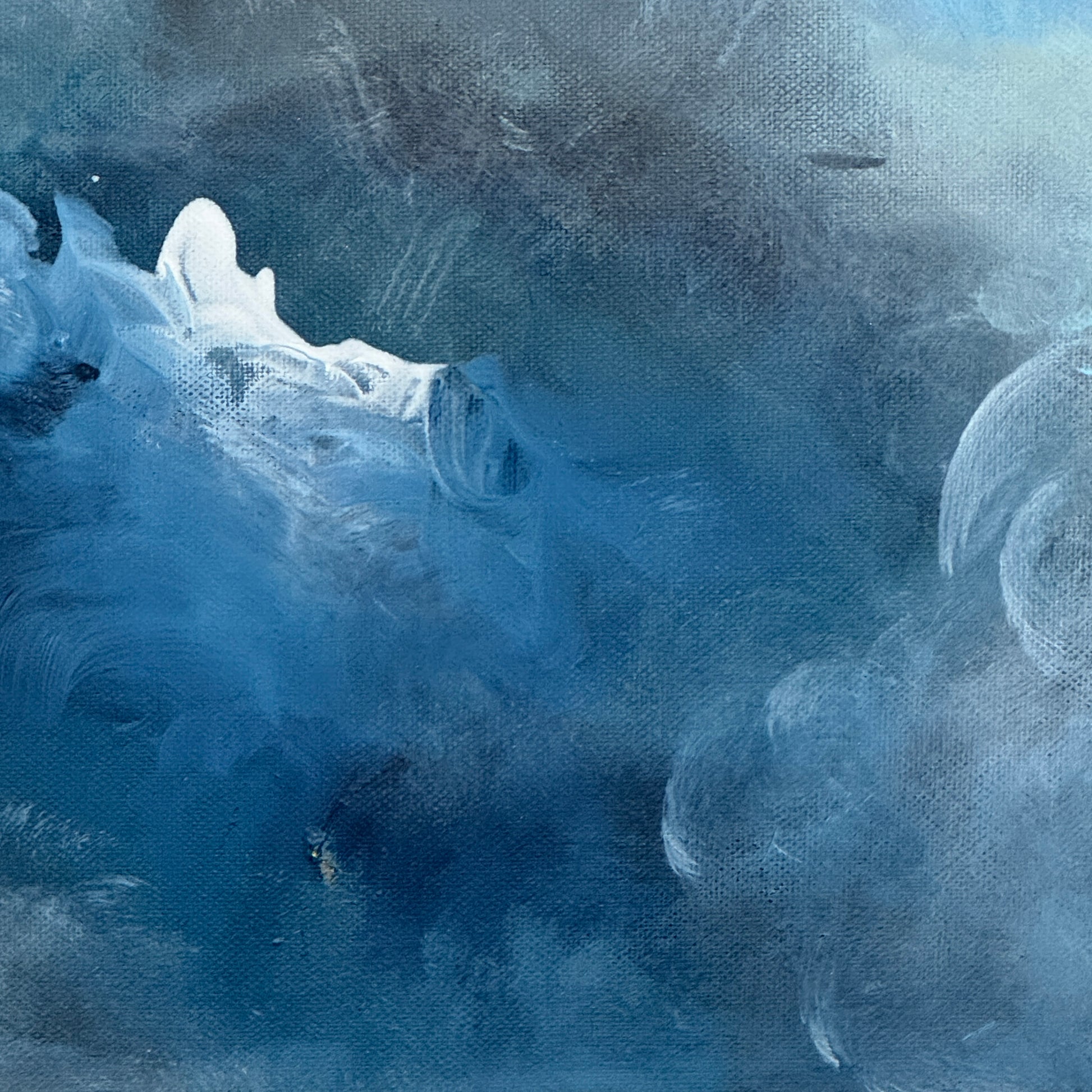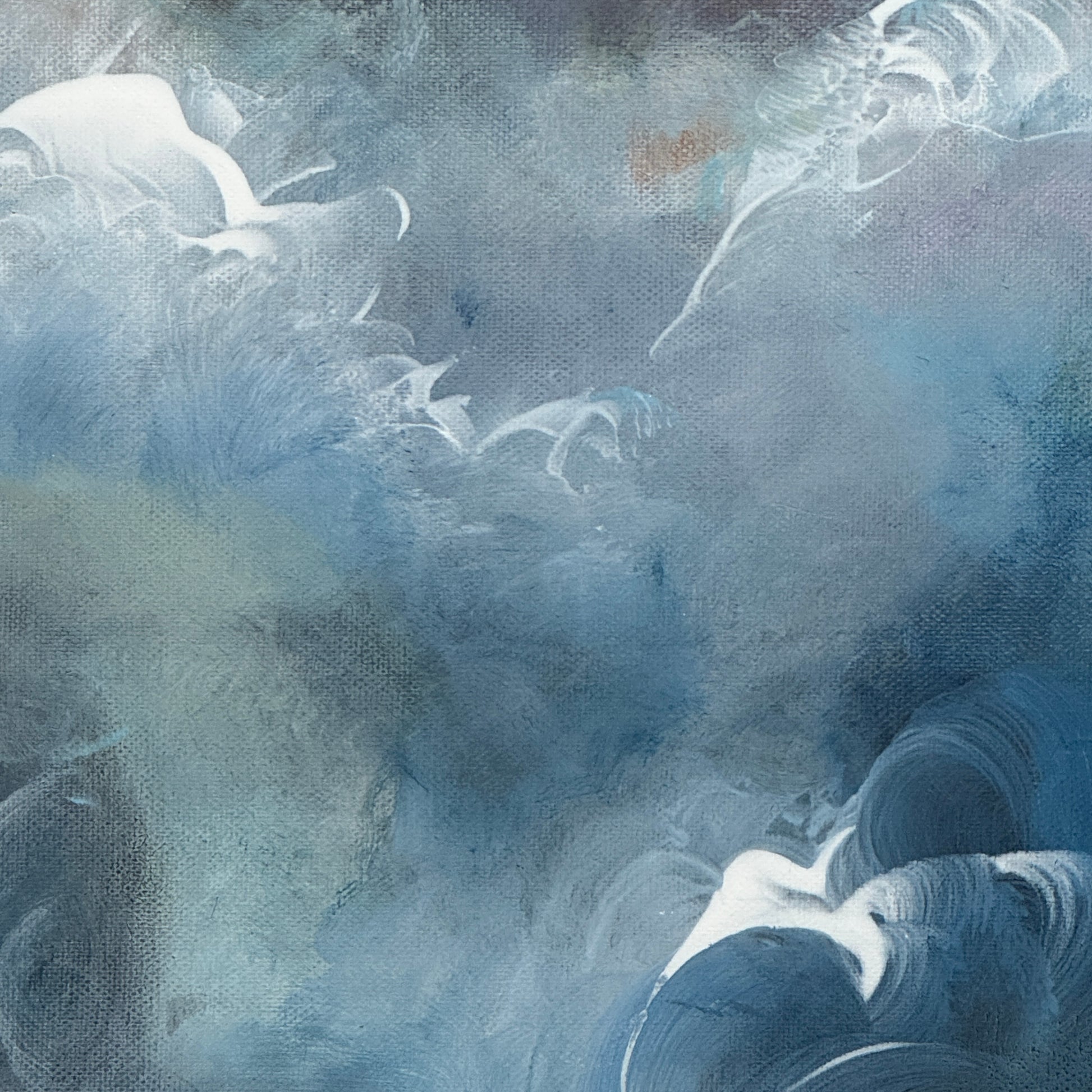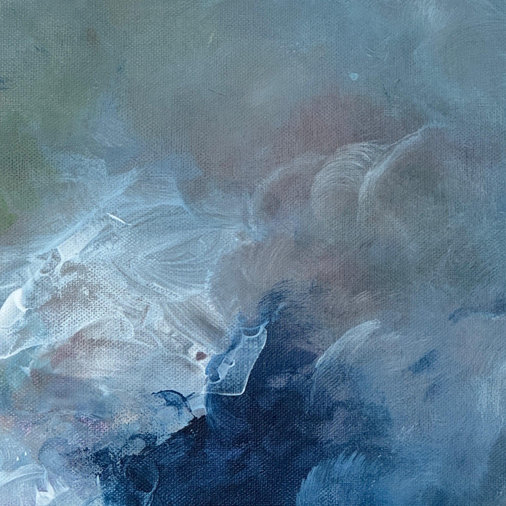 Dieses Werk ist eine Einladung, sich in den unergründlichen Weiten des eigenen Inneren zu verlieren. Die Nebel, die sich über die Leinwand ergießen, erinnern an die Schleier der Erinnerung, an Gedanken, die sich zwischen Klarheit und Vergessen bewegen. In den tiefen Blautönen liegt die Schwere des Unausgesprochenen, während die sanften Lichtströme wie leise Versprechen durch die Dunkelheit dringen.