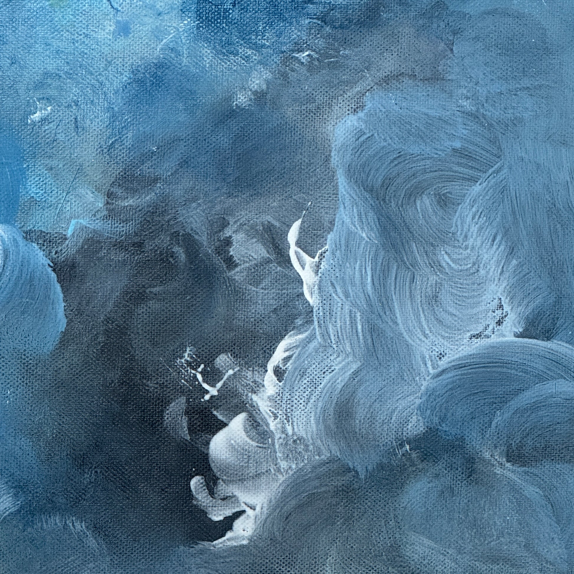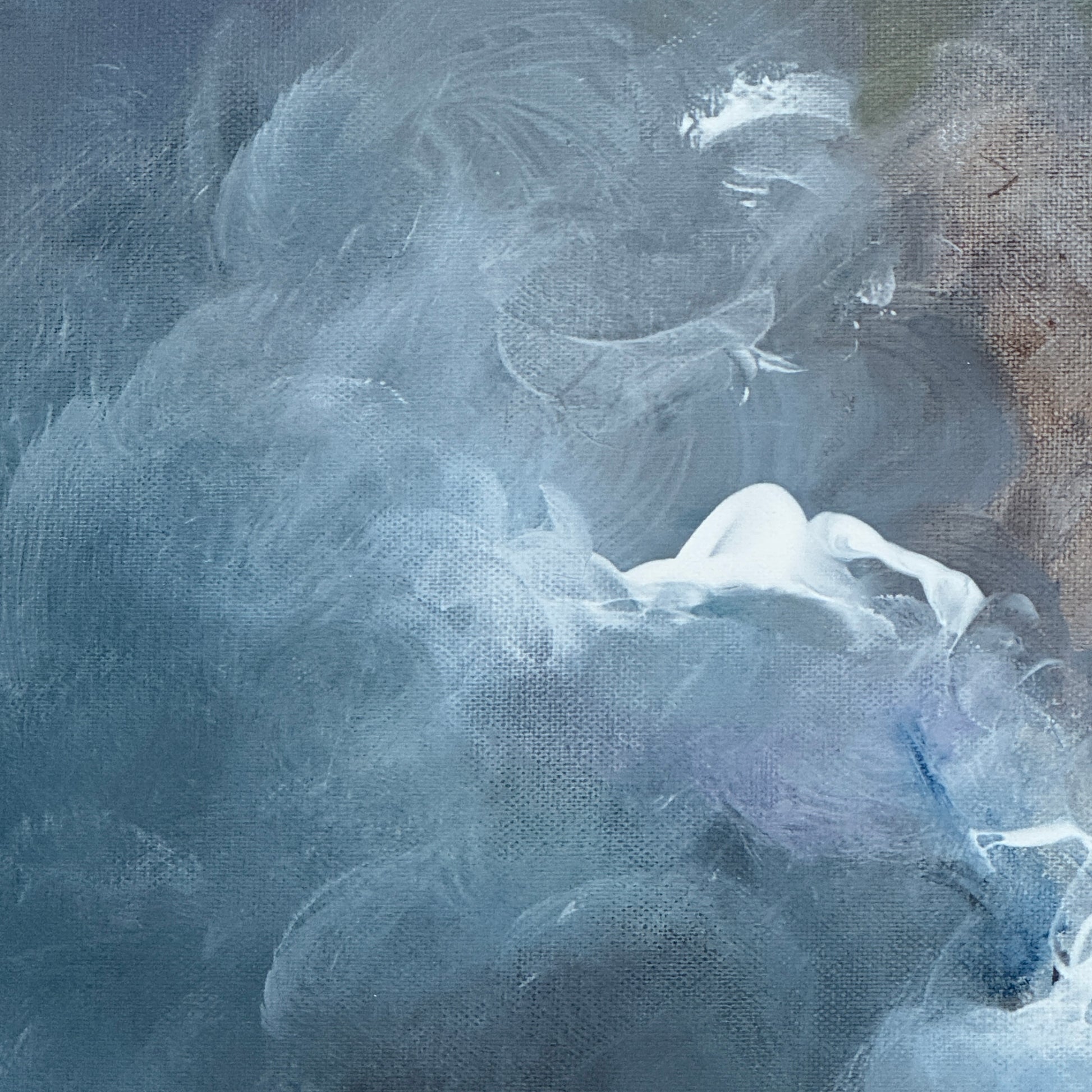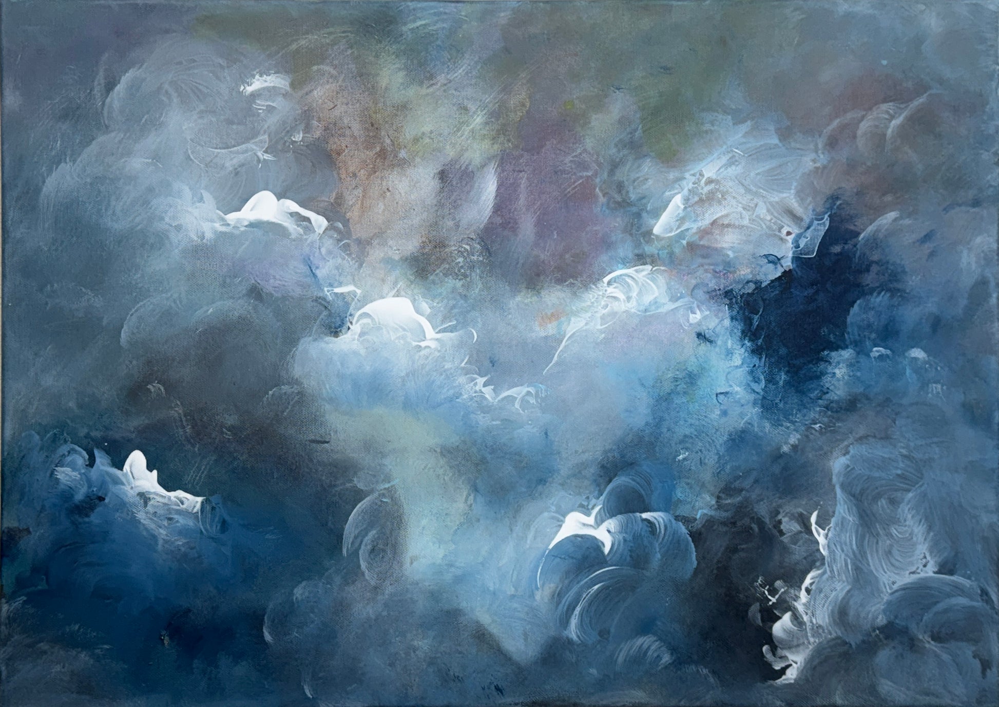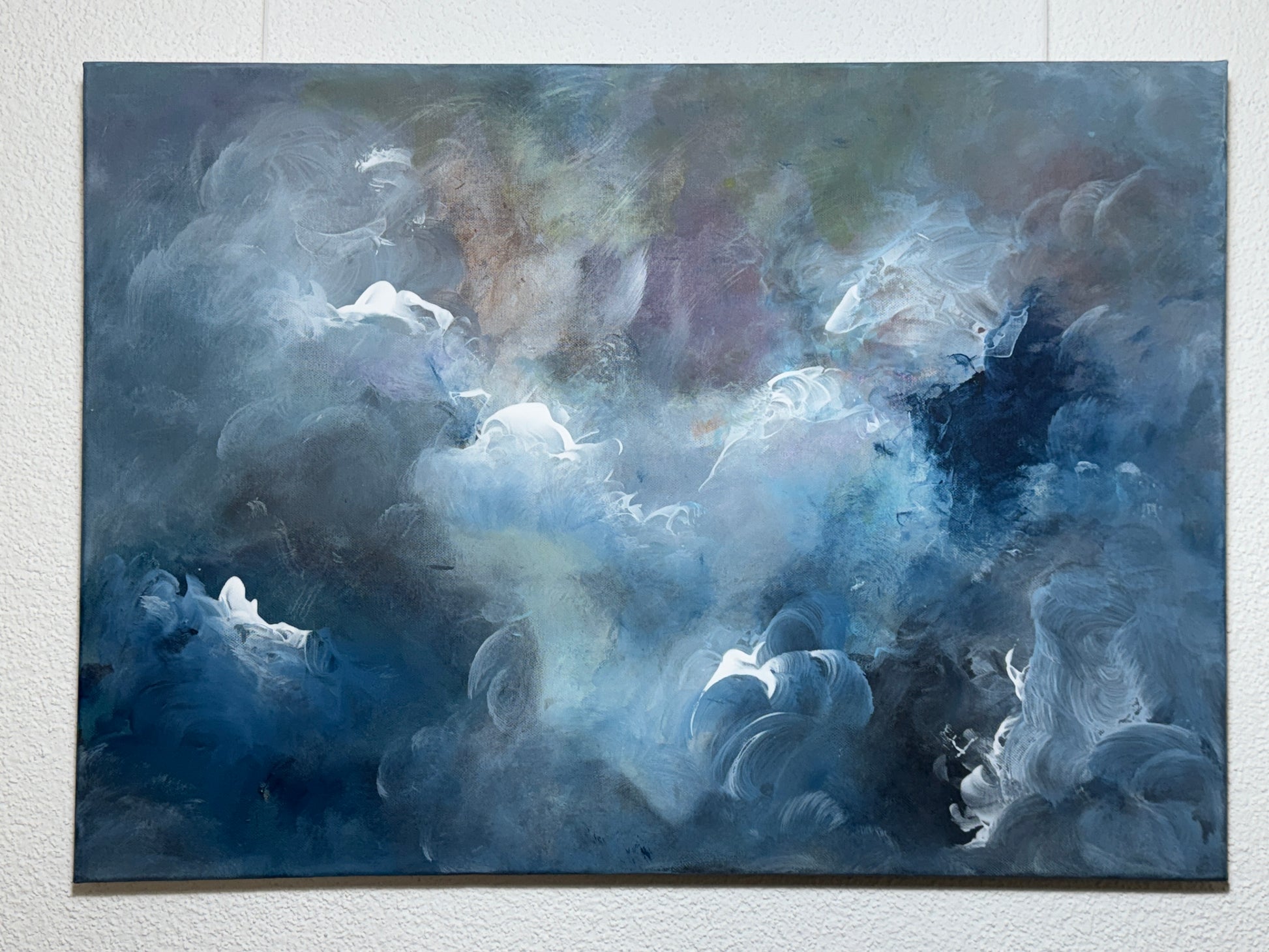 Dieses Werk ist eine Einladung, sich in den unergründlichen Weiten des eigenen Inneren zu verlieren. Die Nebel, die sich über die Leinwand ergießen, erinnern an die Schleier der Erinnerung, an Gedanken, die sich zwischen Klarheit und Vergessen bewegen. In den tiefen Blautönen liegt die Schwere des Unausgesprochenen, während die sanften Lichtströme wie leise Versprechen durch die Dunkelheit dringen.