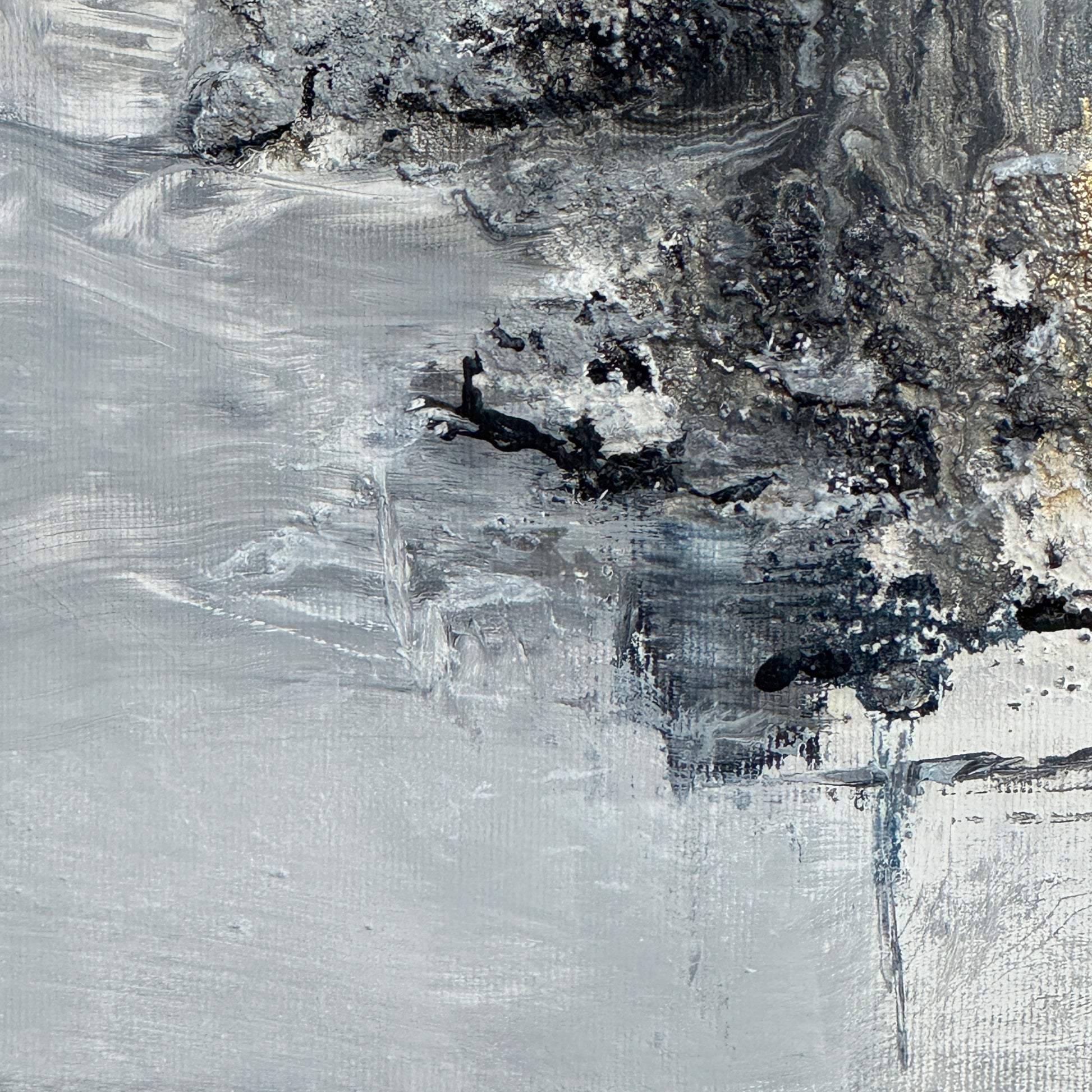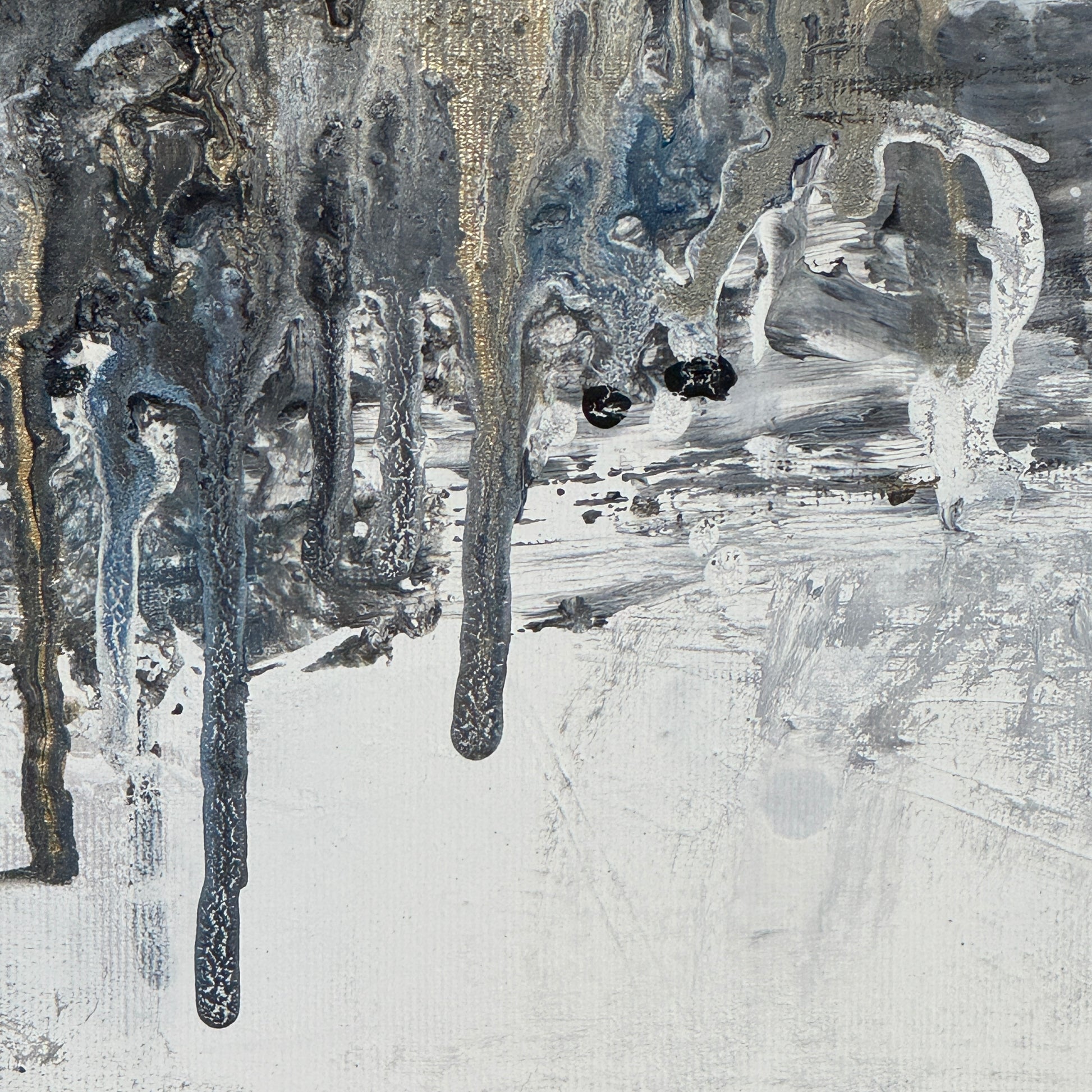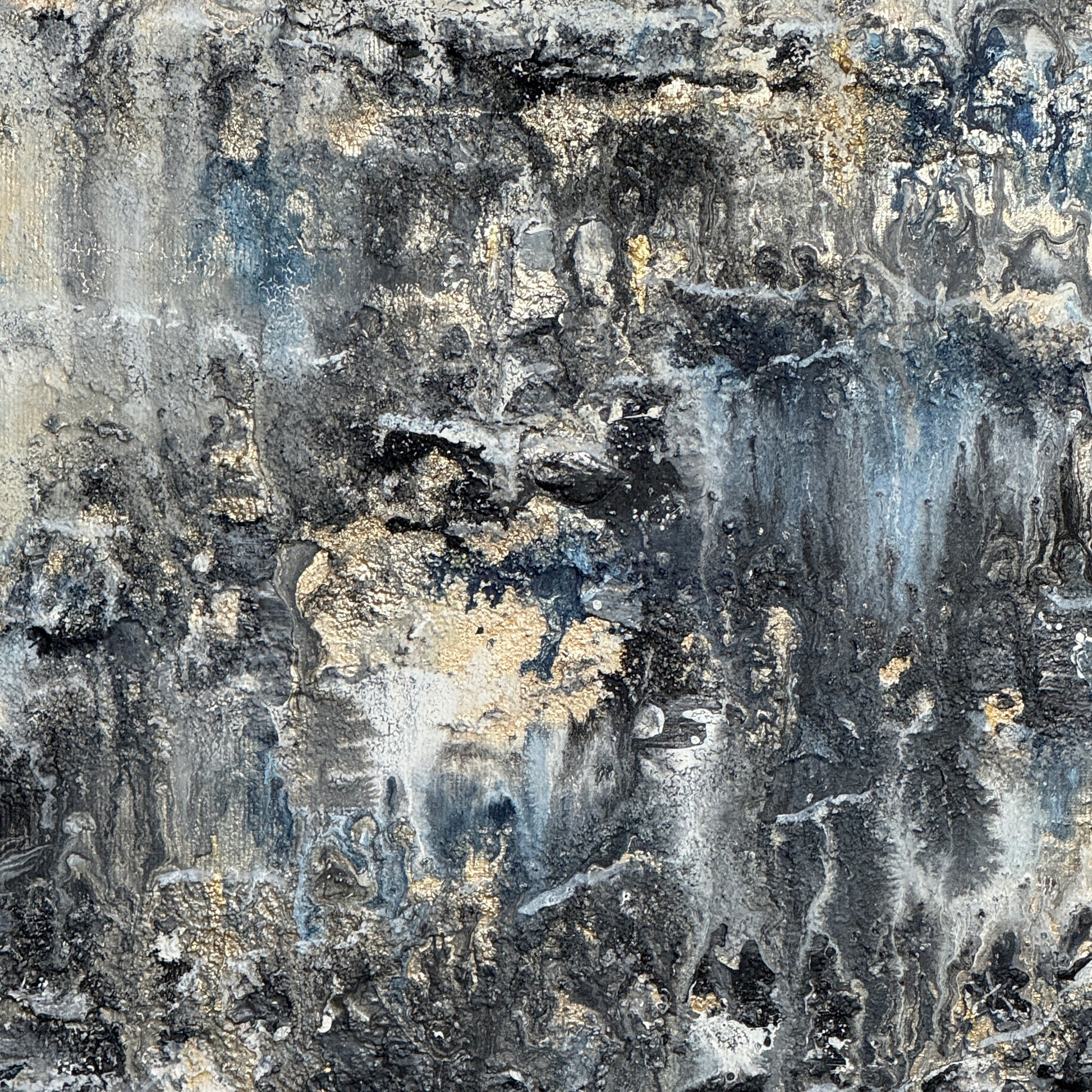 Die zarten Farbübergänge aus Grau, Weiß und schimmernden Gold- und Blautönen erinnern an eine ferne, unberührte Landschaft, die sich dem Betrachter nur in Andeutungen zeigt – wie eine Erinnerung, die langsam zu verblassen scheint.