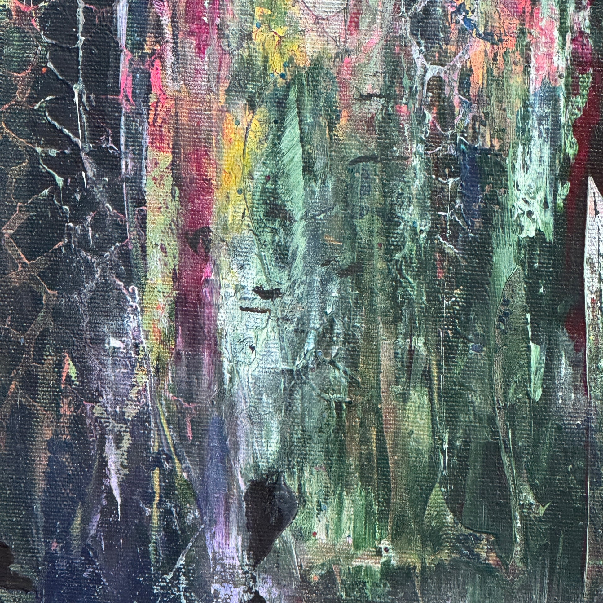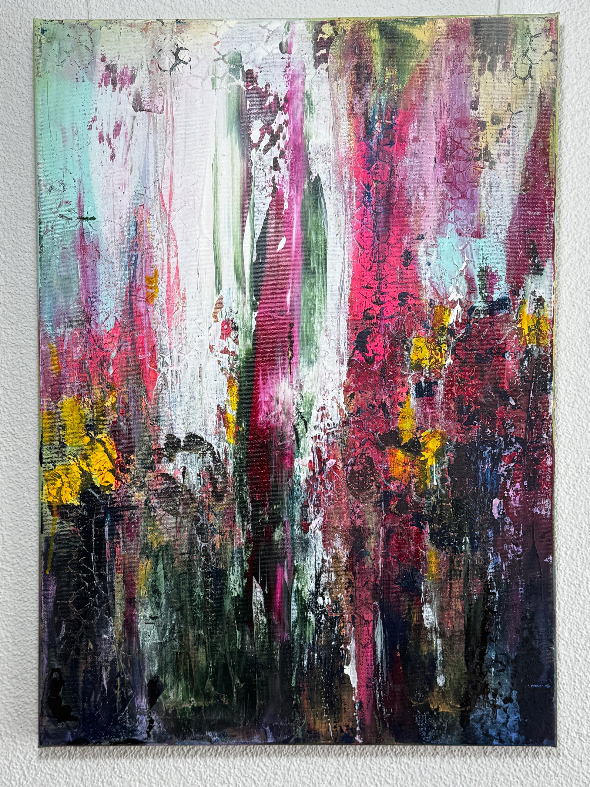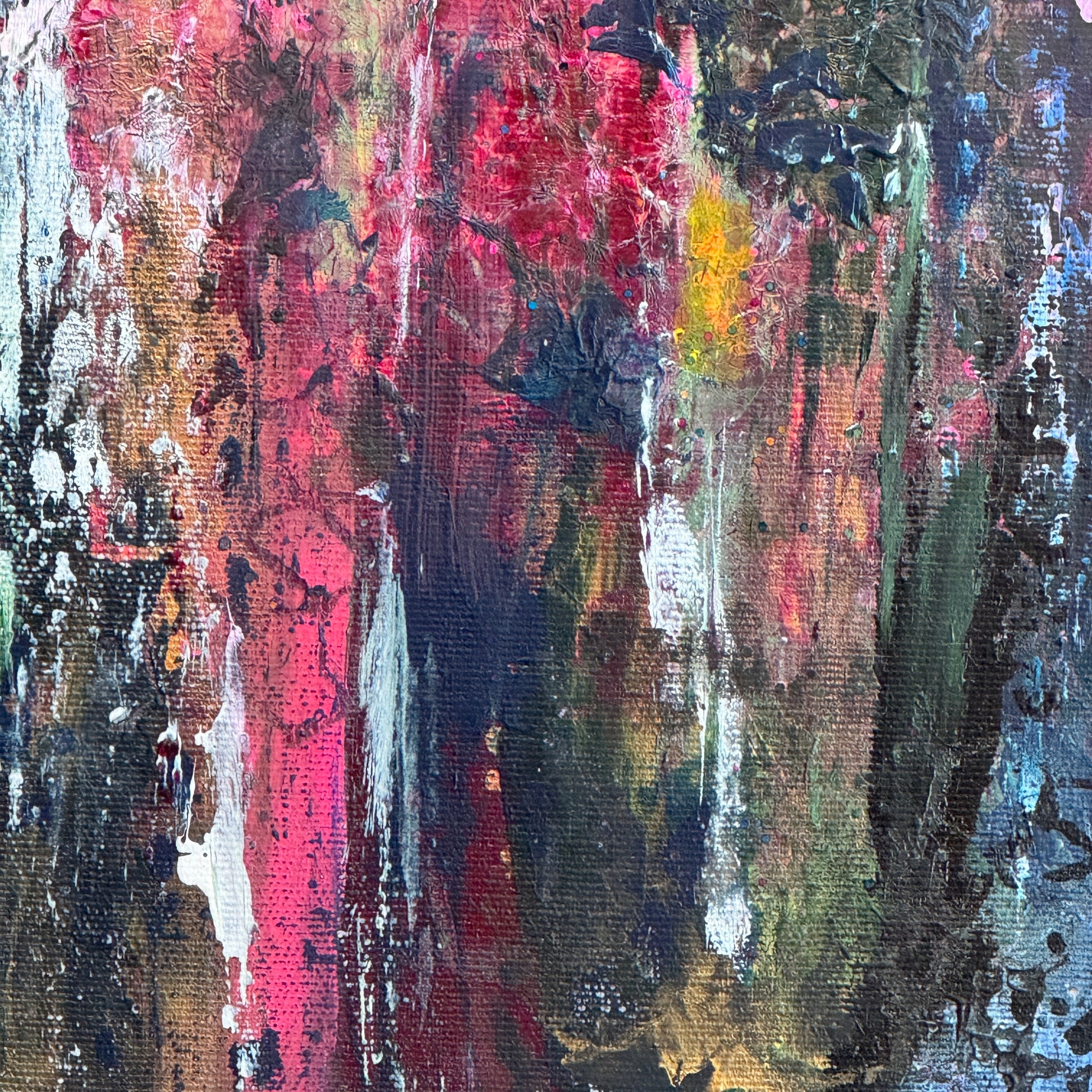 Dieses Gemälde lädt dazu ein, in eine geheimnisvolle Welt einzutauchen – einen Ort, an dem sich Natur und Traum sanft verweben. Leuchtende Farbtupfer in warmem Rot, zartem Rosa und sonnigem Gelb durchbrechen den dunklen, geheimnisvollen Grund wie verborgene Blüten in einem verwunschenen Garten.
