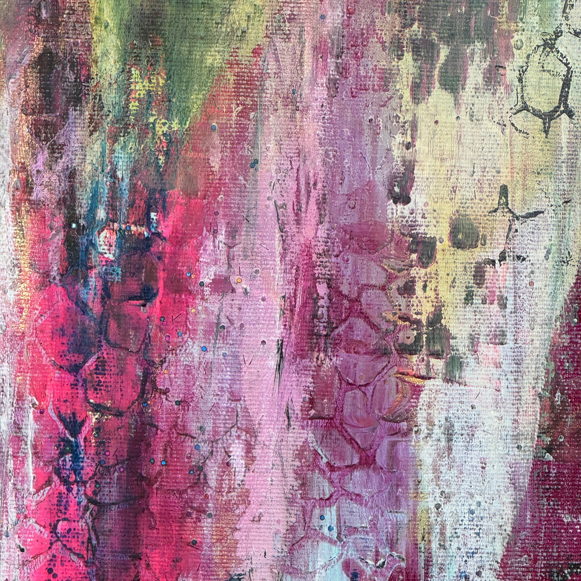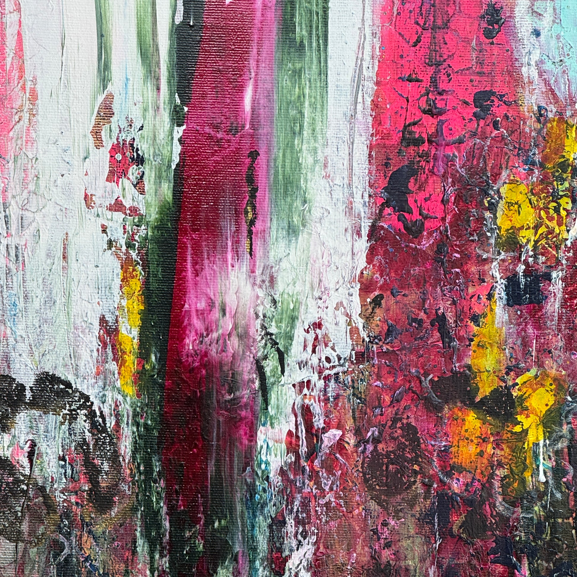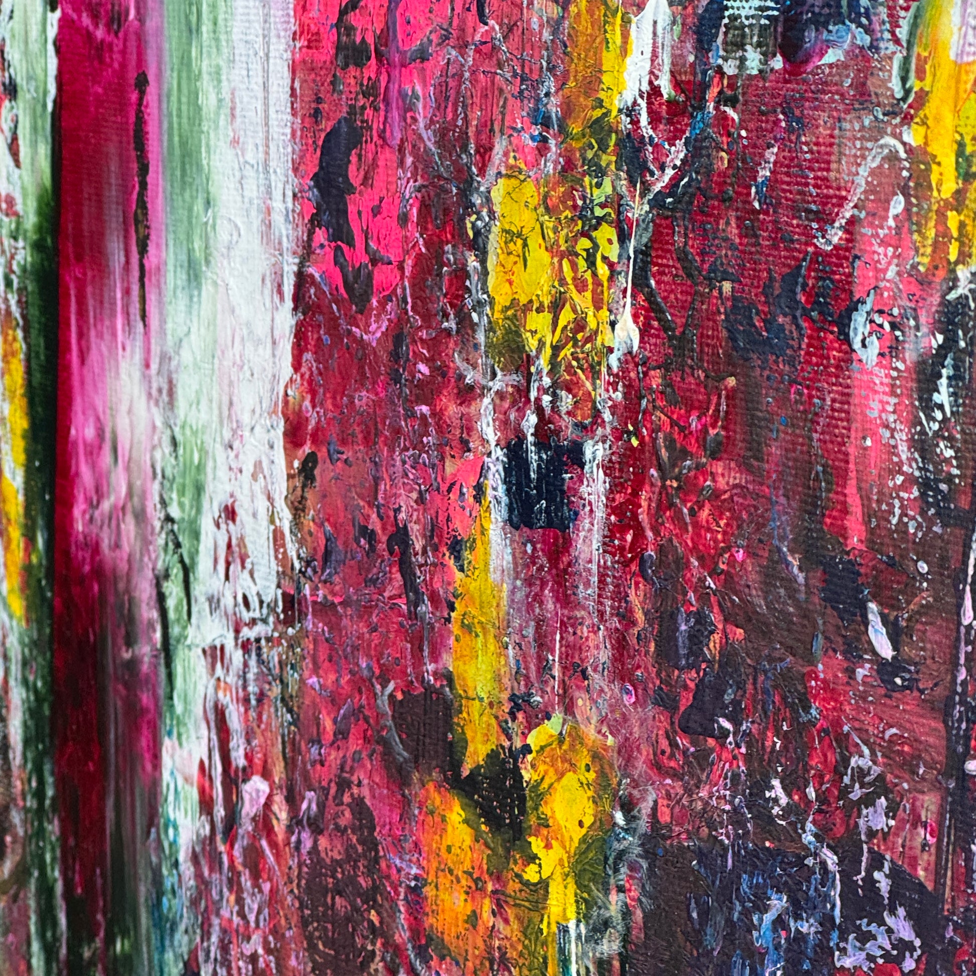 Dieses Gemälde lädt dazu ein, in eine geheimnisvolle Welt einzutauchen – einen Ort, an dem sich Natur und Traum sanft verweben. Leuchtende Farbtupfer in warmem Rot, zartem Rosa und sonnigem Gelb durchbrechen den dunklen, geheimnisvollen Grund wie verborgene Blüten in einem verwunschenen Garten.